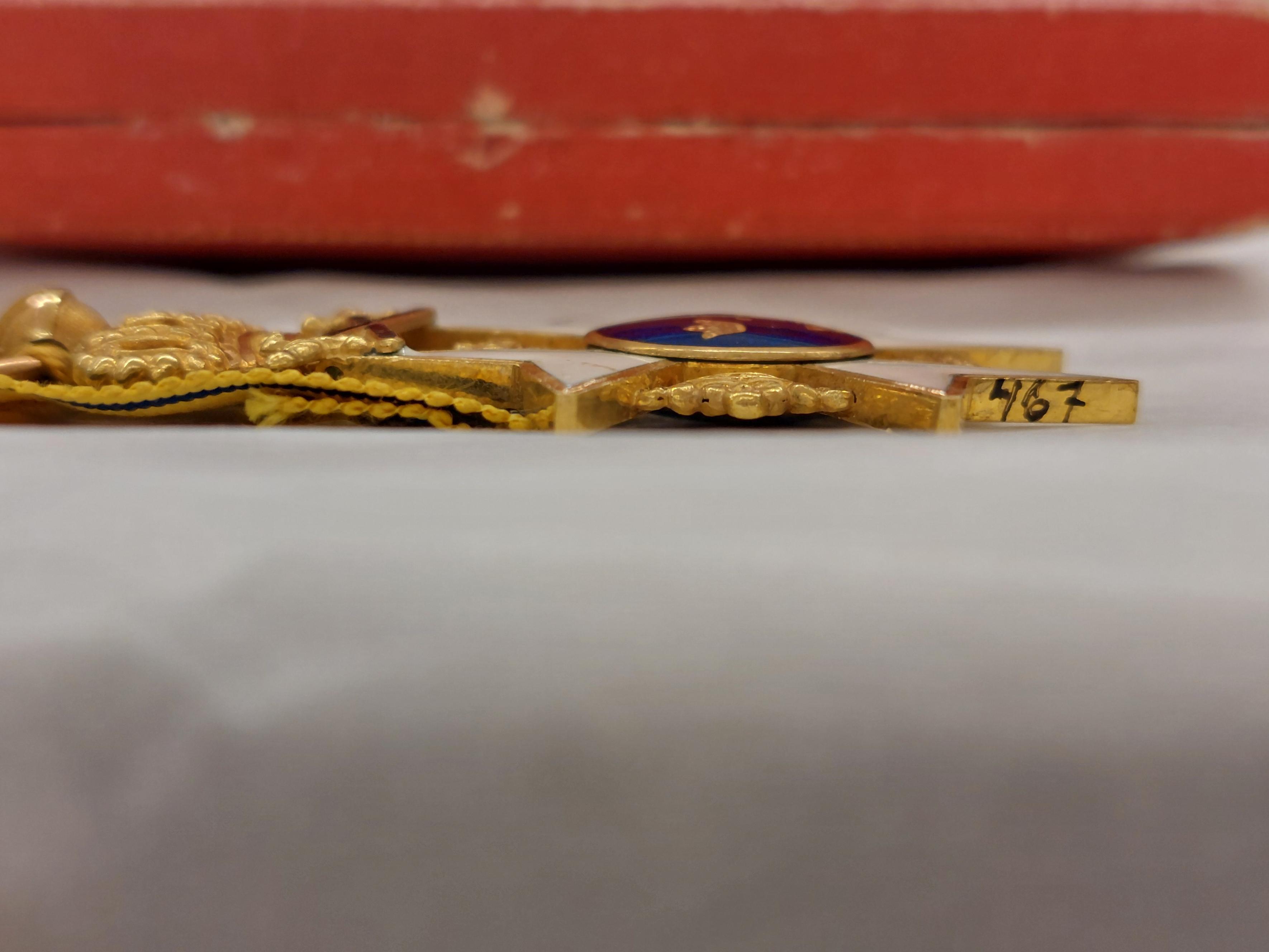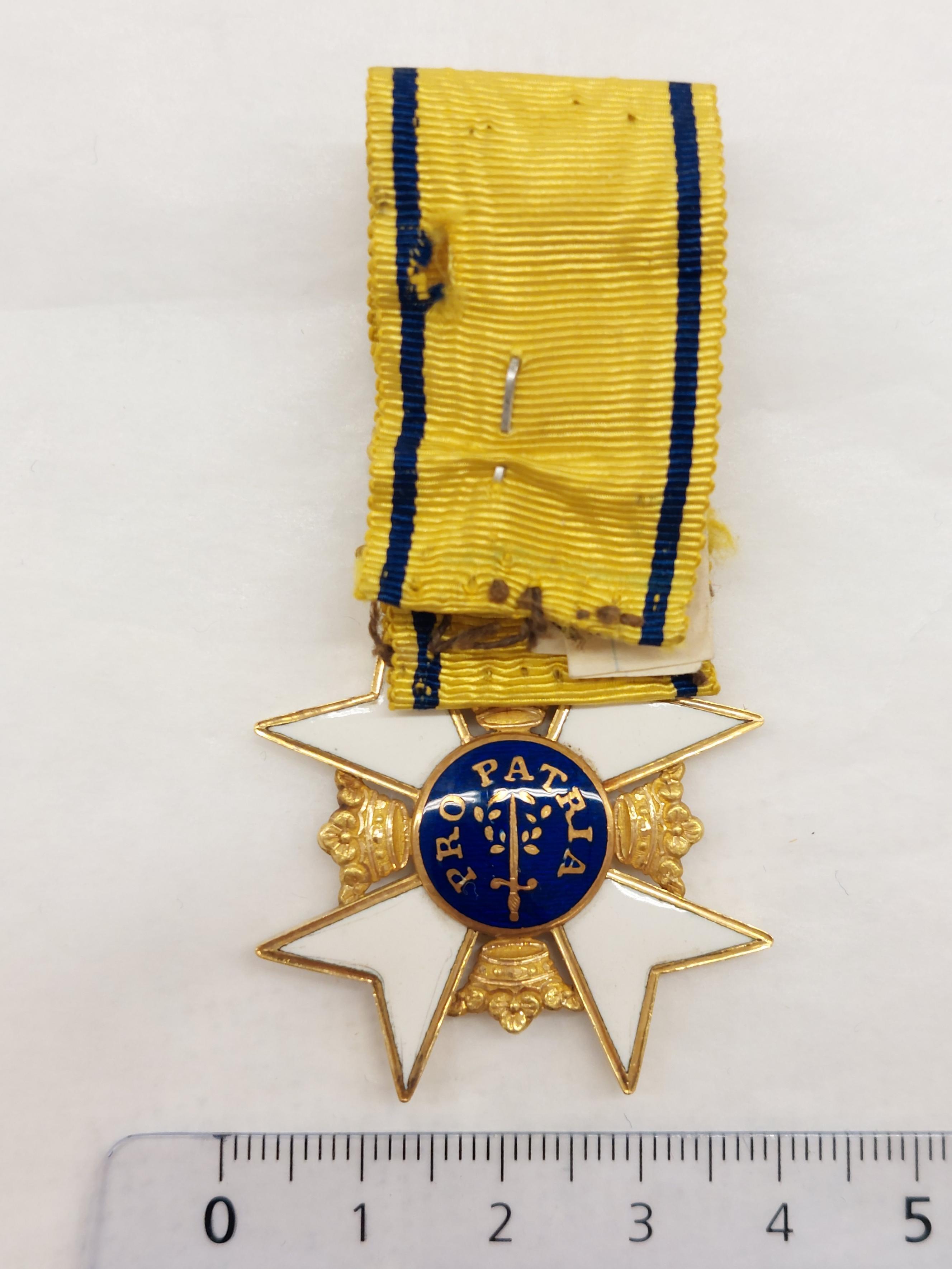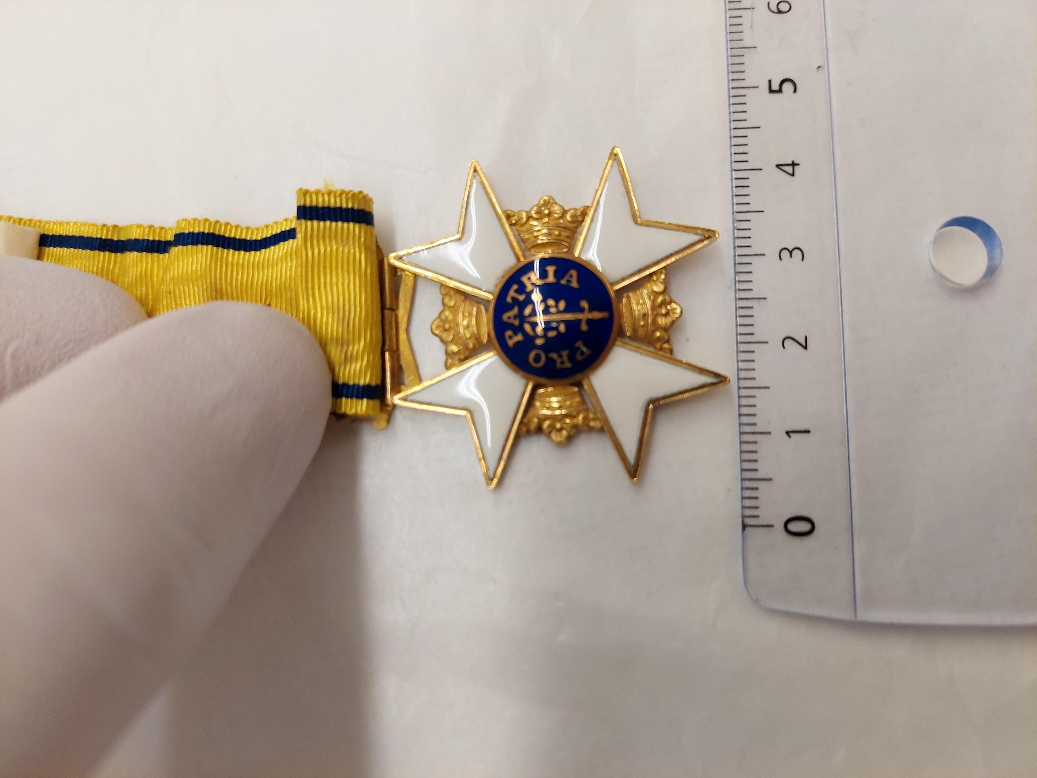 Vitemaljerat, liggande malteserkors av guld, inga kulor på spetsarna. Kronan fäst på scharner mellan de övre korsarmarnas spetsar, igenom äpplet draget en ring. Ringen och kronan fastsydda vid ordensband.