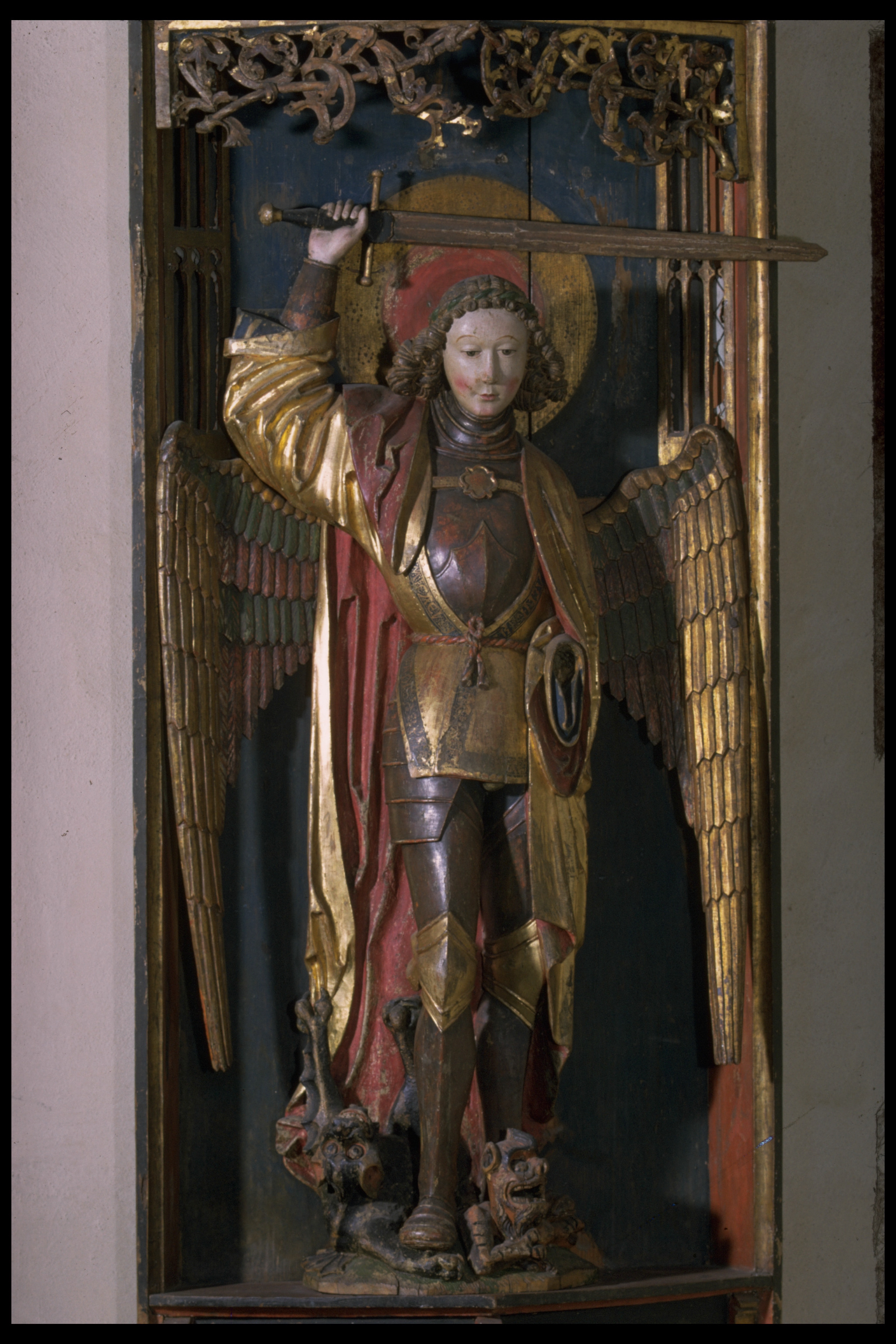 skulptur av lövträ, skåp av furu. Kondition: god, vänster hand förlorad. Färg: välbevarad.