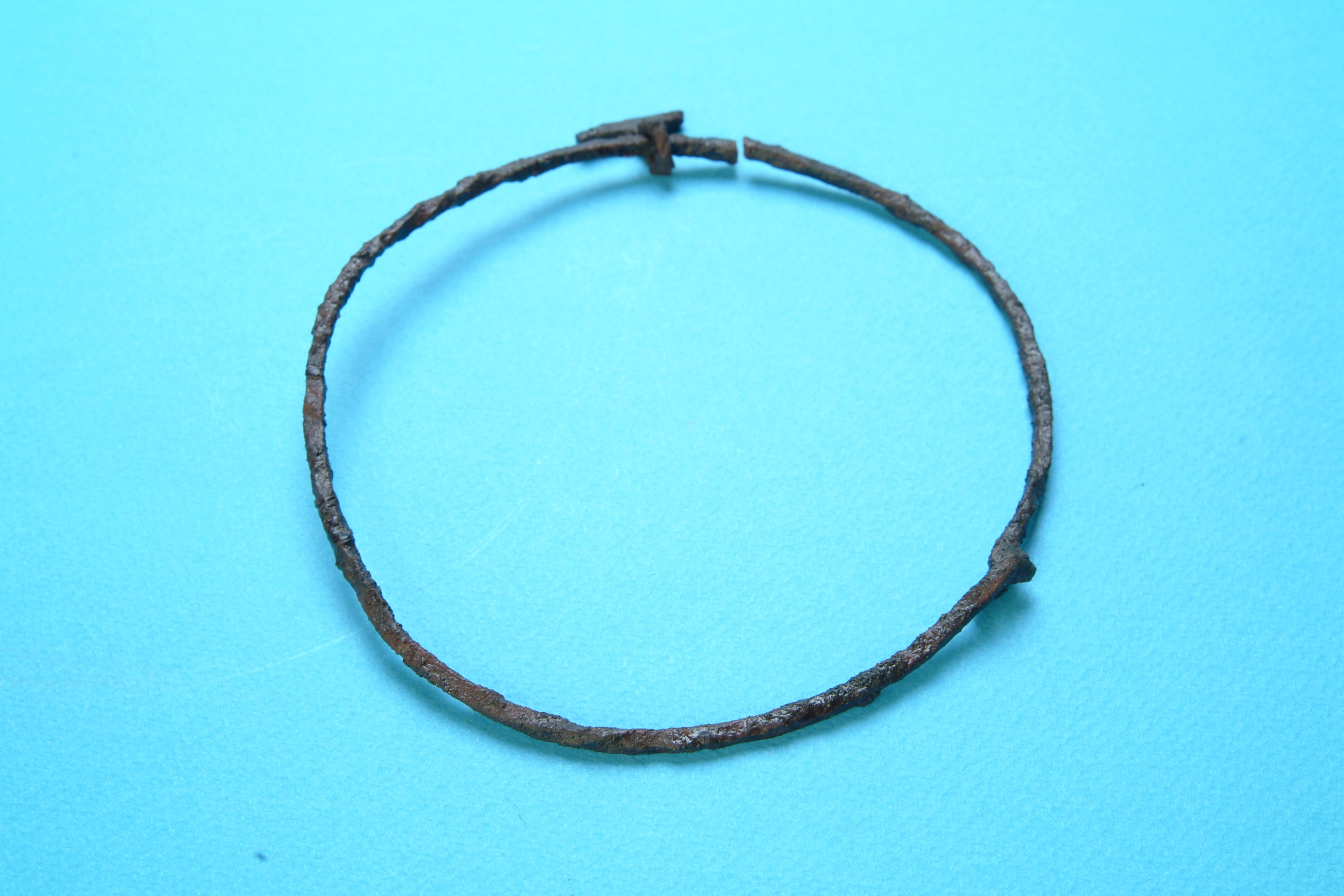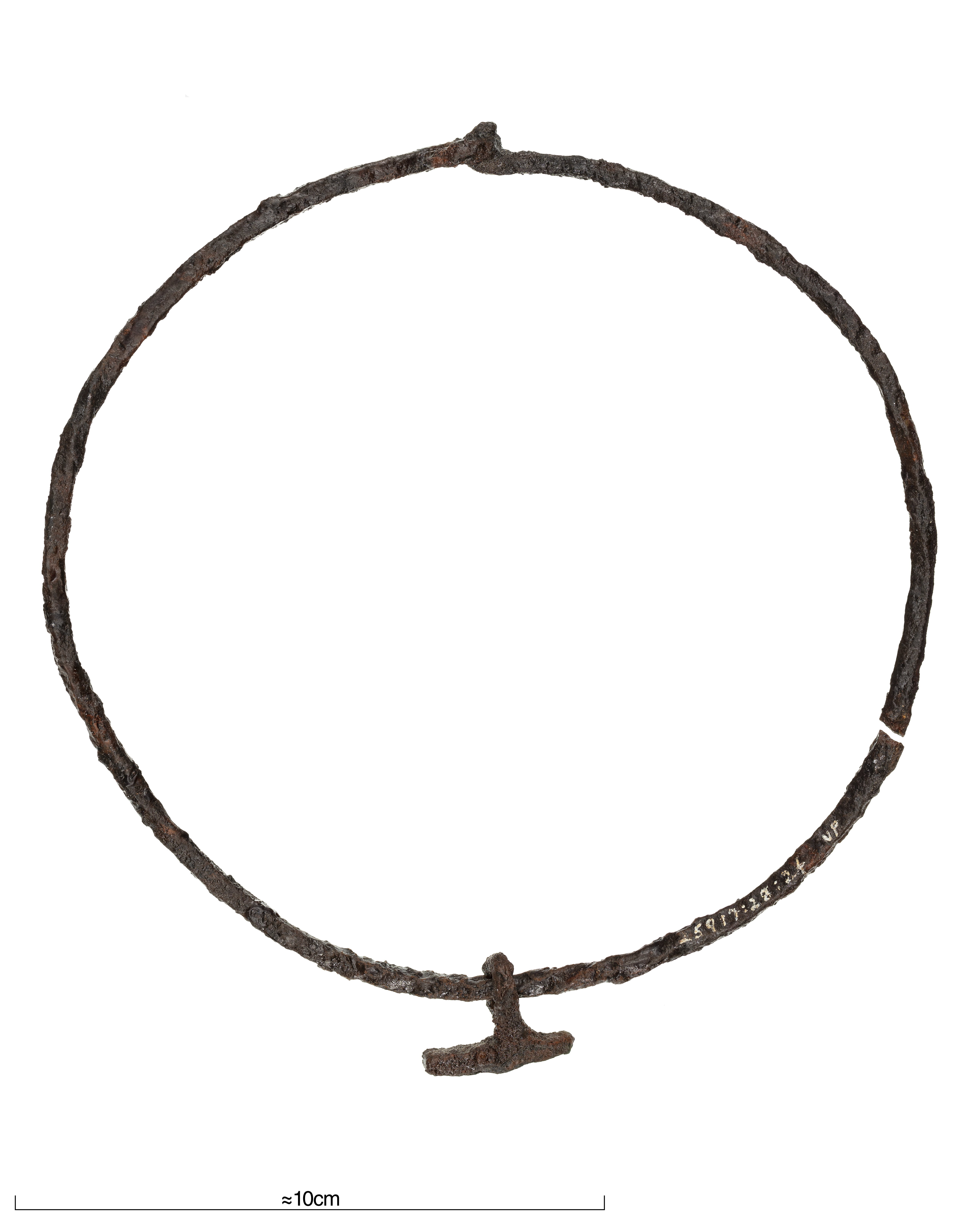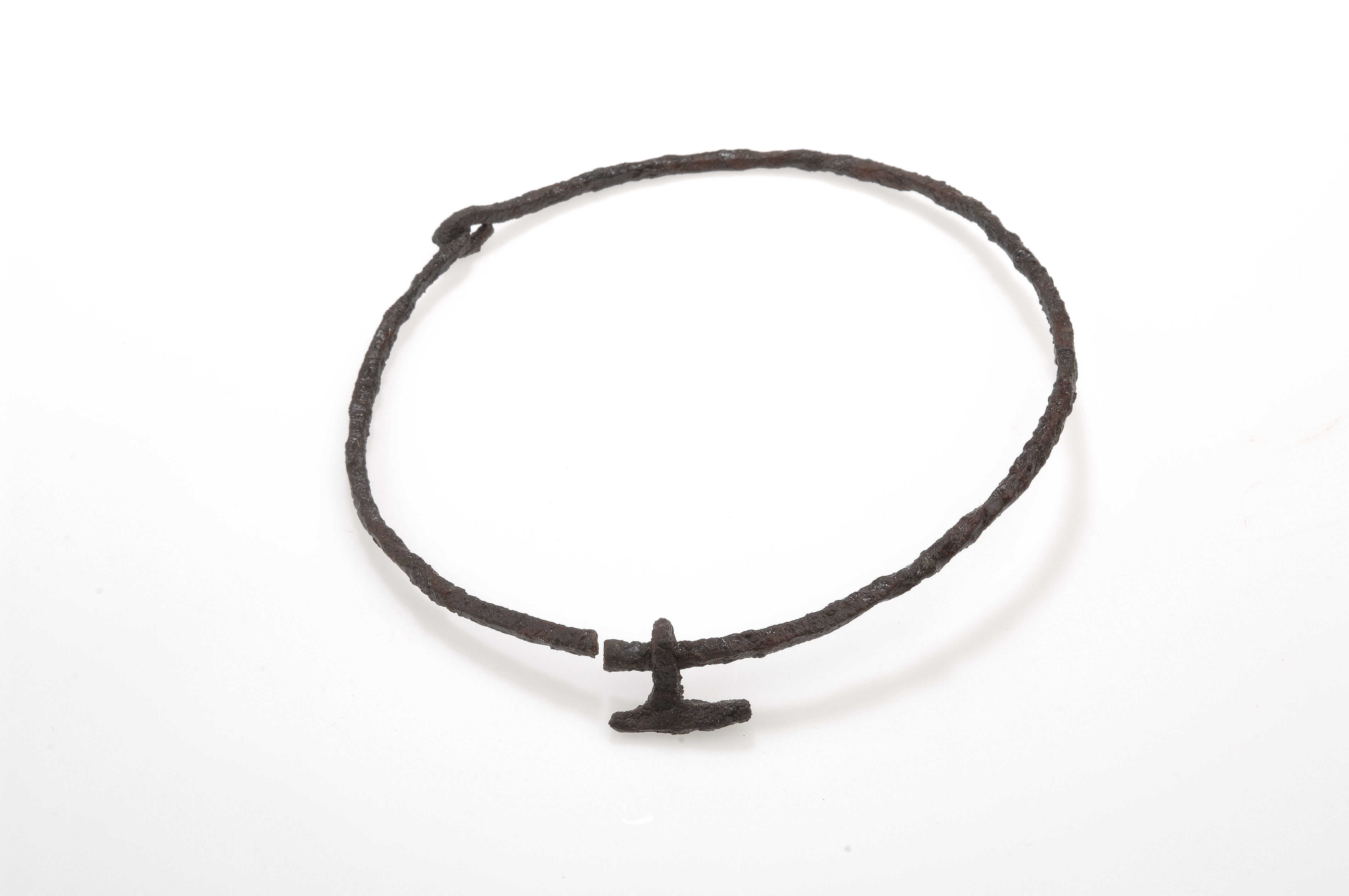 Amulettring/Torshammarring av järn. Av fyrsidig , delvis vriden ten med ändarna hakade i varandra. På ringen ett hänge i form av en hammare.