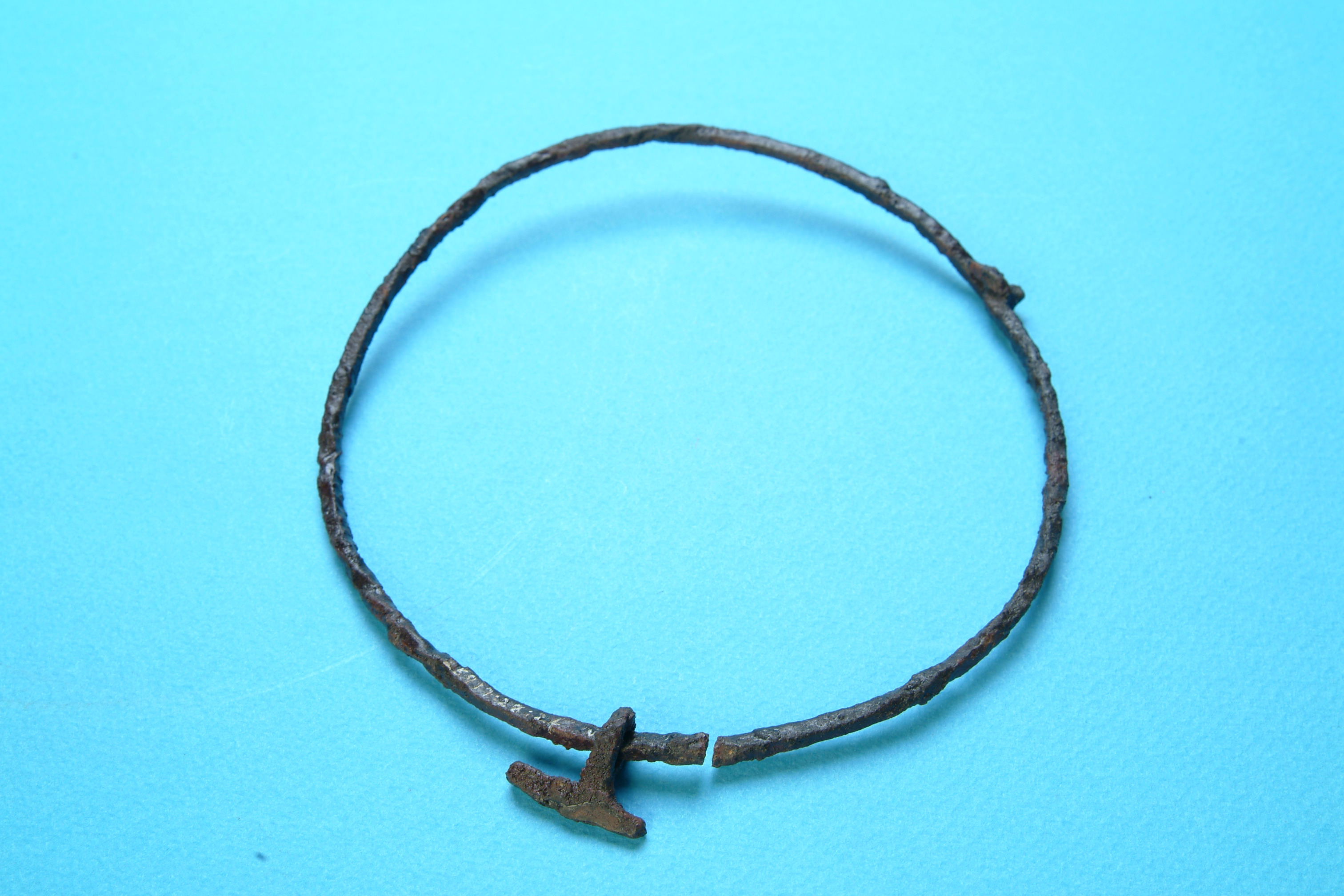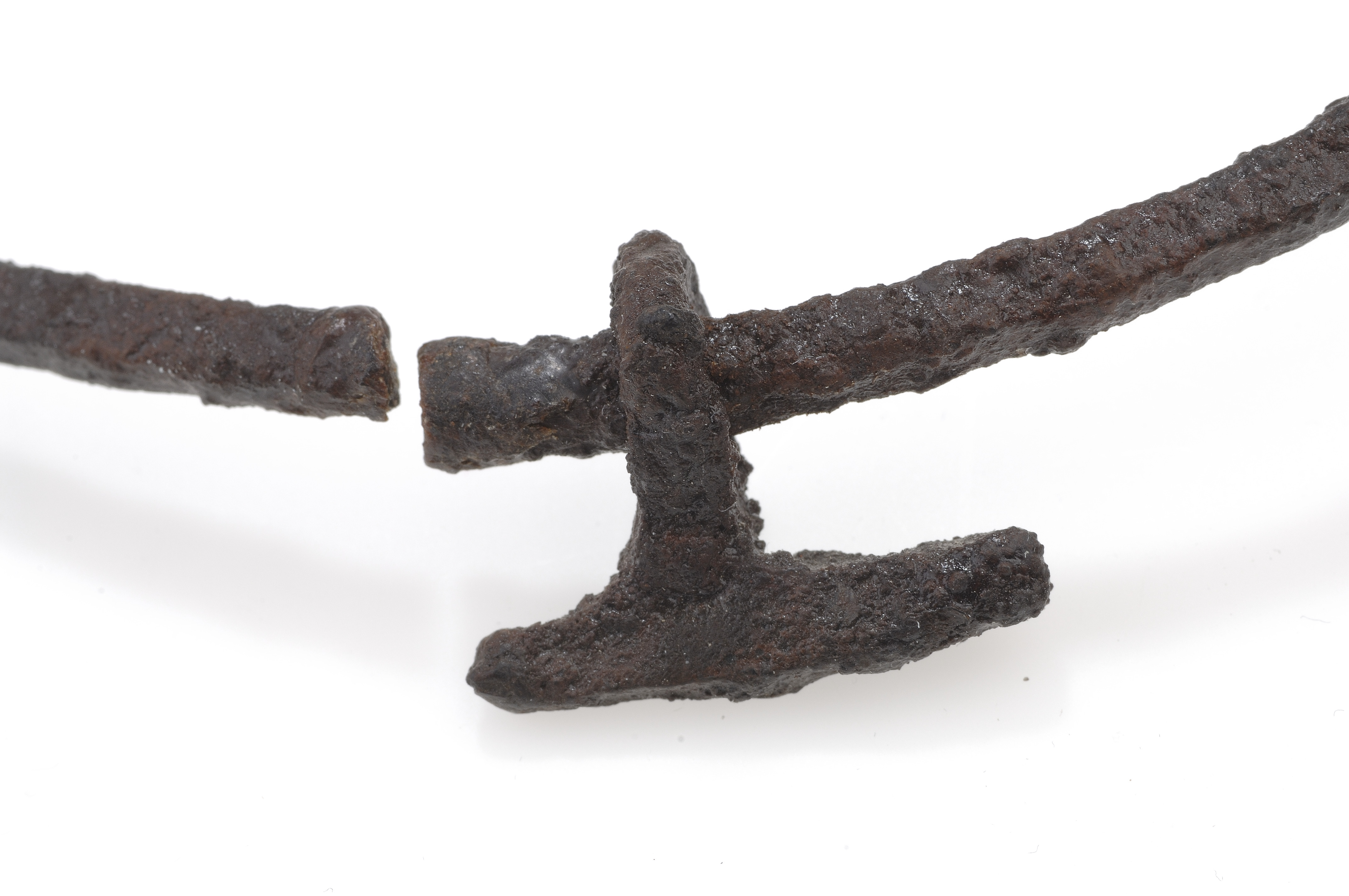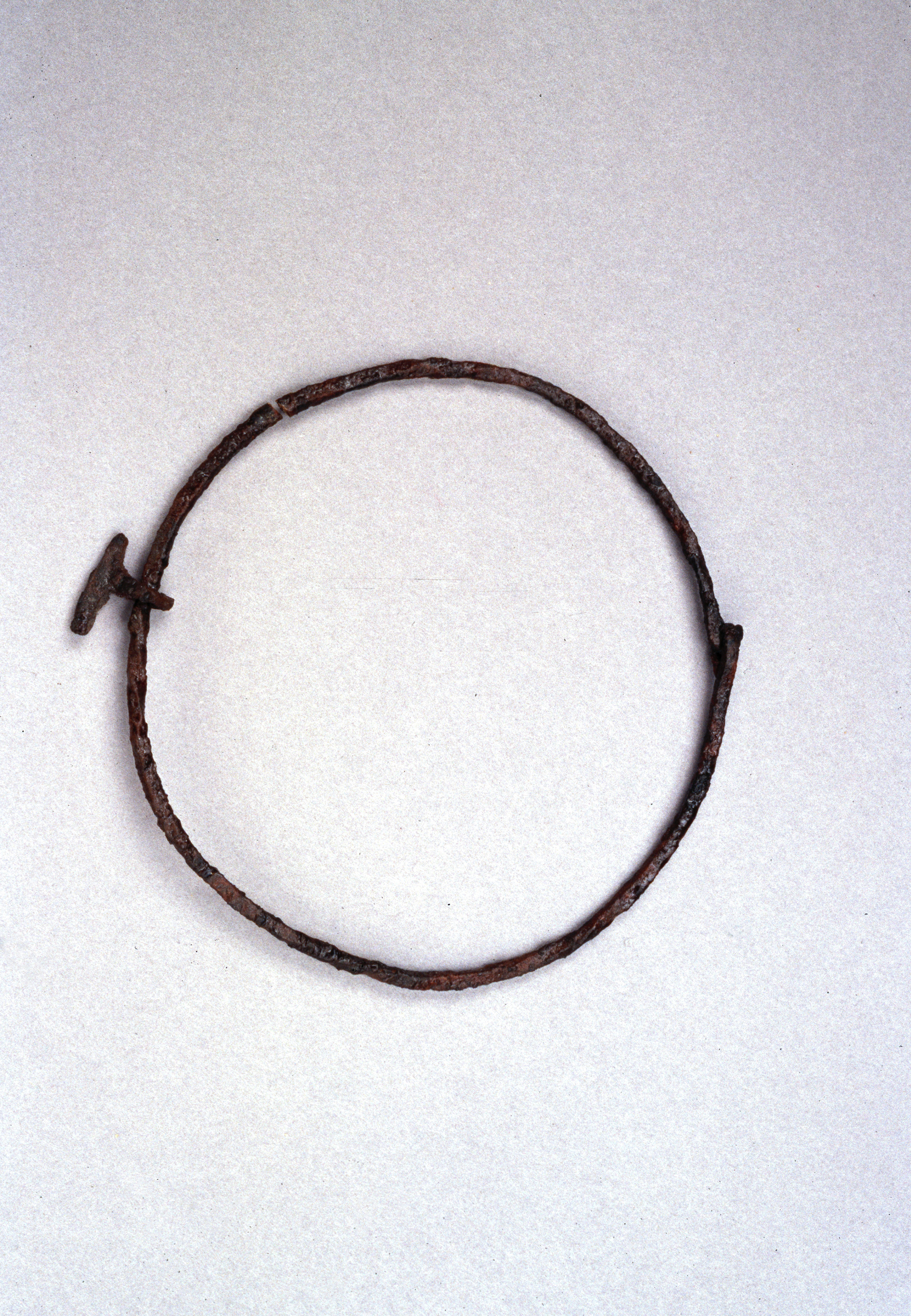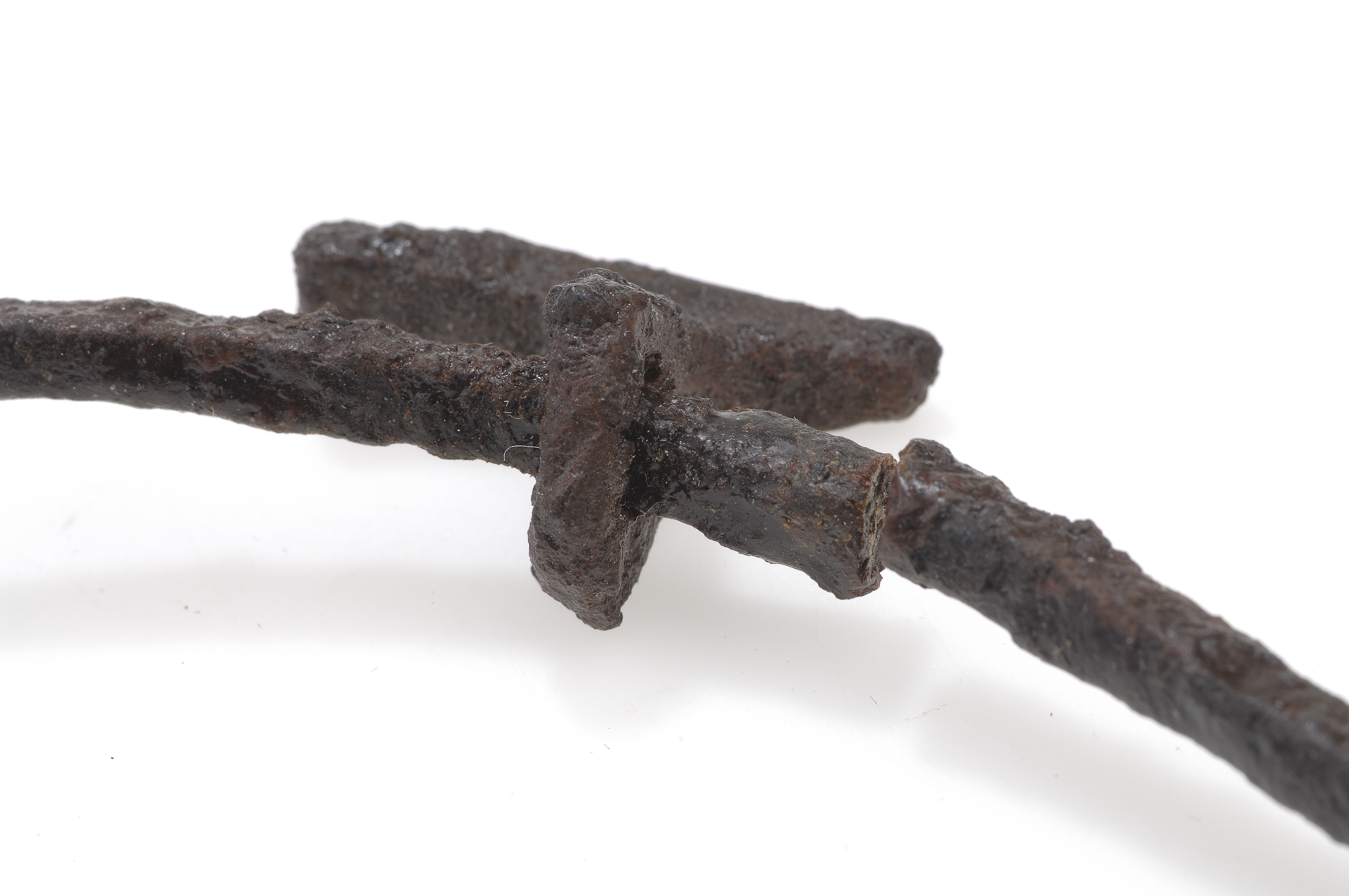Amulettring/Torshammarring av järn. Av fyrsidig , delvis vriden ten med ändarna hakade i varandra. På ringen ett hänge i form av en hammare.
