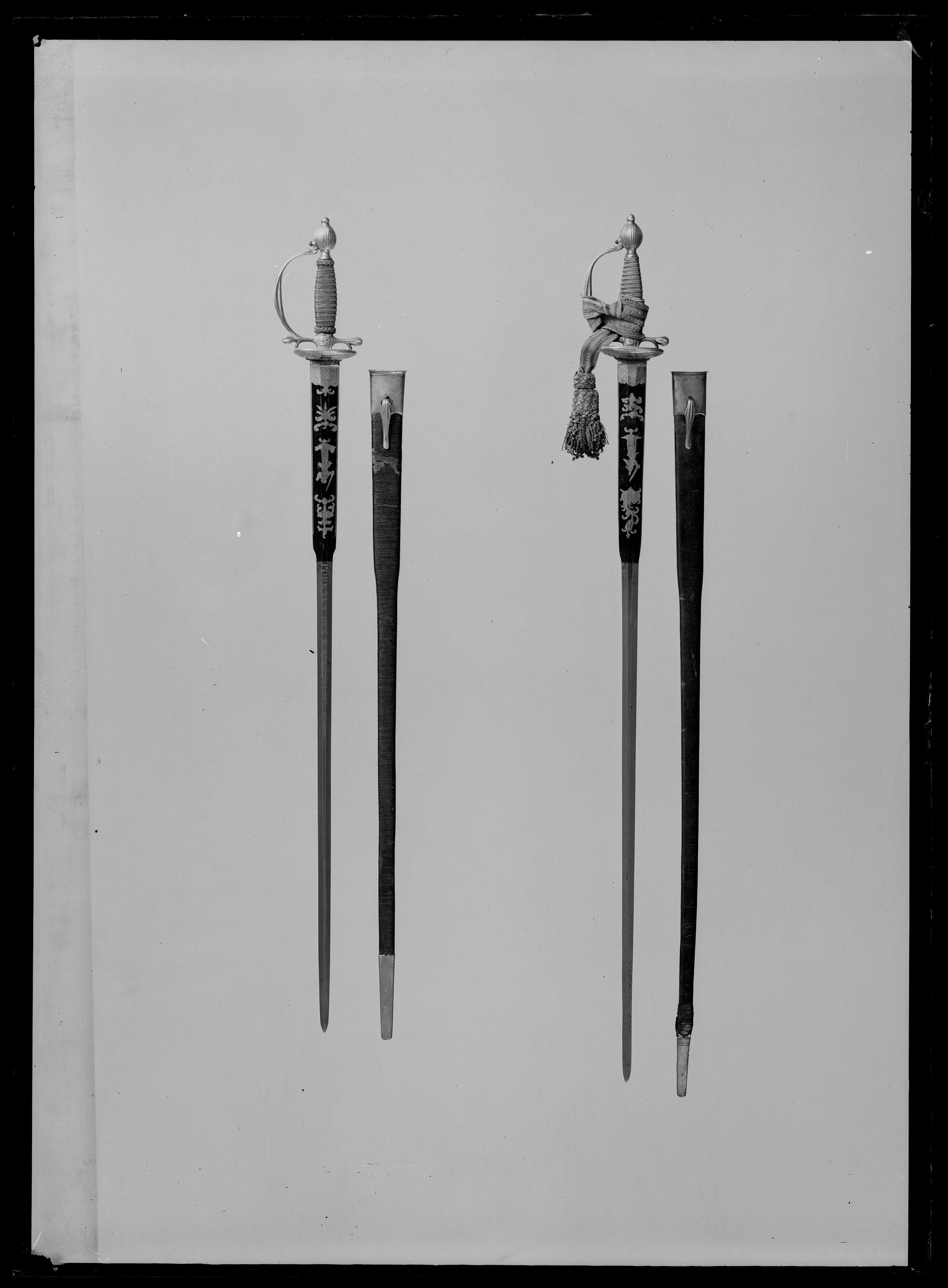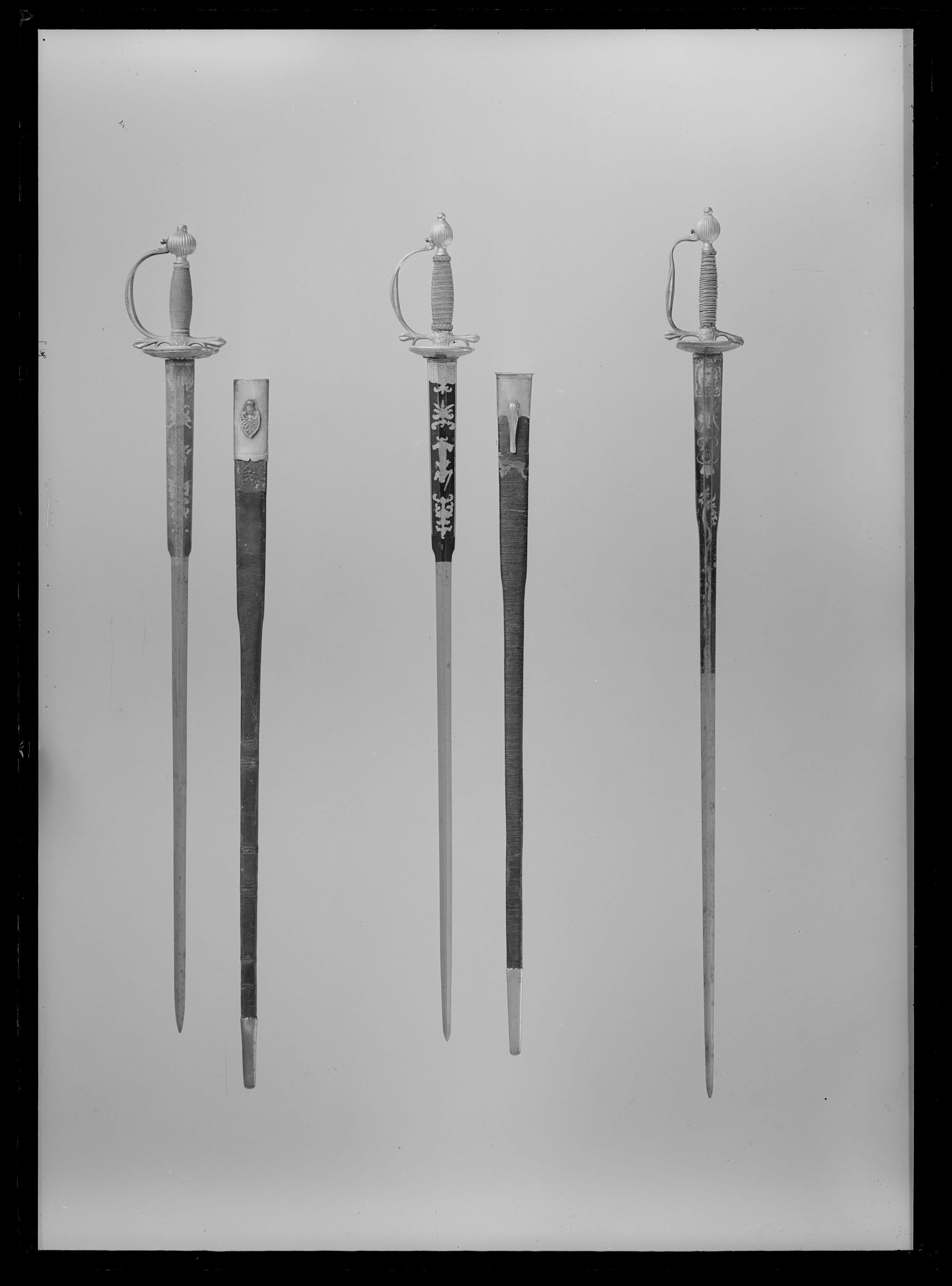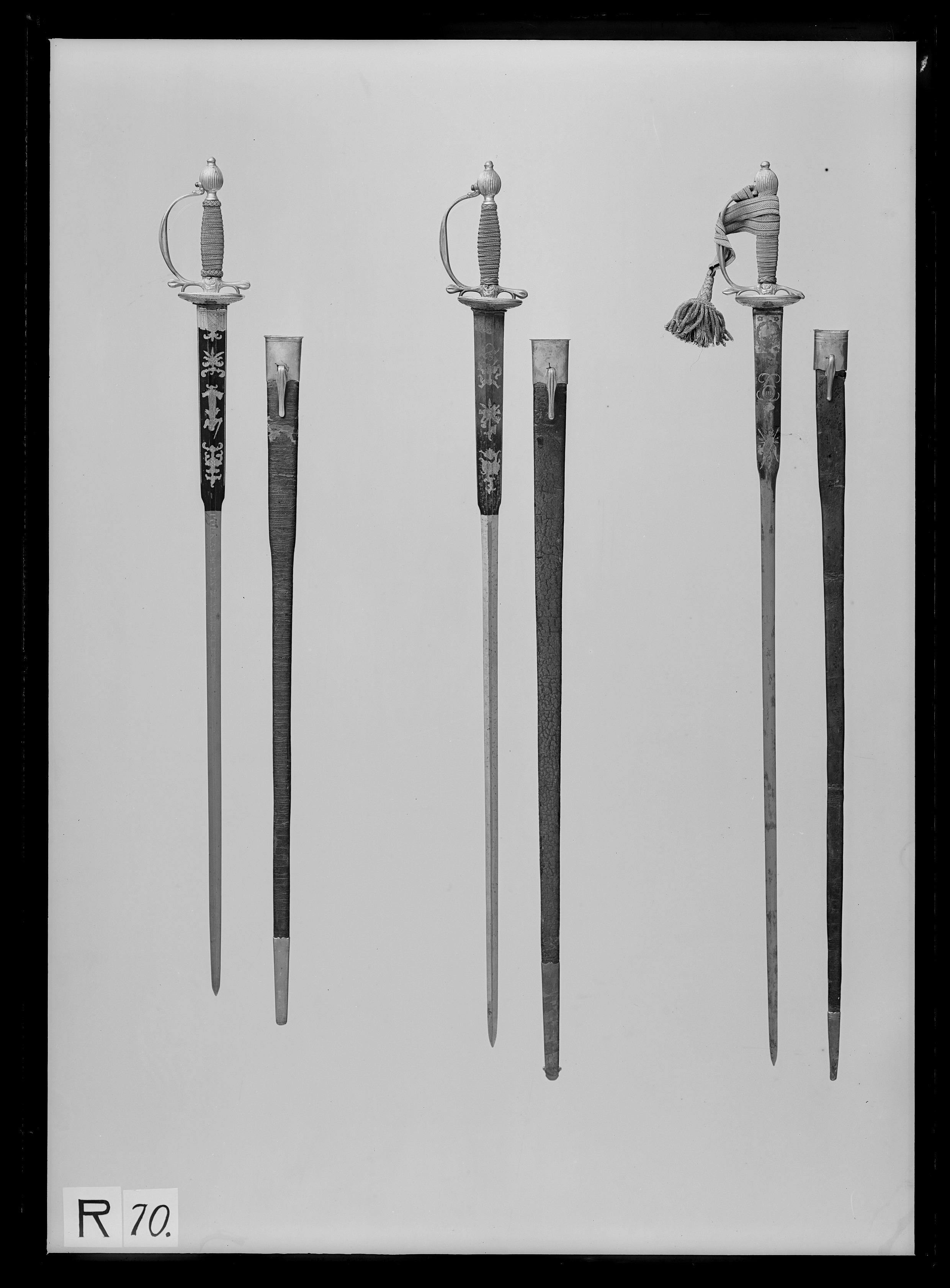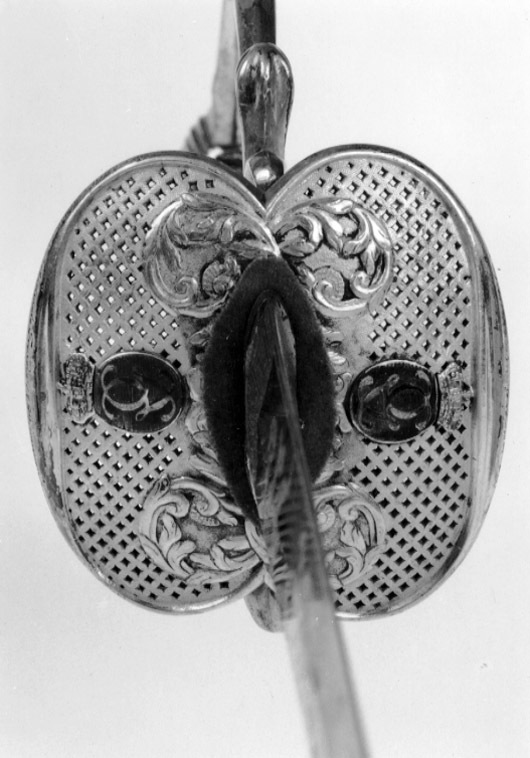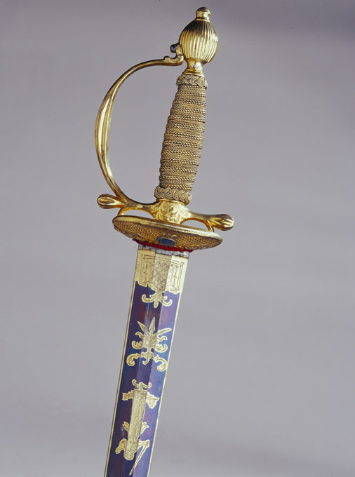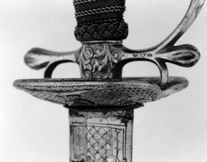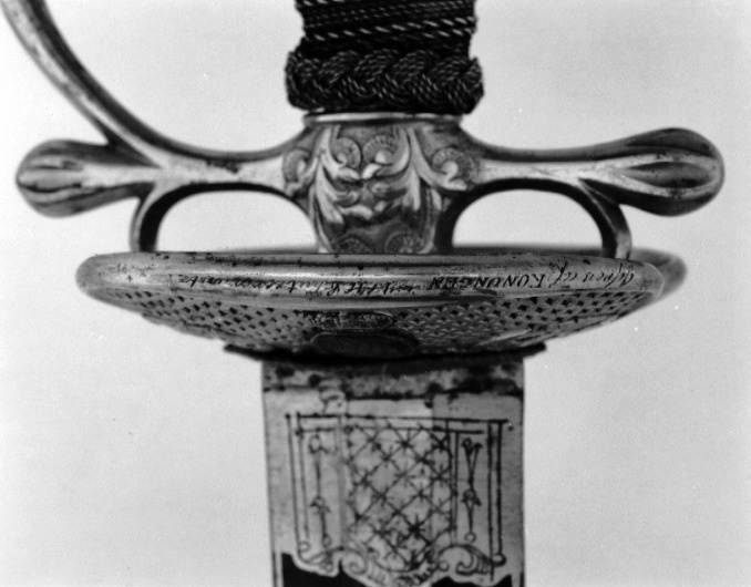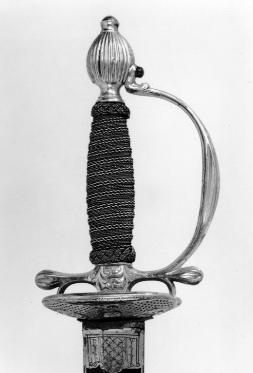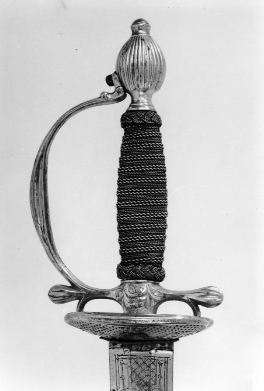 Fäste av förgyllt silver med yttre och inre parerplåt genombrutna med akantusdekor. Korta raka parerstänger med päronformad räfflad ytterändar. Handbygeln fäst vid knappen med skruv. Oval tillplattad knapp med 25 räfflor. Nitknapp olivformad tryckt från in- och utsidan. På främre parerstångens insida, kontrollstämpel med tre kronor, två otydliga stämplar och G2= årtalet 1789. På båda parerplåtarnas över- och undersida emaljerade blå ovaler med förgyllt spegelmonogram G, krönt av kunglig krona. I kanten på parerplåtarnas utsida: " Gifven af KONUNGEN till J. H. Schützercrantz För visad Mandom mot Rikets Fiender 1789, under Kriget mot Ryssland " (Johan Herman Schützercrantz 1762-1821). Kaveln lindad med grövre och finare tvinnad och förgylld silvertråd. Upptill och nedtill flätade kransar av samma material. Klinga rak, tvåeggad, sexkantig s k colichemardklinga. Den breddade starka delen blånerad med etsad och förgylld dekor på båda sidor. Dekor i form av rankverk. På utsidan i mitten kvinnlig gestalt i lång dräkt med draget svärd i handen. Utmed mitten av klingans utsida efter blåneringen etsat: " PORKALA DEN 28 AUGUSTI 1789 " Gåva av framlidne ståthållaren Johan Herman Schützercrantz (1796-1860) enl. rapport 18610629. Har tillhört fadern, Konteramiral Carméns flotta Johan S. (1762-1821).