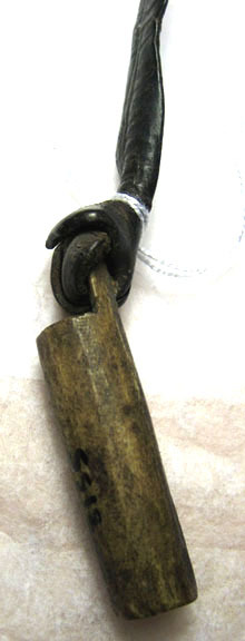 Krutmått tillverkad ur ett cylindriskt stycke horn. I ena änden borrad ihålig till ett djup av 28 mm, i andra änden avfasning med genomborrat hål och läderrem, l 125 mm, fäst i kruttyget.