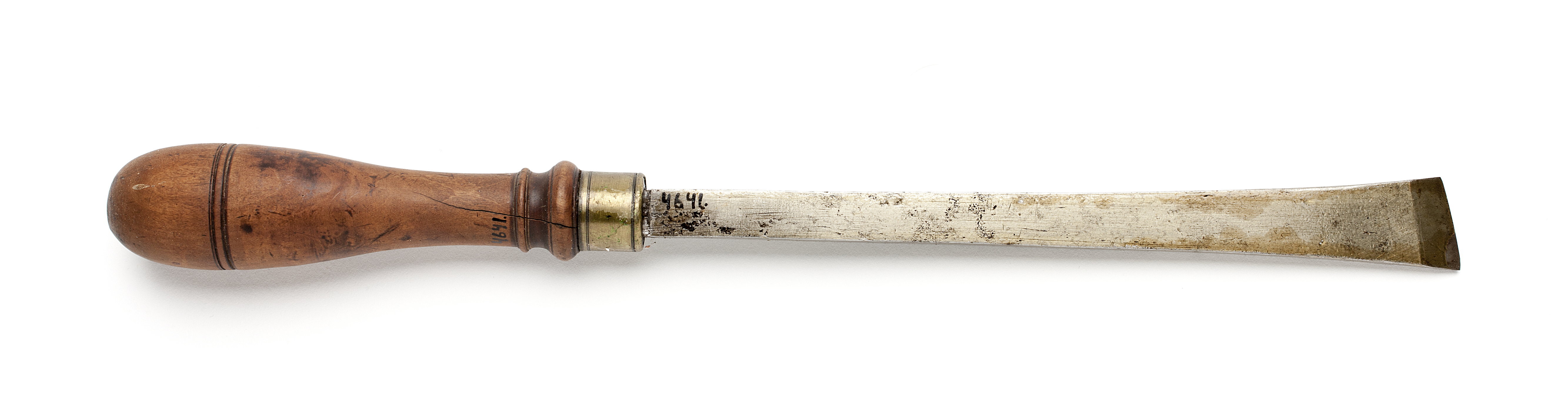 Klinga med rektangulär genomskärning. Sned egg. Svarvat skaft av päronträ med två vulster nedtill ("skoklostertyp"). Mässingsring. Stämpel på skaftets ände vid fästet: två otydliga siffror.
