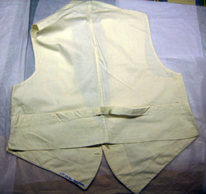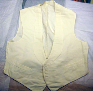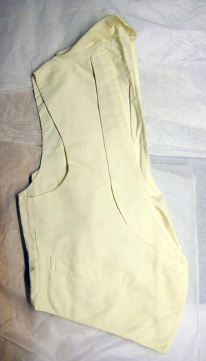 Frackväst av vit bomullspiké med sjalkrage. Bakstycke och foder är av vit bomull. Knäppning mitt fram bestående av fyra små tränsade hål för fäste av knappar, och med motsvarande knapphål. Det förekommer små sprund i sidsömmarna, l. 26 mm. På vardera framstycke är placerat en horisontal, iskuren ficka, l. 140 mm, med en kantslå, b. 25 mm. På bakstycket är i nederkanten påsytt två slejfer varav det på den ena sitter ett knapphål och en söndrig knapp. Knappen är rund och klädd med vit bomullstråd.