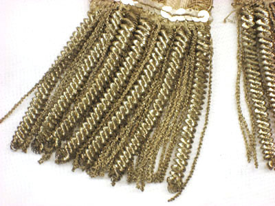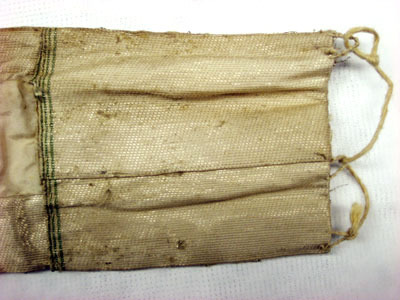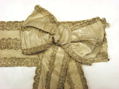 Skärp av ripsvävt silvertyg fodrat med atlassiden. Det är dekorerat med en stor 155 mm bred rosett med 90 mm breda rosettband. Rosettbanden är försedda med tre stycken 10 mm breda silverspetsar, paljetter har längst ner buljoner, sju stycken på det ena och fem stycken på det andra. Insidan är fodrad med atlassiden. Skärpet fästs med hakar och hyskor, de sistnämnda i linnetråd.