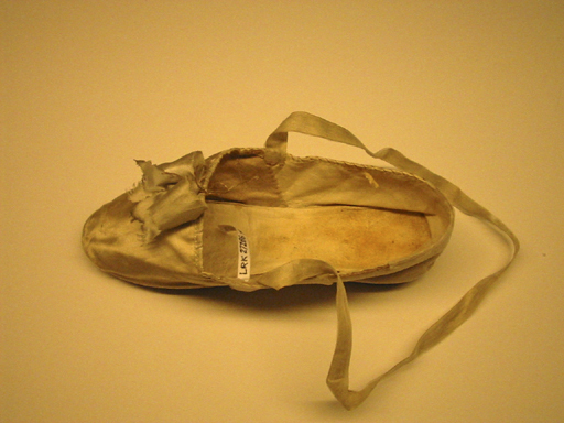 Pumps skuren i ovanläder och bakkappa har sytts samman i sidorna med benvit silke. Skon med något rundad tå har i hälpartiet en kilklack insydd mellan sulorna. Runt öppningen finns en 3 mm bred dragsko av benvit siden med ifört tunt snöre. Mitt fram är skon dekorerad med en benvit sidenrosett. Ett 12 mm brett benvitt sidenband fastsytt i sidorna. Ovanlädert fodrat med beiget linne, bakkappan med benvitt getskinn ? Innersula av benvit getskinn? Vändsydd yttersula av 2 mm tjockt nötläder. Runt kilklacken finns en randsydd förstärkning. Yttersulan har ett pinnhål under tåpartiet, ett under hålfoten och ett under hälen.