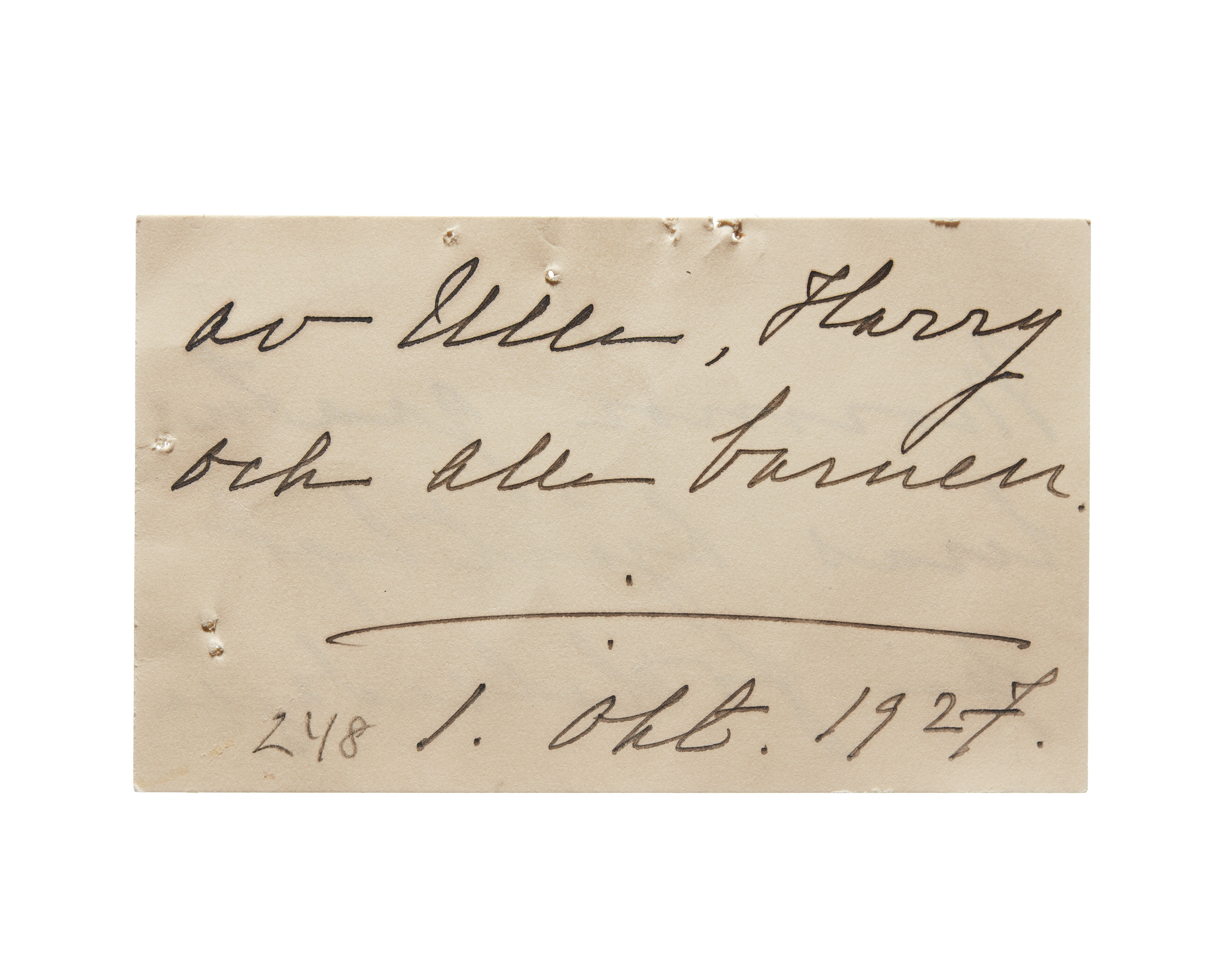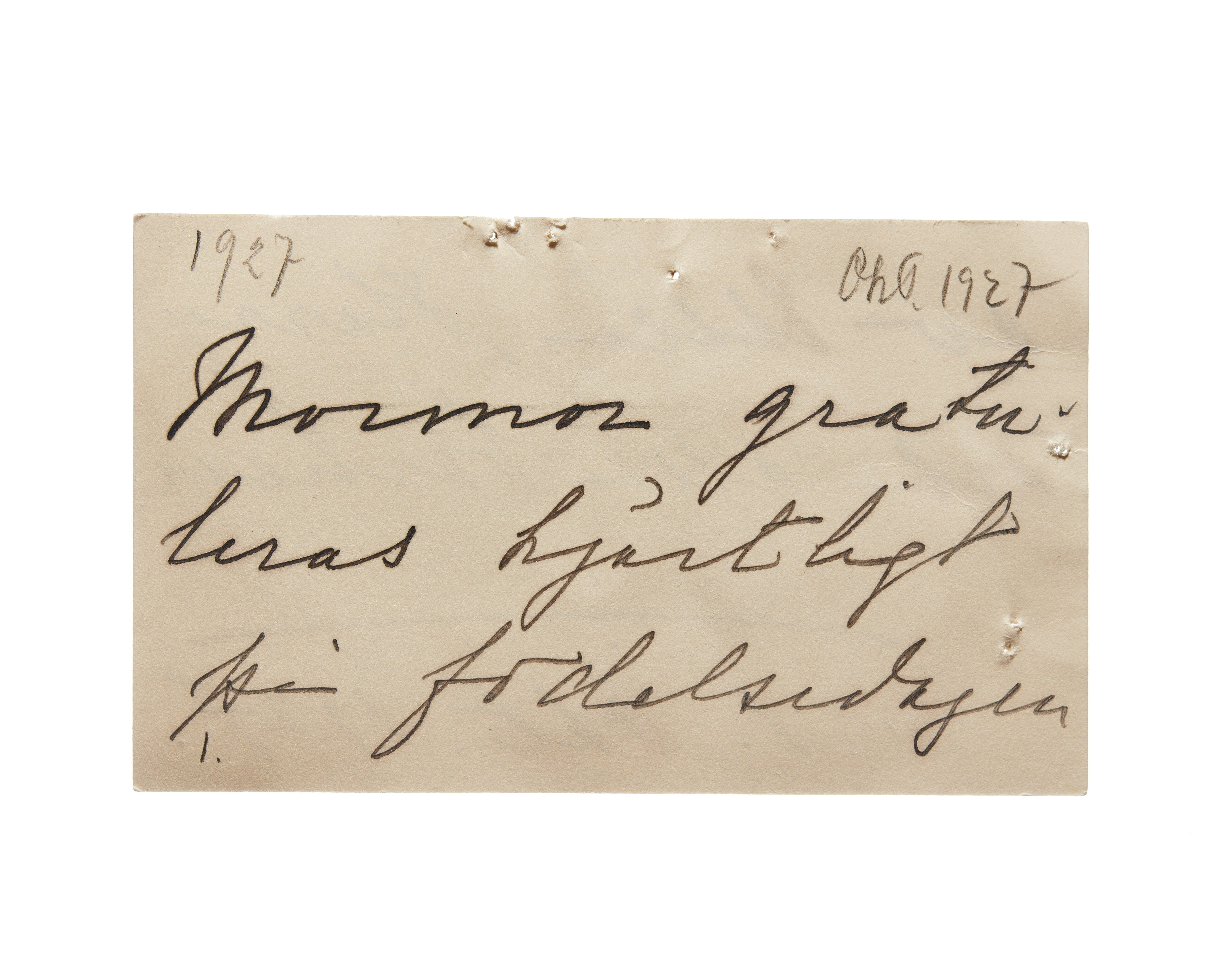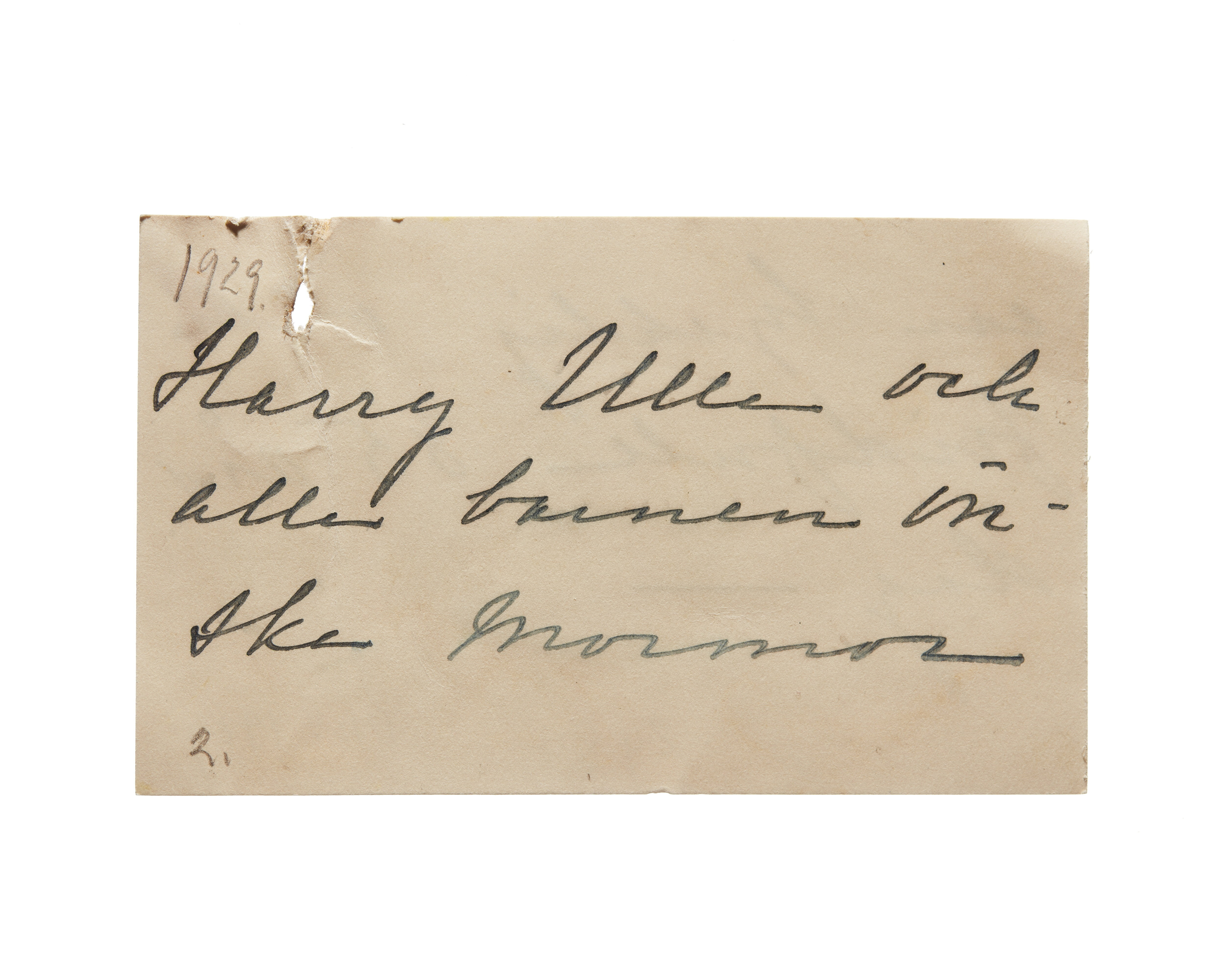 Harry, Ulla och alla barnen önska mormor en lycklig och fridfull 85 års dag. 1929 Mormor gratuleras hjärtligt på födelsedagen av Ulla, Harry och alla barnen. 1 oktober 1927.