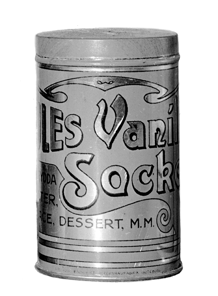 BURK med vaniljsocker Av bleckplåt, rödlackerad. Cylindrisk, med trycklock. På burken i guld: THULES Vanillin Socker Nedtill mot guldbotten: BÄSTA KRYDDA TILL SYLTER, GLACE, DESSERT, M. M. Lock plant, med utanpågående sarg, på översidan varumärke i svart och guld (två frånvända örnar över två svenska flaggor), nedtill i svart: THULE I burken vitt pulver (vaniljsocker). Höjd: 9,9 cm.; diameter:6,1 cm.