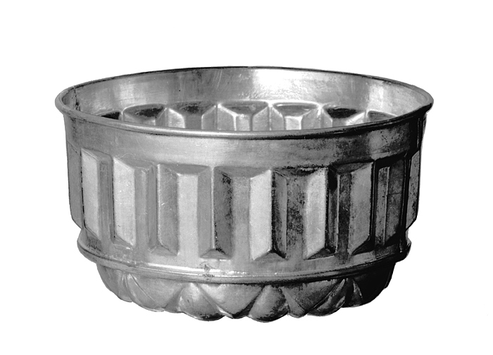 ALADÅBFORM av bleckplåt. Nästan cylindrisk, vertikalt veckad samt med något indragen kupig botten; vecken korta, glest ställda och avslutade upptill mot en slät sarg med stavformigt utstående överkant; livet med två vertikalt gående falsar; i bottnen en krans av radiellt ställda spetsovala bucklor kring en liten mittrosett. Bottnen fastfalsad vid livet; på sargen vid ena falsen en smal rundstavig ring, rörlig i en omvikt plåtflik, fäst med en nit. Höjd: 7,5 cm.; diameter: 13,7 cm.
