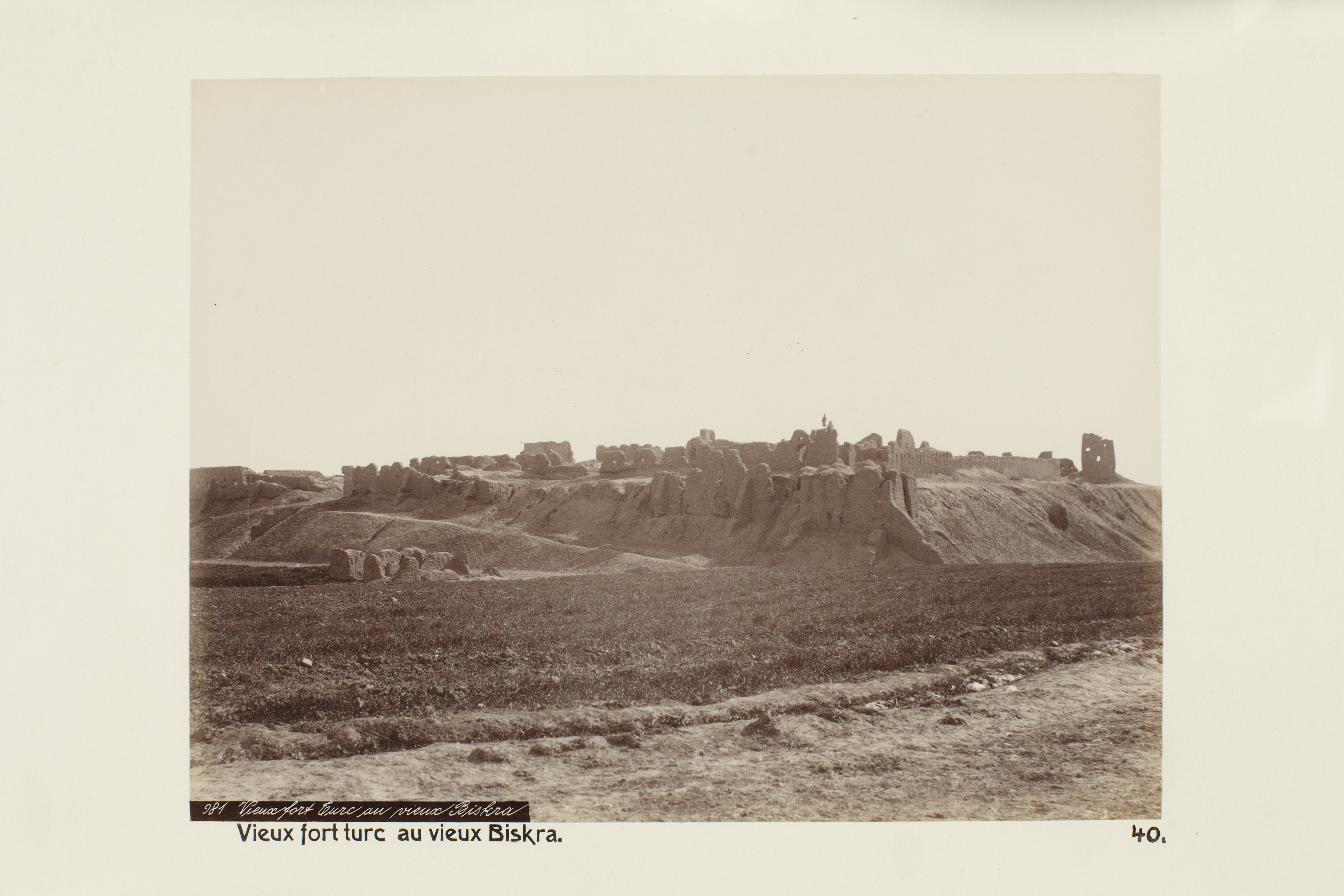 BISKRA, Algeriet. Det gamla turkiska fortet. Foto från resa genom Algeriet och Tunisien samt åter över Schweiz, 11 februari - 19 maj 1889. Samtliga foton i gruppen LXVI:F. är inköpta av Wilhelmina von Hallwyl i Alger, Biskra, Tunis, Constantine, Oran och Blidah vid hennes vistelse i nämnda städer tillsammans med sin make, Walther von Hallwyl, sin mor, Johanna Kempe, f. Wallis, dottern Irma samt fröknarna Caroline Pflaum och Ida Uhse. Uppgifterna kommer från fröken Ida Uhses reseanteckningar.