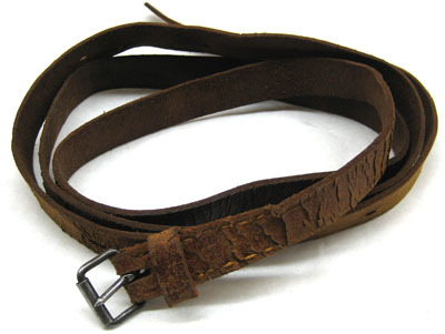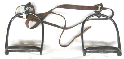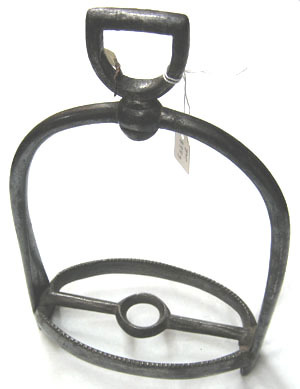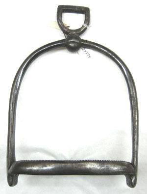 Smidd i stål med mörk, blankpolerad yta. Välvd bygel. Skänklarna med cirkulärt tvärsnitt, nedåt ökande i bredd och allt mer plattade. Upptill i sidled rörligt remfäste av sköldformig ögla, vars hals löper genom ringformig öppning i bygeln. Nertill ovalt trampstöd bestående av två platta tenar ställda på högkant med övre sidan tandad. Mellan dem en stång med rombiskt tvärsnitt, i mitten utsmidd till cirkulär ring, diam 32 mm.