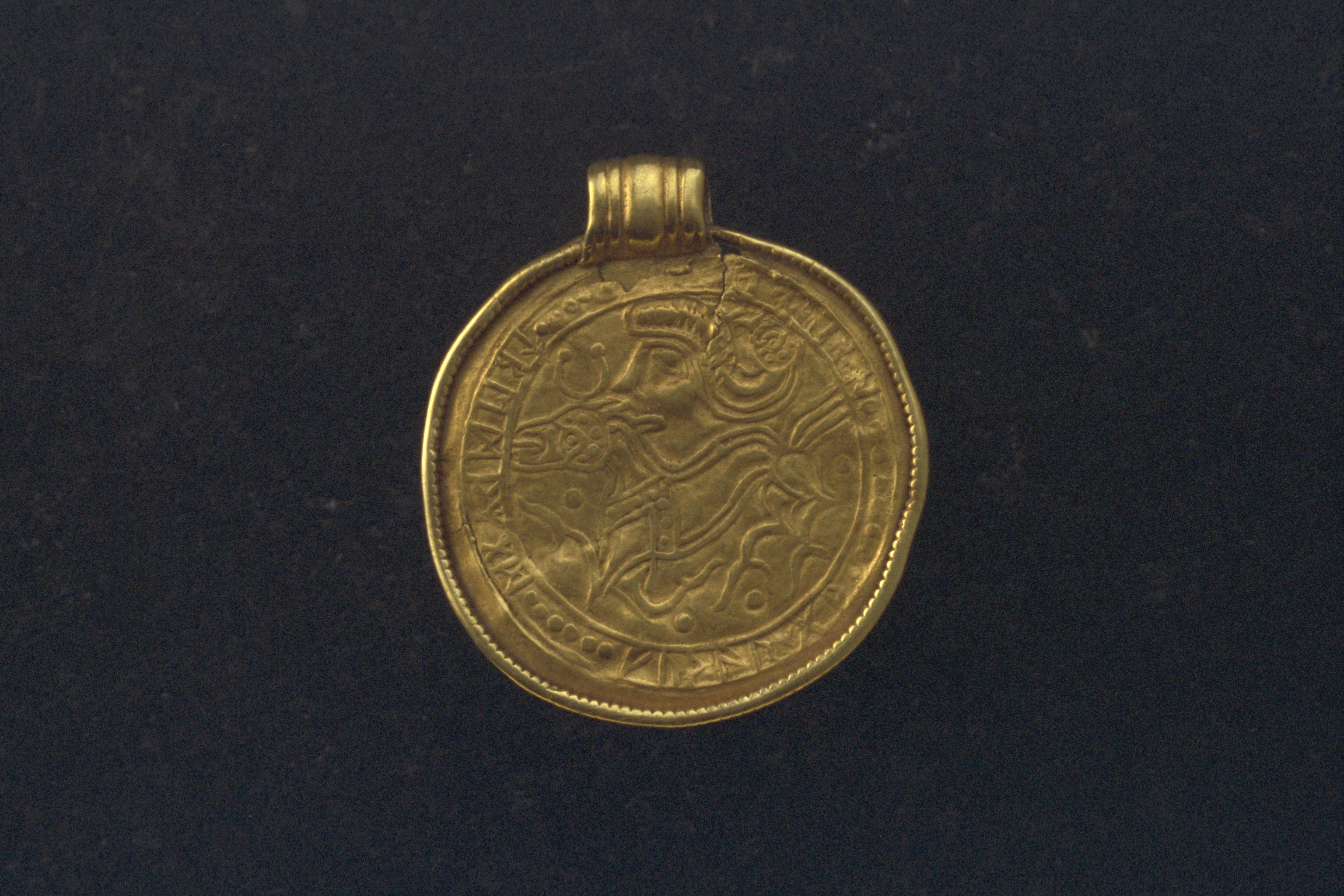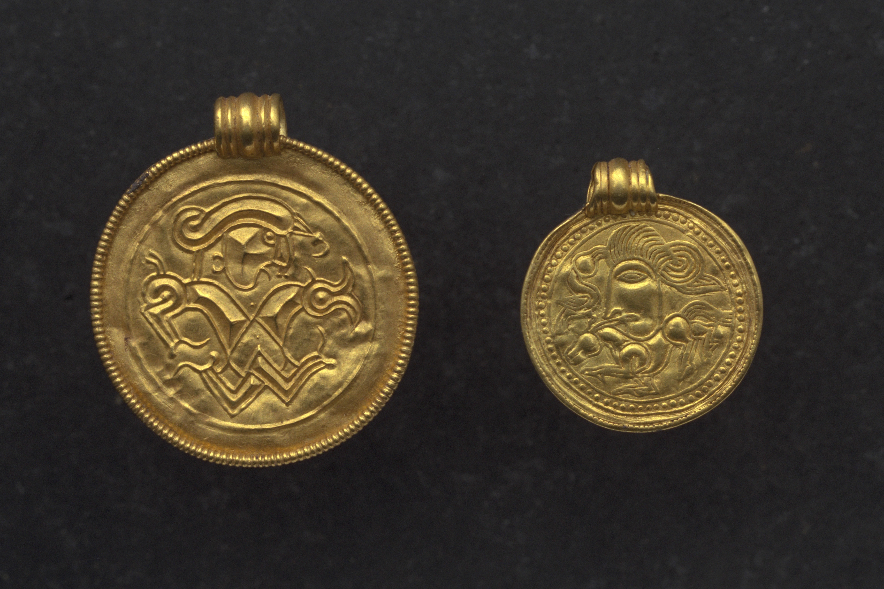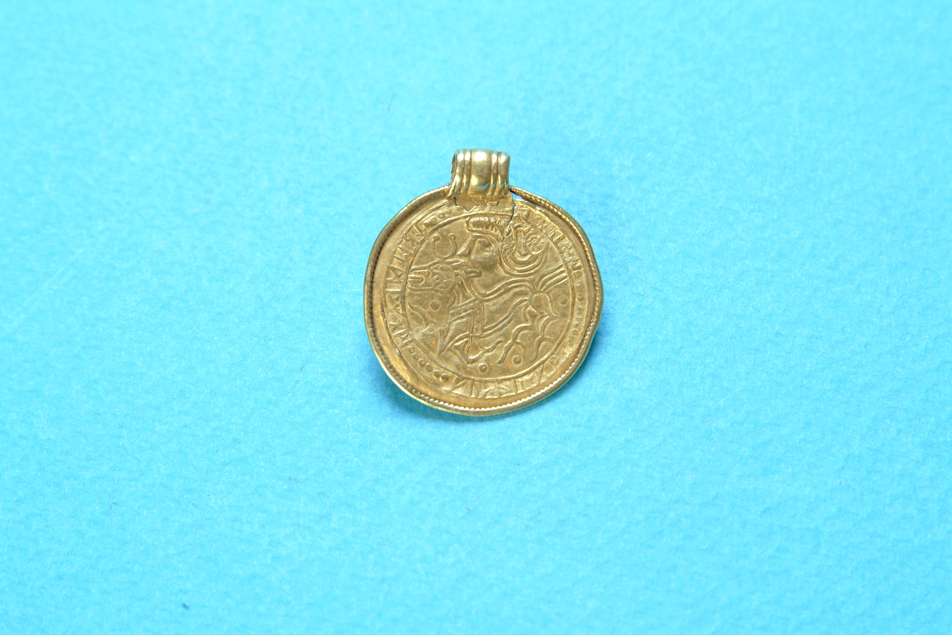 Guldbrakteat med ryttare och två hästar, ögla och kantband i form av små pärlor. Inskrift med äldre runor.
