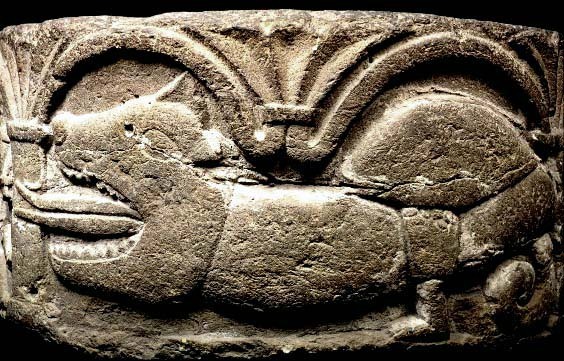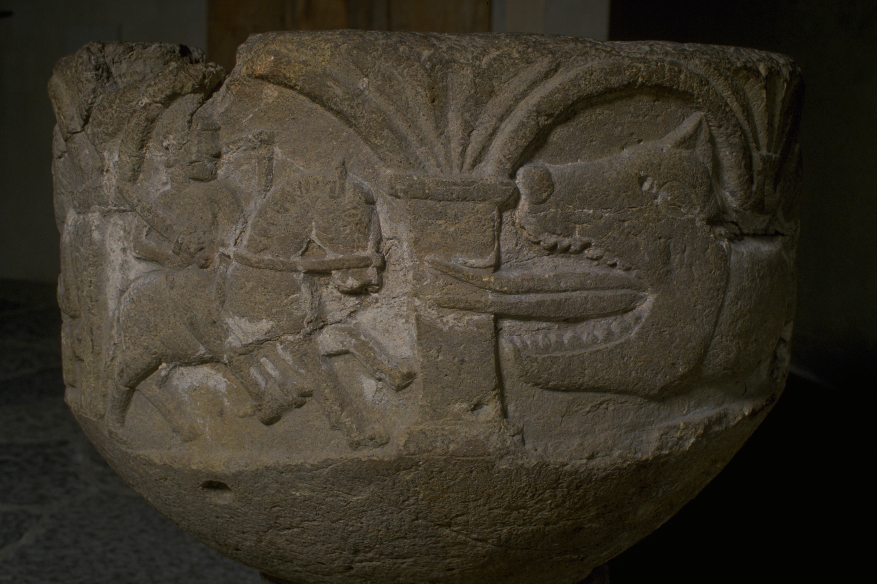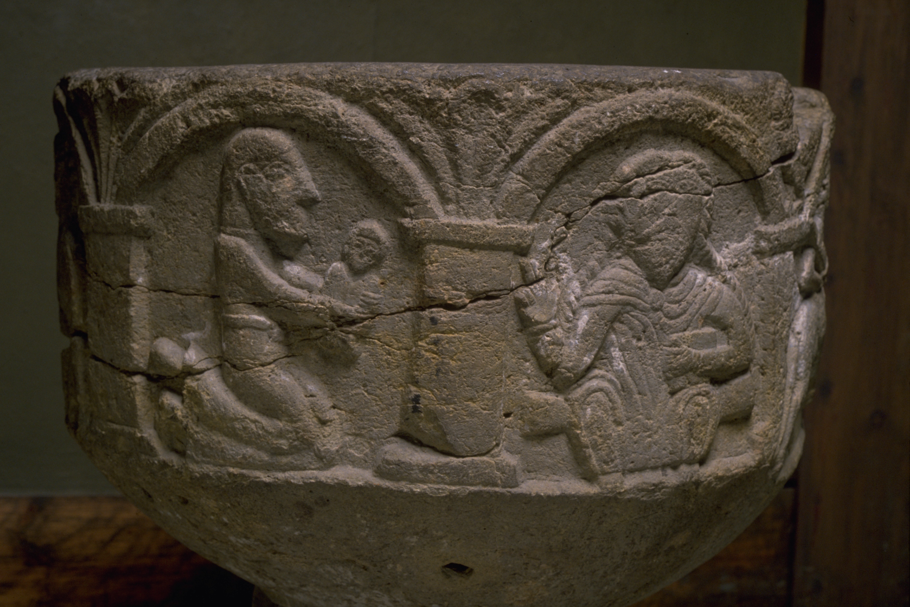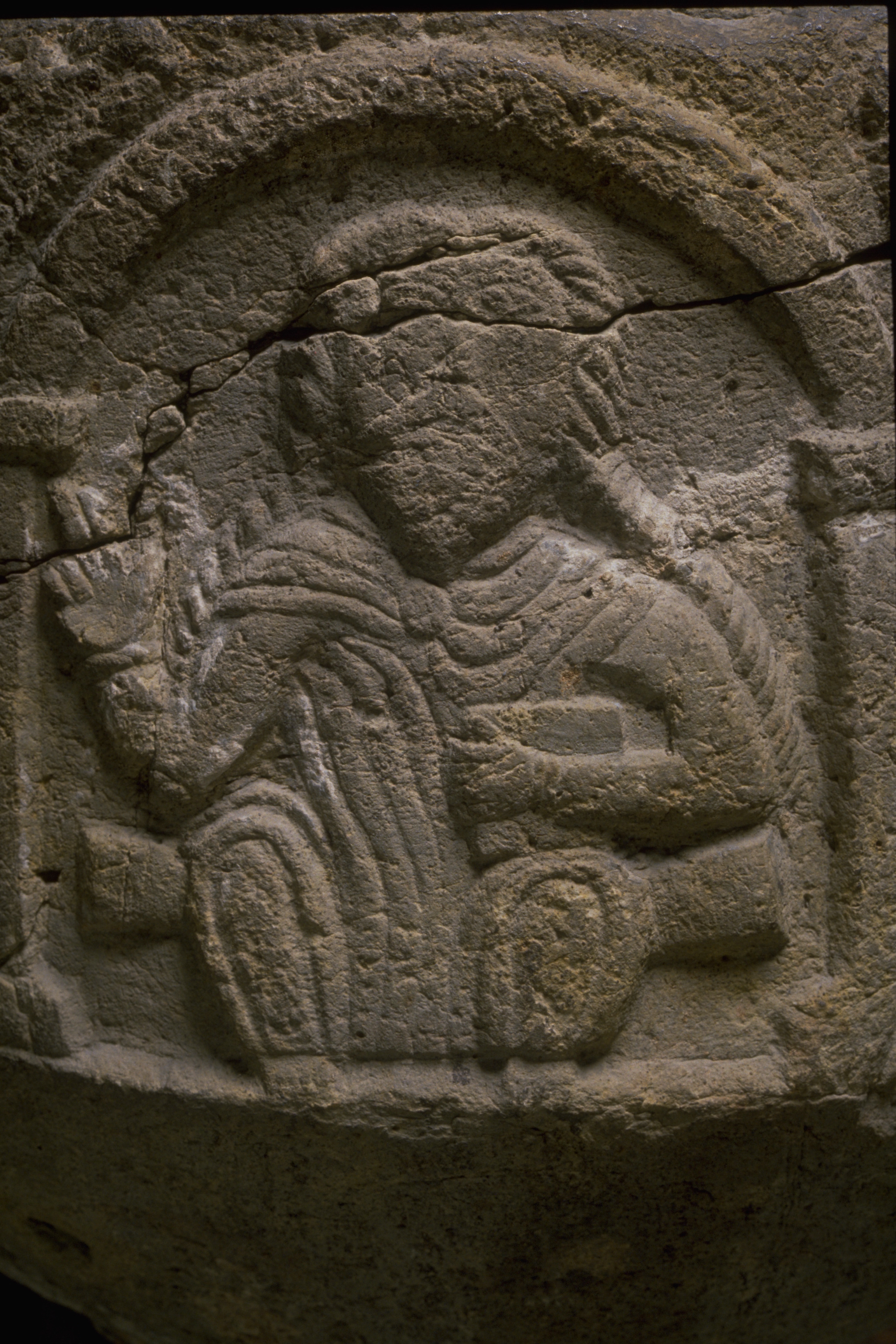 Kondition: horisontell sprickbildning och smärre mekaniska skador. Färg: fragment av kredering.