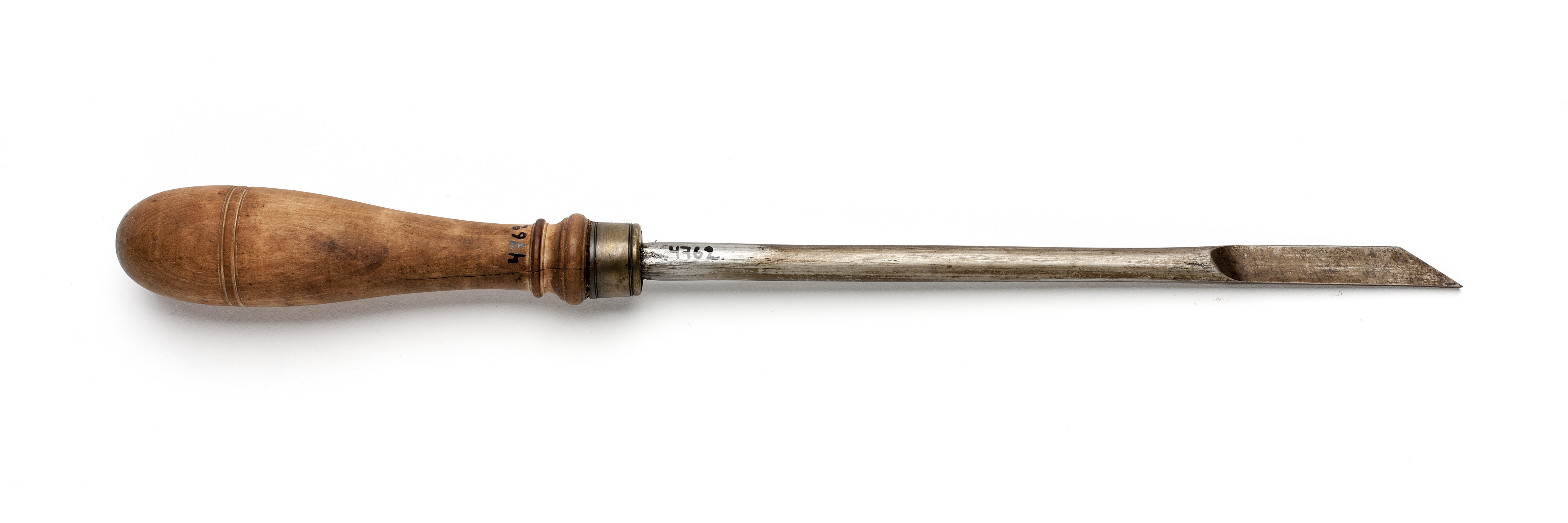 Rund klinga, i änden med rektangulär genomskärning. Svarvat skaft av päronträ med två vulster nedtill ("skoklostertyp"). Mässingsring.