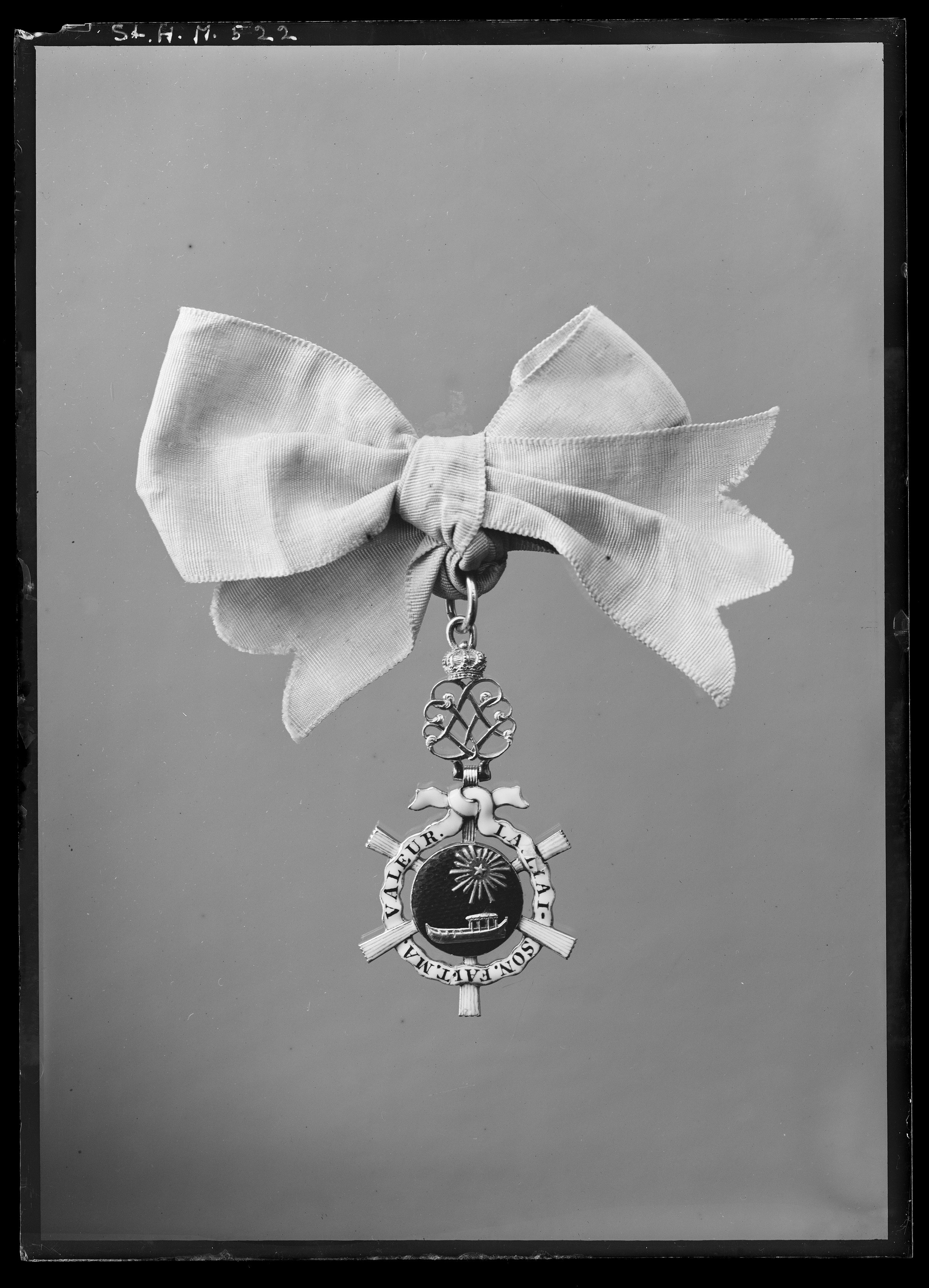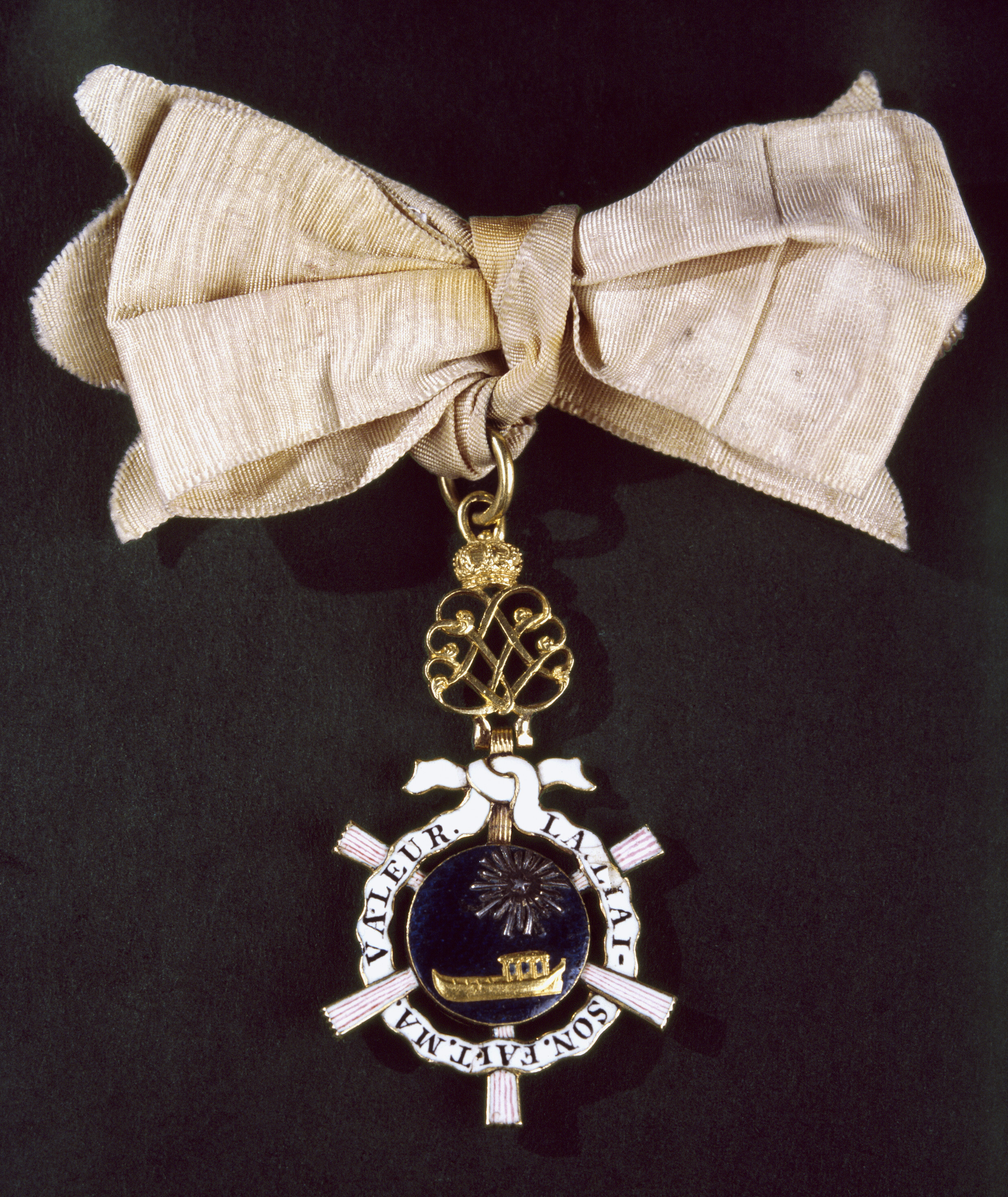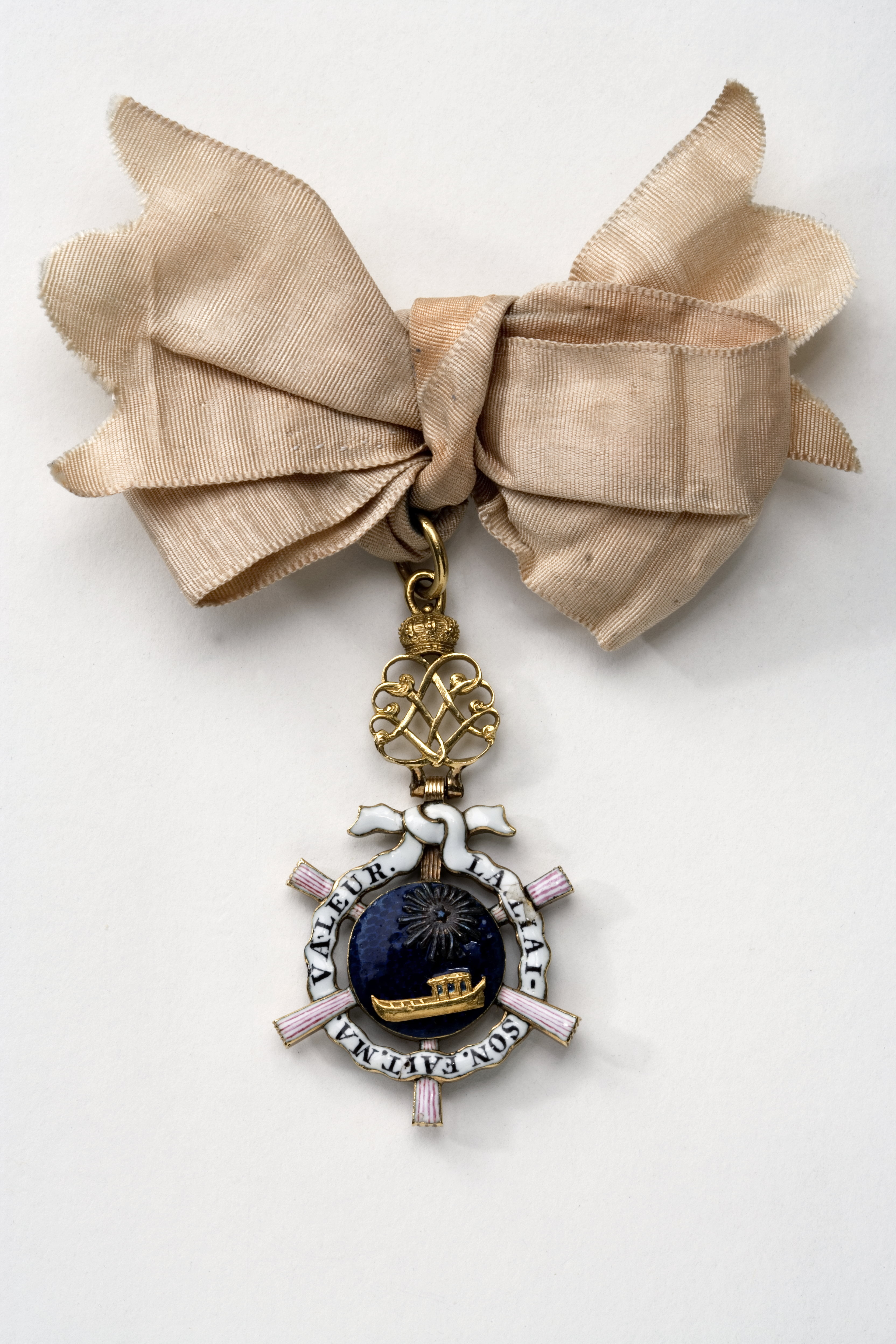 Dubbelsidig, blåemaljerad medaljong av guld med reliefbild i guld av kunglig slup, därovanför en femuddig stjärna, omgiven av strålar. Från medaljongen utgår sex hopfällda solfjädrar täckta med vit emalj med rosa ränder. Mellan solfjädrarna går ett vitt, ringformigt språkband med svart text, på åtsidan: "LA.LIAI-SON.FAIT.MA.VALEUR", på frånsidan "LA.DIVISION.ME.PERD.", textbandet är upptill knutet i rosett. Därovanför guldring och däri fäst ett med kunglig krona krönt namnchiffer: L V, upptill en fast ring och däri fäst en bandring av guld.