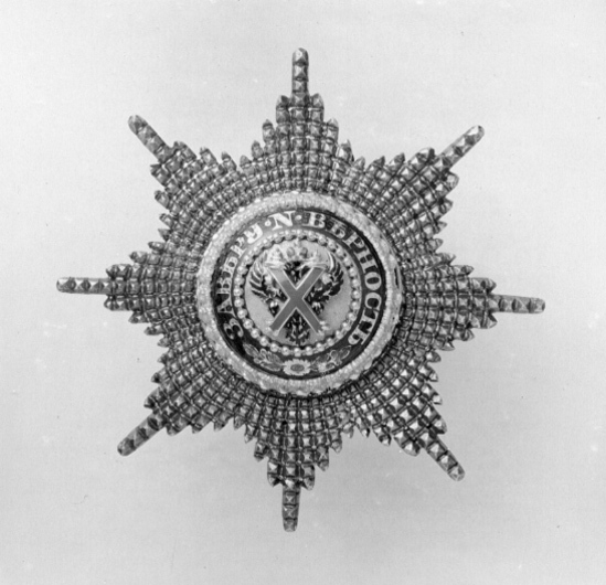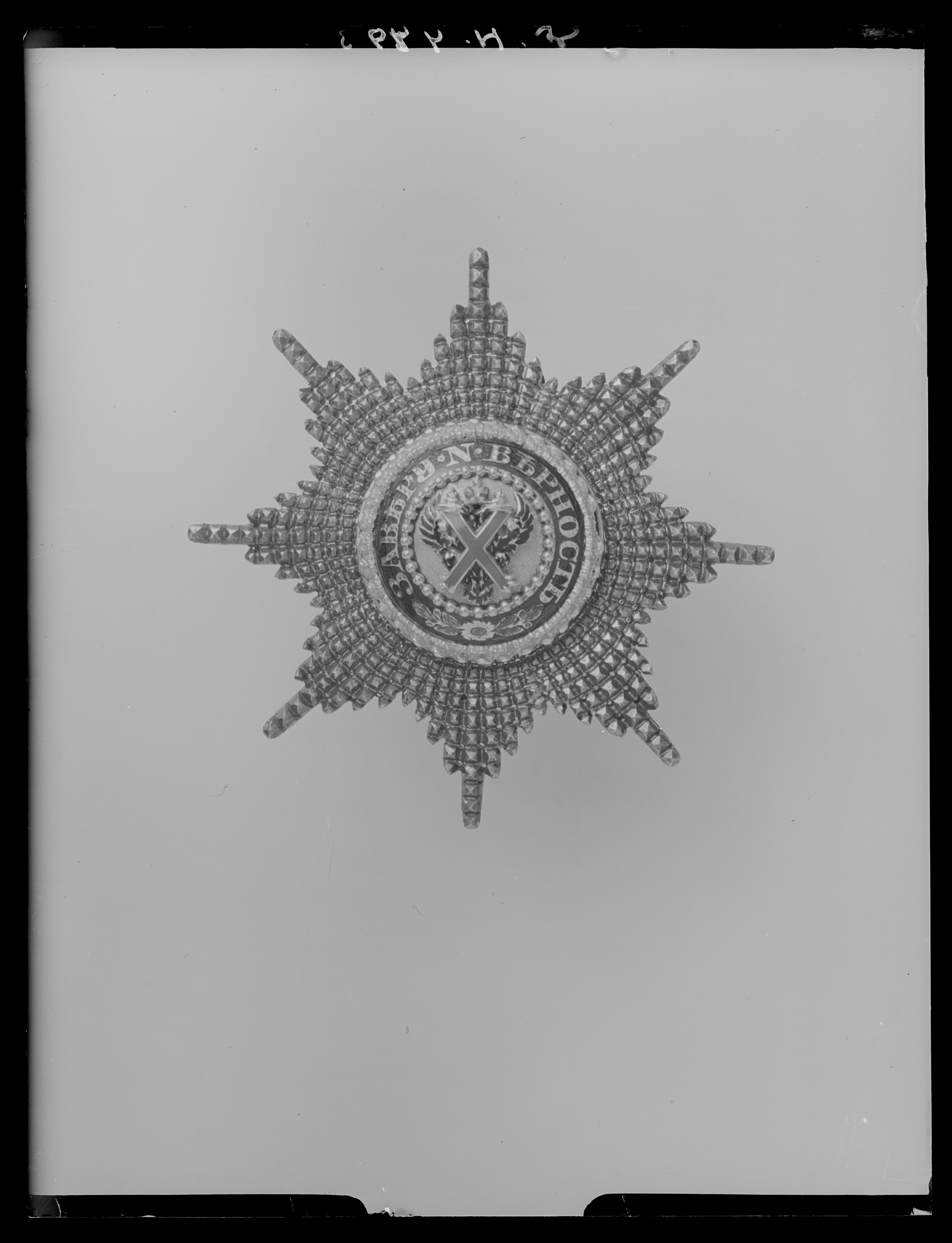 Åttauddig, flinkerad strålstjärna av silver. Starkt välvd medaljong av guld med i mitten ett guldfält, kantat med en pärlstavsring av guld. Därpå fäst en svartemaljerad, krönt dubbelörn av guld med ett blåemaljerat Andreaskors på bröstet. Blåemaljerad kantring med guldtext, kyrilliska bokstäver: "ZA . VERU . I . VERNOST'", på nedre halvan en lagerkrans av guld samt röd och grön emalj. Runt medaljongen en bladkrans av guld. Frånsidan slät, fyra muttrar för fästning av medaljongen, säkerhetsnål.