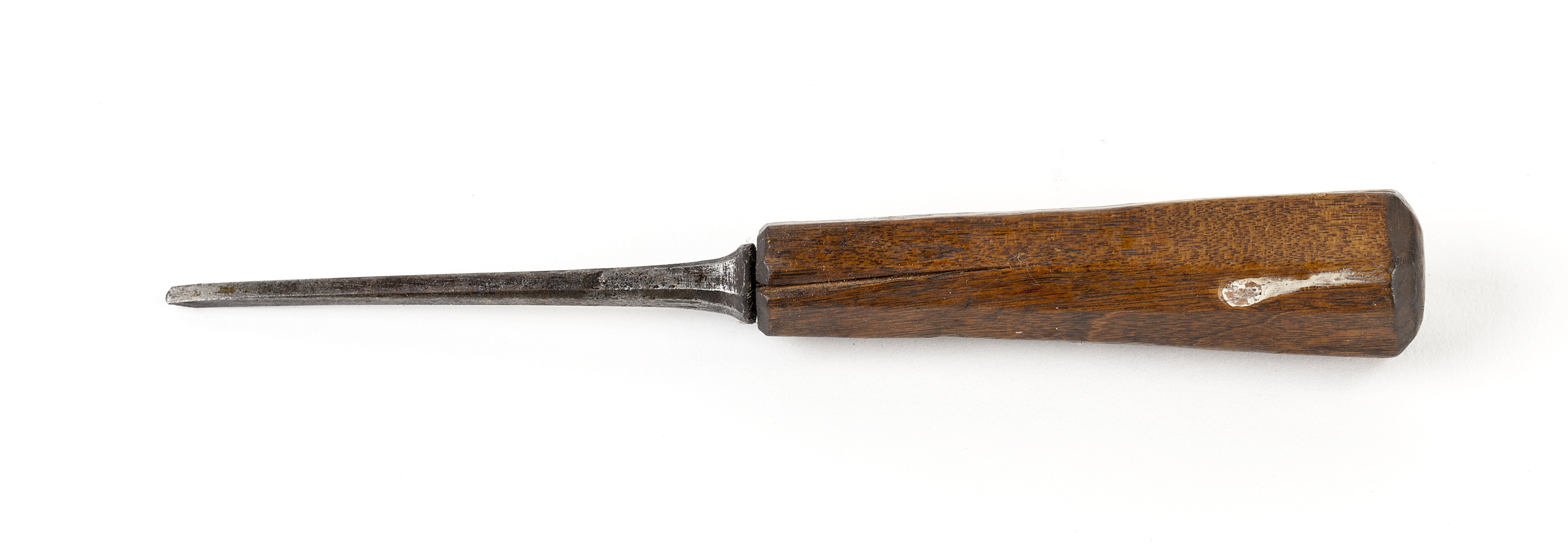 Stämplat på klingan: öppen krona. Klinga med rektangulär genomskärning, avfasade kanter. Rak egg, slipad från undersidan. Skuret, åttsidigt skaft av lövträ.