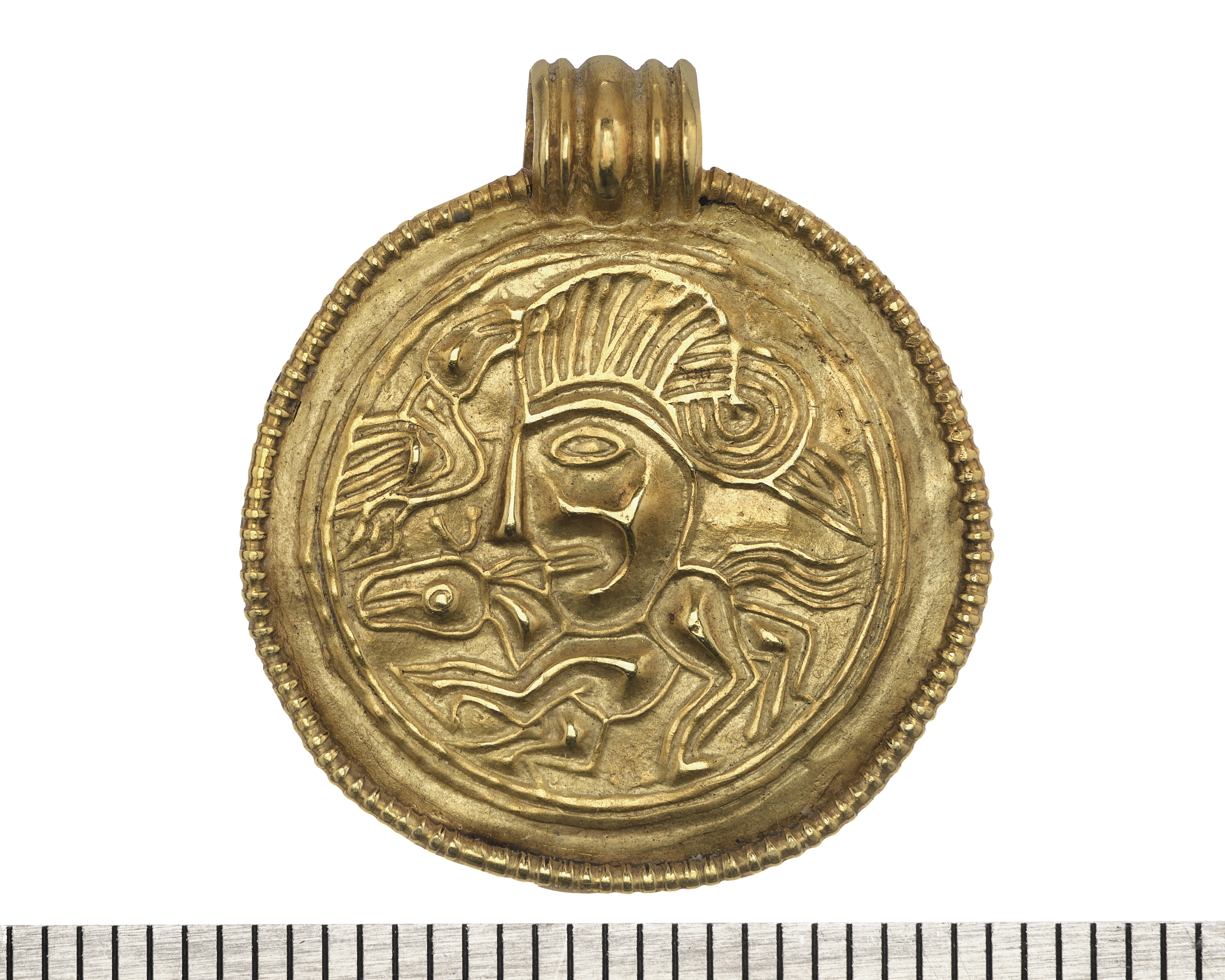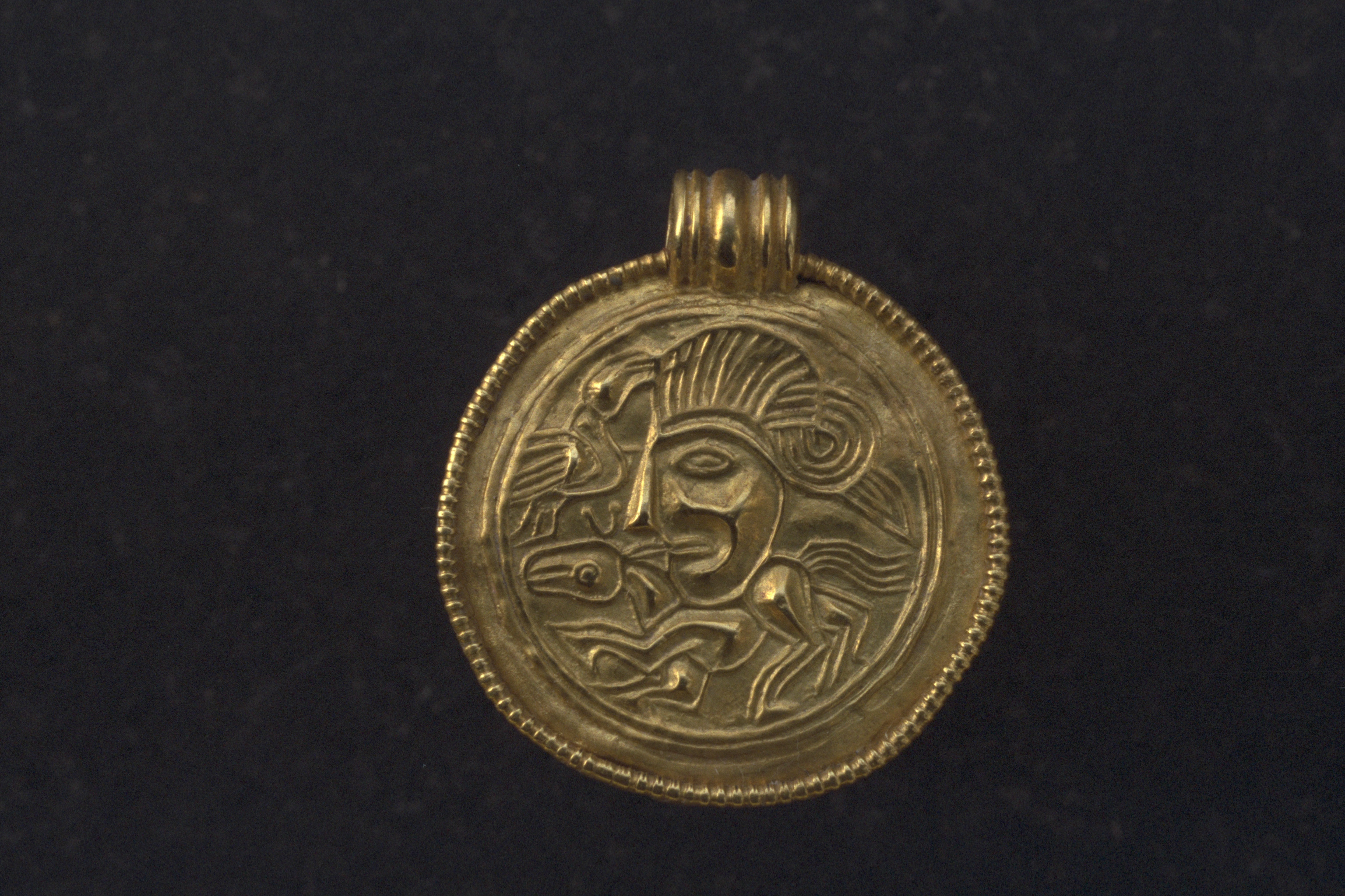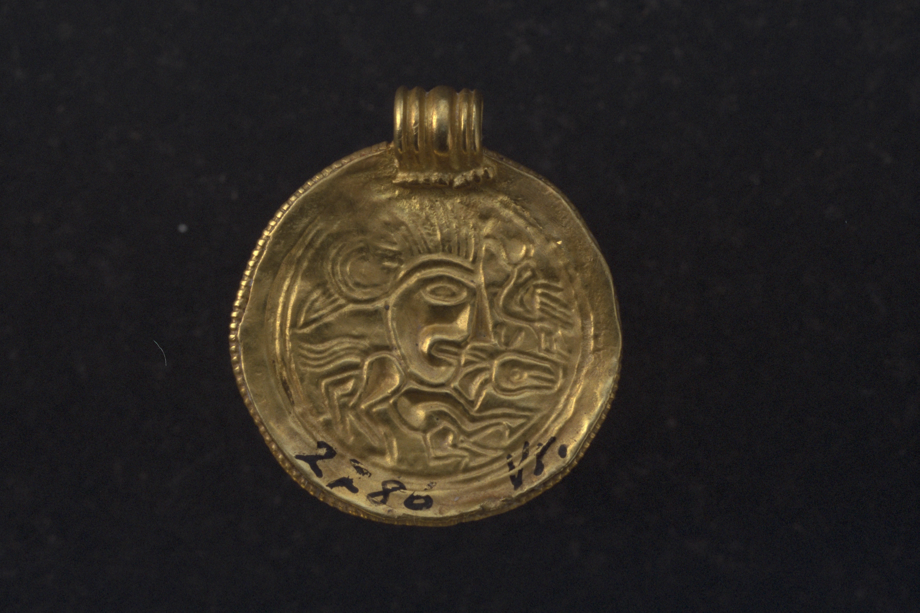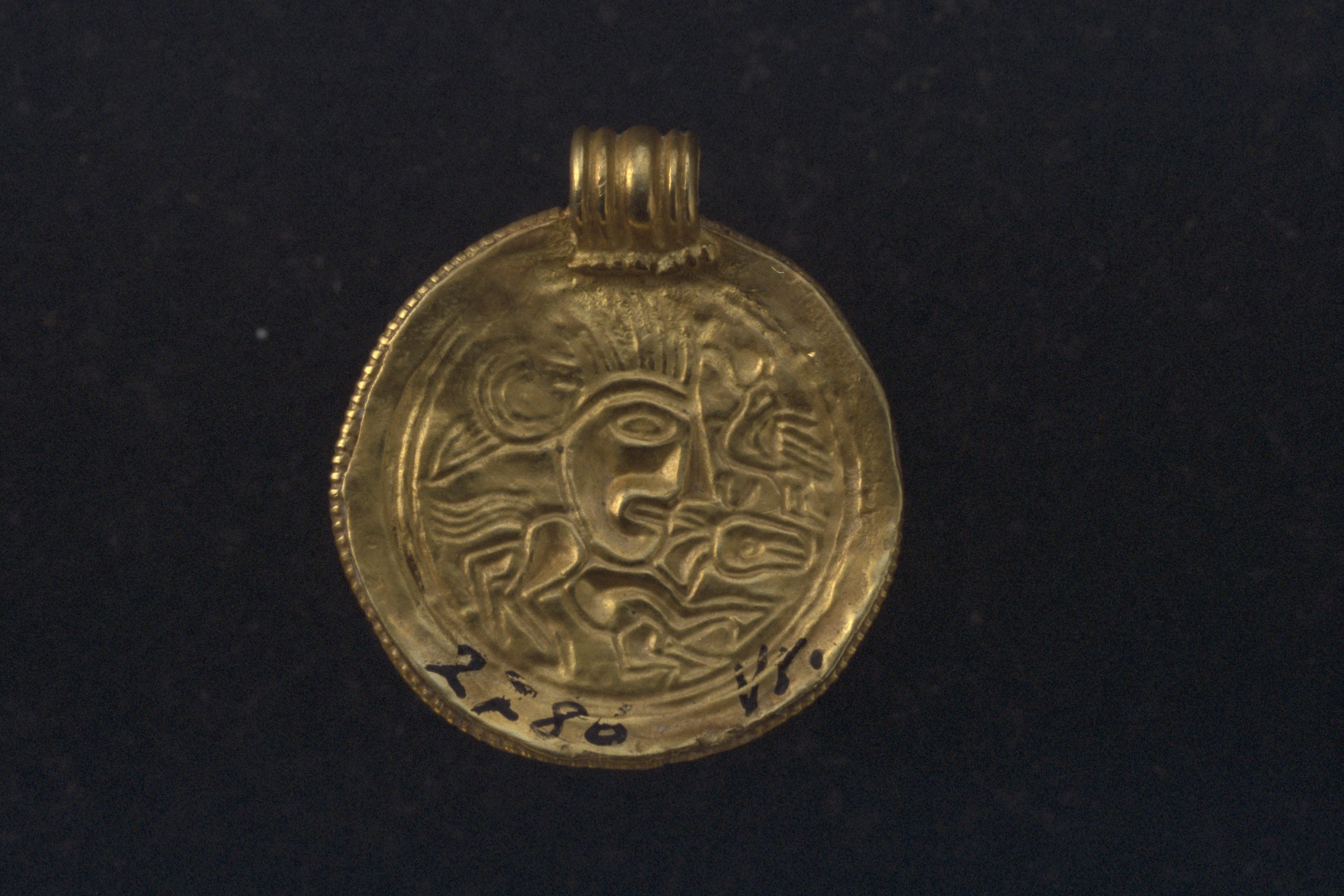 C-brakteat av guld. Krig kanten och öglan har den en tvärstrierad tråd. På framsidan ett huvud över ett behornat fyrbent djur samt en fågel framför huvudet.