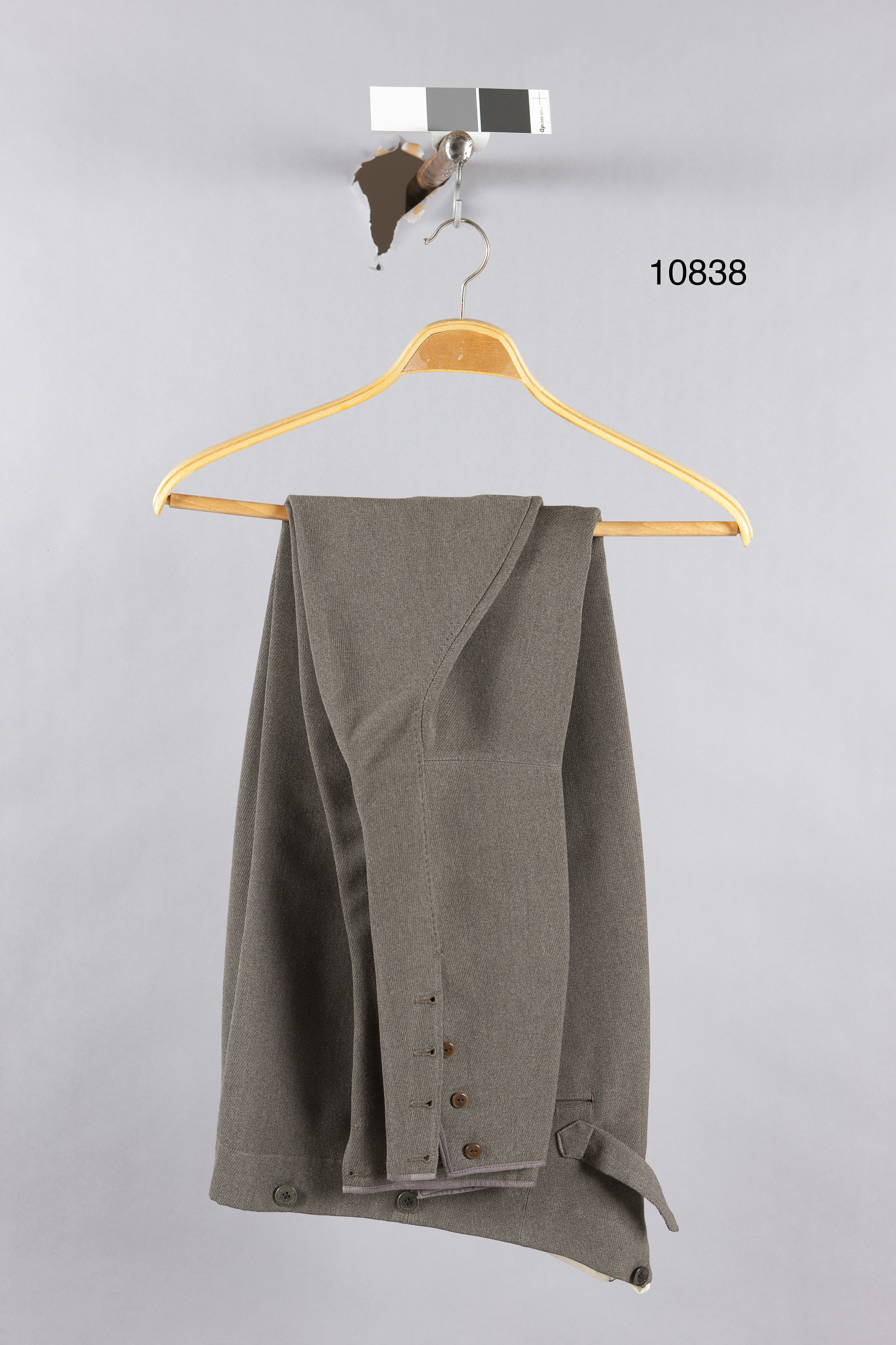Ridbyxor av grå diagonal. Gylf med tio, knappar, d: 14 mm, med firmanamn: "MILITÄREKIPERINGS A.B.". På linning sex lika knappar, d: 17 mm. I mittsömmen bak infälld kil av grått siden. Två bakfickor knäppta med vardera en knapp, däremellan spänntampar medblånerad sölja med text: "SOLIDE". Ficka i sidsömmen, i denna, nedtill ett 190 mm långt sprund knäppt med fyra små släta burna knappar. Foder ned till knäpartiet av tunt, vitt ylle. På insidan fram, tamp av fodrets tyg med fastsytt firmamärke: "Militär Ekiperings AB // KUNGL. HOFLEVERANTÖR // Stockholm den 19.8.1940 // Herr H.K.H // Prins Carl".