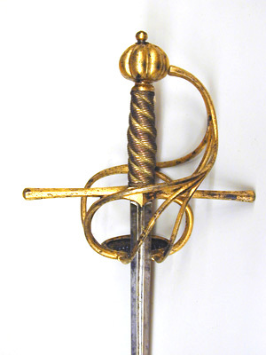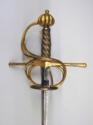 Bygelfäste av helt förgyllt, slätt stål, guldet påslaget. Knapp bukig, ornerad med åtta vertikala godronner, nitknapp nästan kulformig, tämligen stor. Handbygel liksom övriga delar av pareranordningen sexsidig, överdelen tätt anslutande till knappen.Något ovanför handbygelns mitt utgår en sidobygel åt vardera ut- och insidan. Den yttre sidobygeln övergår nedåt i en vid kryssbygel, som jämte de stora fingerbyglarna nedtill övergår i den ovala parerplåtens kantlist. Den inre sidobygeln övergår vid krysset nedåt i tre spänger av vilka de två främre ansluter nedtill på vardera sidan av klingan till fingerbyglarnas nedre ändar, den tredje (bakre) ansluter till nederdelen av den bakre fingerbygeln. Parerstänger raka, långa. Kavel spiralräfflad, lindad med mycket tunn, förgylld, delvis tvinnad mässingstråd, i räfflorna tvinnad, förgylld mässingstråd. Klinga rak, lång, smal, tvåeggad, slipad med jämnbreda skär. Ingen ricasso, slipningen fortsätter mellan fingerbyglarna upp till krysset (detta indikerar att klingan ej varit avsedd för ett fäste av denna typ).
