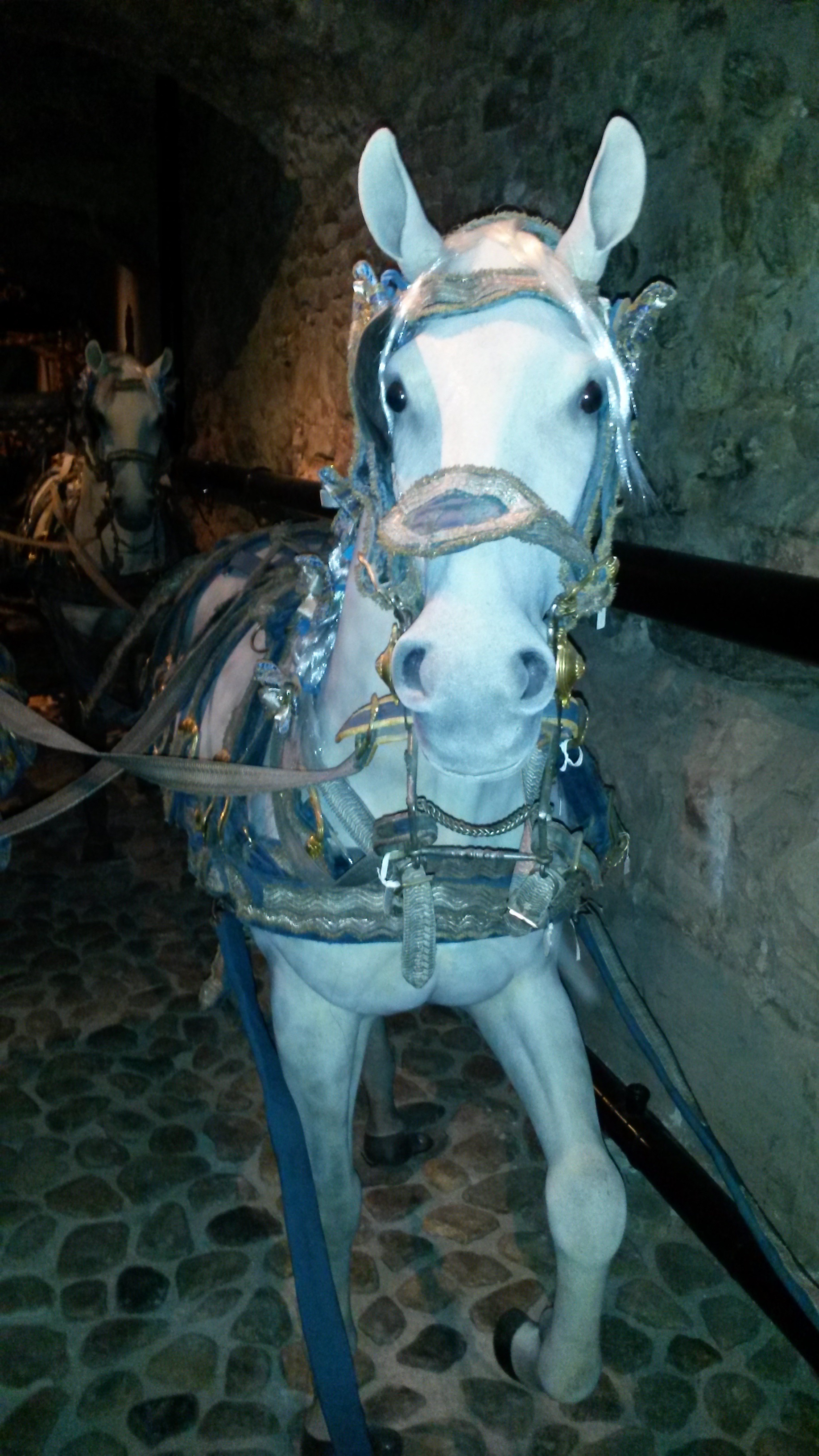 Seldon, bröstsele, på vänster mellanhäst, bestående av brösta, fyrkantig däckel med tre tömlöpare (ringar), runt ryggstycke (däckel, s.k. rosen), linlyftare, åtta bärremmar och en stödrem på vardera sidan samt svansrem och svanskappa. Stomme av läder, överklätt med blå sammet i kypert, och på översidan silvergalon med guldfrans längs kanterna. Bröstan på insidan blått linne i tuskaft. En främre rektangulär däckel, ca 500 x 250 mm, med tre tömlöpare och applicerade kronor, motställda, med på var halva en kungakrona och tre adelskronor, två och en, i läggsöm och plattsöm av guld och silver. Fyra remmar från var kortsida varav endast en på höger sida är fäst i bröstan, ca 1150 x 150 mm, och med fyra remmar från bakre långsidan fäst vid en rund däckel, ca 210 x 240 mm, med tre applicerade adelskronor, två och en, i läggsöm och plattsöm av guld och silver. Denna är fäst vid det högra draglädret med en rem och en rem loss, på vänster sida tre remmar loss och en saknas. Draglädret ca 320 x 70 mm, har på var sida en skjutbar rem, ca 580 x 80 mm varpå remmarna från den runda däckeln har varit fästade. Linlyftaren, ca 1400 x 100 mm är tudelad mot draglädren och fäst i dessa. Bukgjord med i ena änden en kantig förgylld stålsölja med löphylsa. Draglädret som även fungerar som draglina fäst vid ringen på bröstans kortsidor och avslutas med en löpkrok. Den högra linan avsliten lös del ca 1760 mm lång med löpkroken. Remmarna vid draglädret, bröstan och rektangulära däckeln fästade med mässingspännen. Fastsydda vid runda däckeln. Spännena är rektangulära, av förgylld mässing med rokokodekor, tillverkade av Ludolph Wehser. Konserverad 1971. (Beskrivning avser föremålet före konservering).