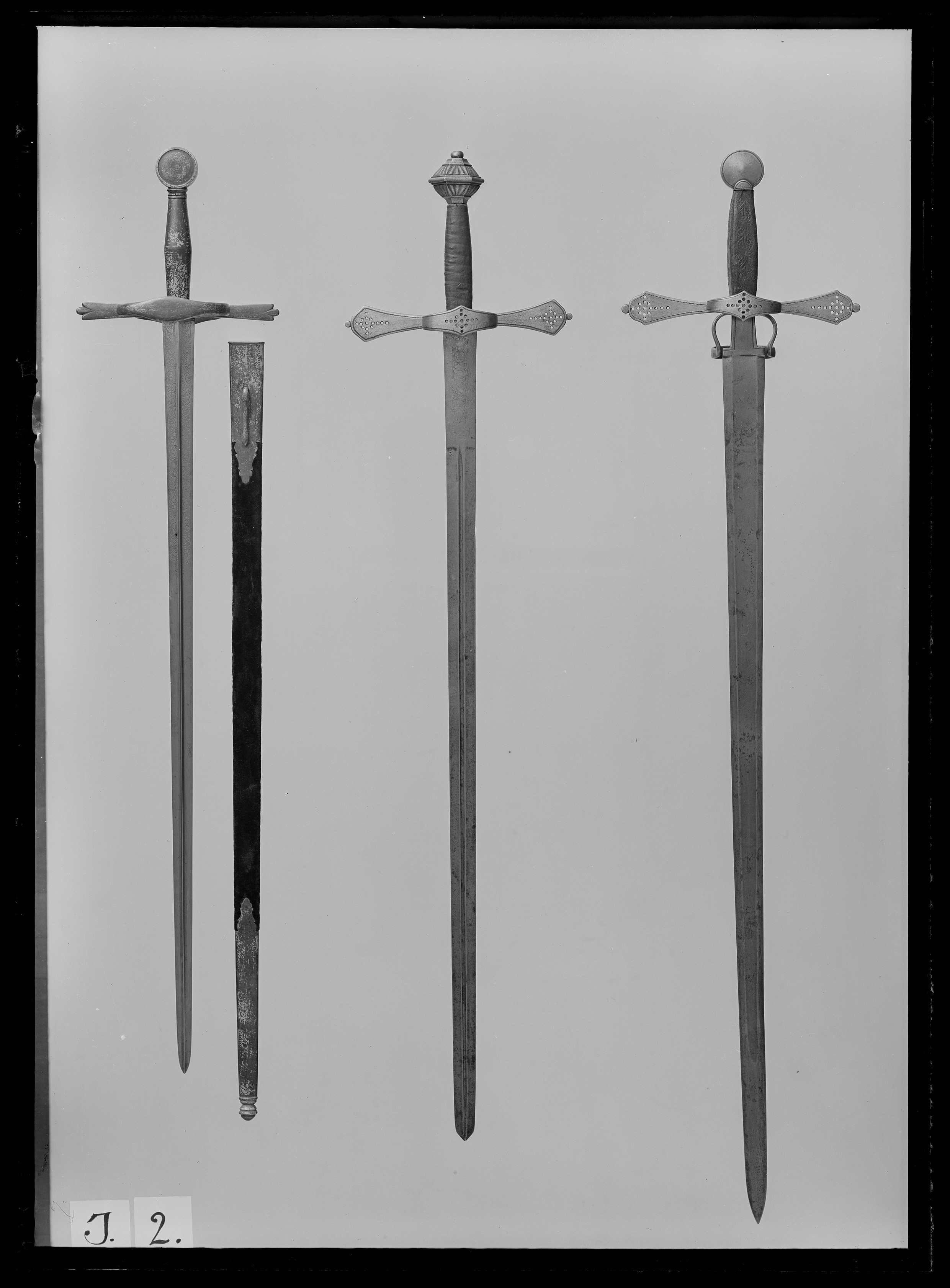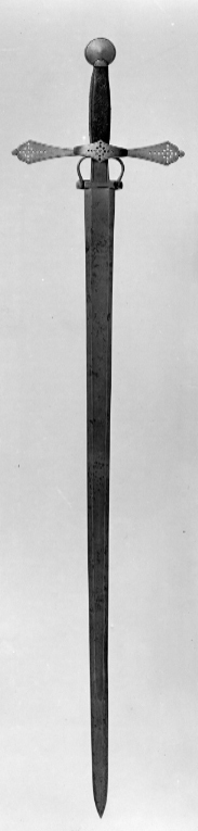 Korsfäste av stål. Knapp utformad som en vertikalt ställd tjock slät skiva. Utmed dennas ut- och insida en smal prickerad kantbård. Nitknapp saknas. Pareranordning i form av raka, platta parerstänger tunnare mot de utvidgade och rundat konturerade ytterändarna, som båda avslutas med en liten rundad knapp. På utsidan kryssbygel med vidgat mittparti. Nedanför krysset, två i ett och samma stycke smidda fingerbyglar nedtill på insidan förenade med en tvärbygel. Parerstängernas och tvärbygelns utsida med en smal prickerad bård utmed kanten. Ytterändarna och kryssbygelns mittparti dessutom ornerade med en genombruten ornamental grupp av runda hål. Fingerbyglarnas inre kant snedräfflad. Kavel med fyrsidigt tvärsnitt klädd med mörkbrunt läder orneratmed pressat rankmönster. Klinga rak, tvåeggad med en 40 mm lång ricasso, på båda sidor en bred flack ca 800 mm lång hålkäl. Klingan, som har spår av på konstlad väg åstadkommen patinering saknar eforderlig styvhet. Tvärbygeln borde, liksom kryssbygeln ha varit placerad på utsidan.