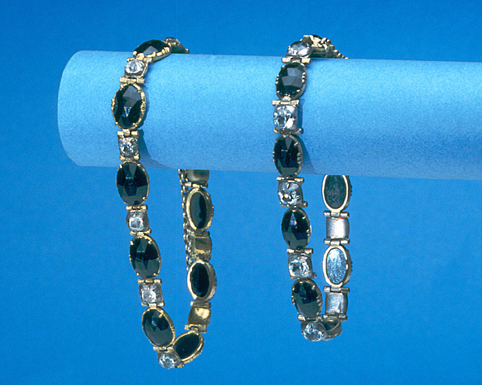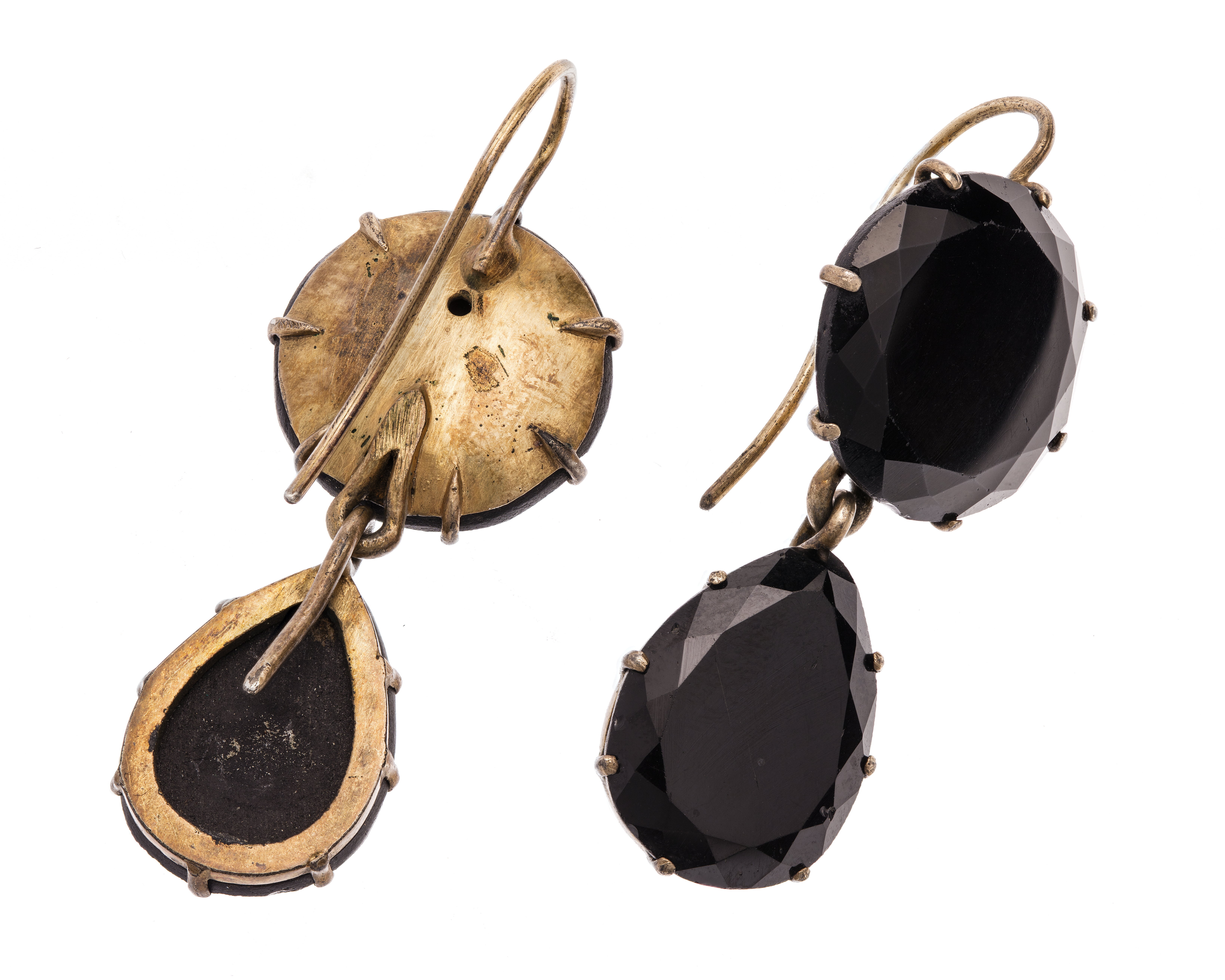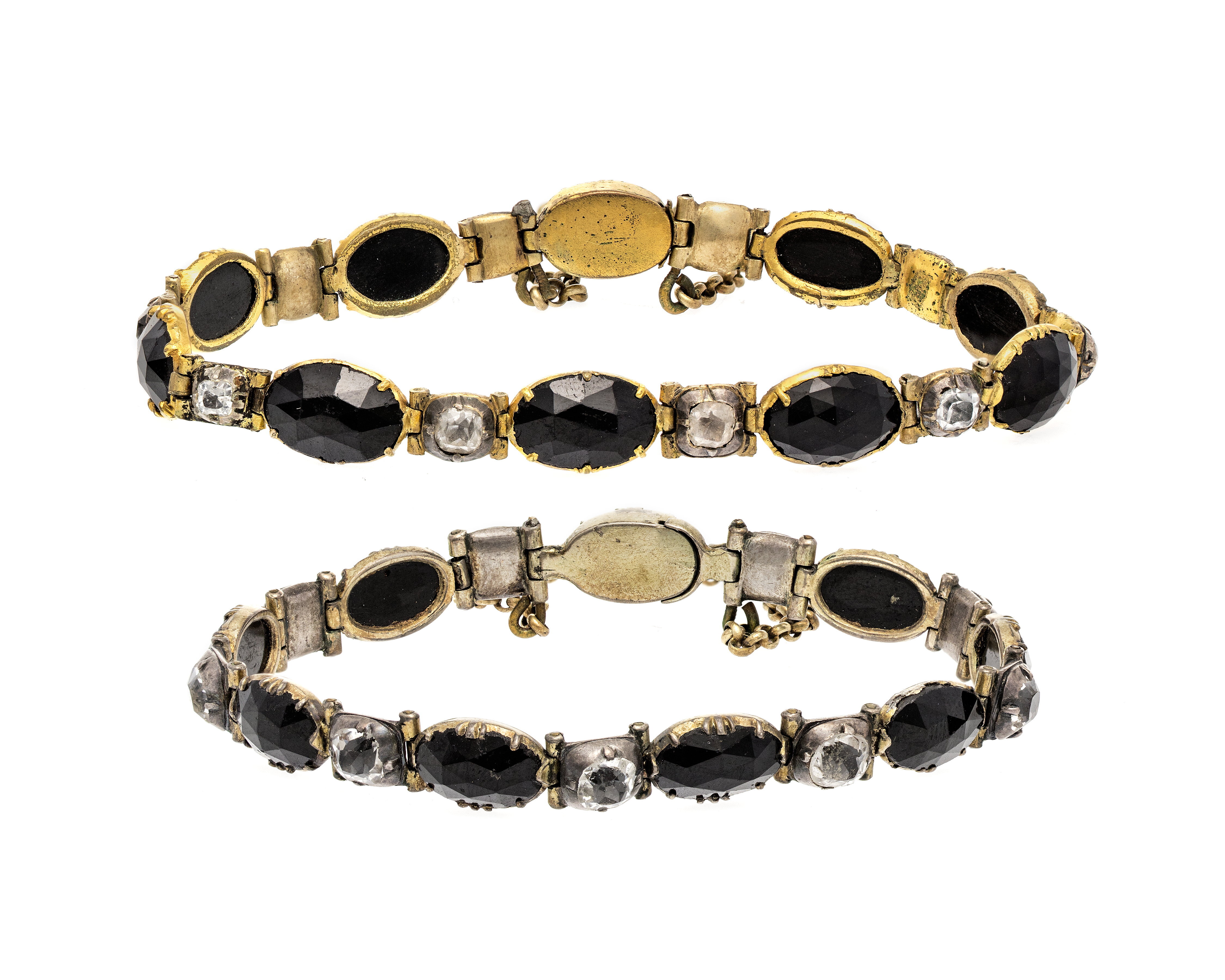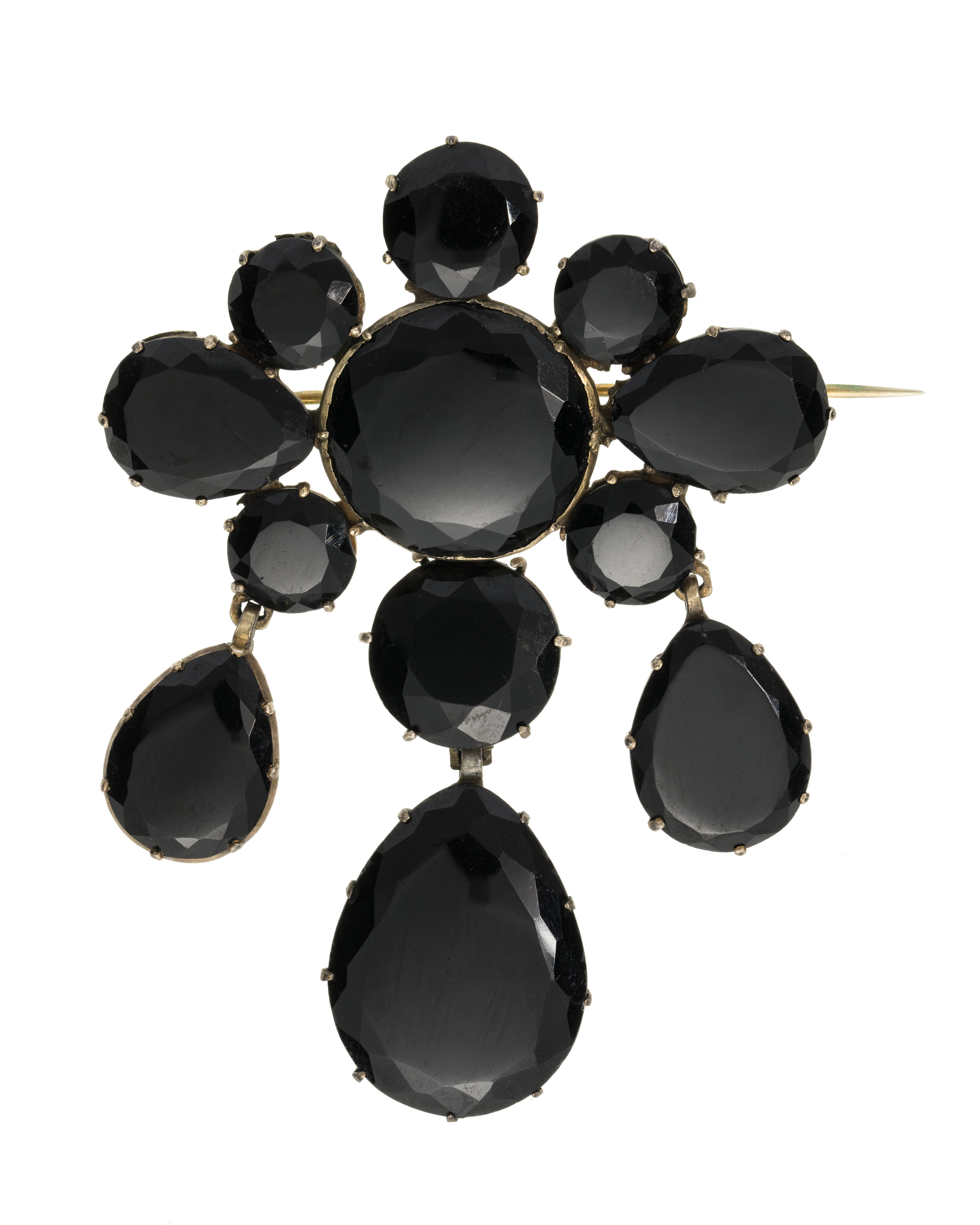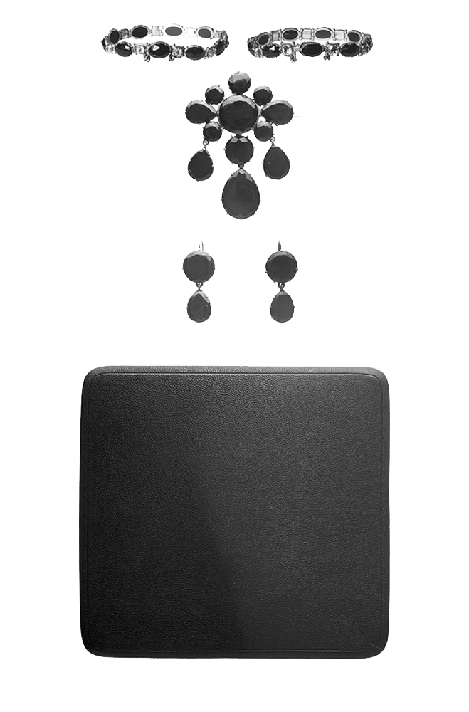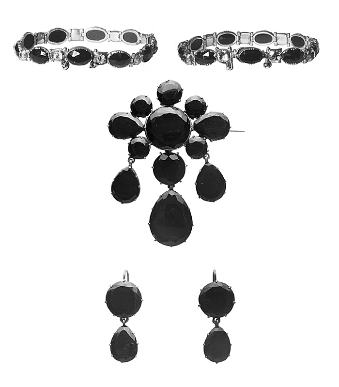 - Bestående af två armband, brosch och ett par örhängen. Af gagat (jet) och bergkristaller med förgylldt silfver och förgylld brons. Armband: Det ena bestående af nio i längdriktningen liggande fasetterade gagatstenar, fattade å jour i afdäckta fattningar af förgylldt silfver med körnor; mellan gagatstenarna en fyrsidig briljantslipad bergkristall i afdäckt fattning med fyra körnor samt folierad; stenarna sammanhållna och ledade medels scharner. Å armbandet ett lås med snäppare och snäpparhus, snäpparen fäst vid en af kristallerna och snäpparhuset i en af gagaternas fattning; mellan de sistnämnda stenarna en säkerhetskedja af små runda halfstafviga länkar. Det andra armbandet med tio gagatstenar i dylika fattningar af förgylld brons, för öfrigt som det första. Utan stämplar. Vikt: 12.5 och 11 gr. Det ena, längd: 16 cm.; bredd: 0.8 cm. Det andra, längd: 18.5 cm.; bredd: 0.8 cm. Brocsch: Liggande aflång. Bestående af åtta plattslipade gagatskifvor med fasetterade kanter; i midten en stor rund, omgifven af sju mindre, nedtill två och upptill tre runda, vid hvardera sidan en päronformig. I nedre kanten ett hänge och två kläppar af gagatskifvor som föregående; hänget i midten med en päronformig kläpp och en rund skifva, kläpparna som den i hänget men något mindre; alla fattade å jour i klofattningar med undantag af öfre skifvan i hänget, som har hel kupig botten, hänget koppladt på en lång hake i midtskifvans fattning, kläpparna medels en hake i dennas fattningar; hakarna gripande i motsvarande öglor. Å baksidan nål och krylle. Utan stämplar. Vikt: 23 gr. Höjd: 7.8 cm.; utan hänge, höjd: 3.7 cm.; bredd: 5.7 cm. Örhängen: Hvartdera i två delar, hvardera med en plattslipad gagatskifva som de i broschen, den nedre päronformig, fattad å jour, den öfre rund, med kupig botten, båda i klofattning af förgylldt silfver. Delarna sammankopplade medels en lång hake, som griper i en ögla i öfre delen, upptill å denna en bakåt omböjd lång rundstafvig hake. Utan stämplar. Vikt: 4.5 och 4.7 gr. Längd: 4.3 cm. Nedre delen, bredd: 1.3 cm. Öfre delen, diameter: 1.7 cm. Antagligen utländskt arbete från 1800-talet. Etui (ej original): Af trä, nästan kvadratiskt, med platt fällock samt klädt med rödbrunt pressadt skinn med kantränder i blindtryck; foder af gulhvit silkessammet och hvitt siden (atlas). Å framsidan tryckknäppe af mässing. Höjd: 4.2 cm.; sidlängd: 16.3 och 17.4 cm. Inköpt af Johanna Kempe, f. Wallis, under 1880-talets förra hälft hos juvelerarfirman J. E. Torsk (innehafvare fröken Sigrid M. Torsk), Regeringsgatan 17, Stockholm. Etuiet förfärdigadt efter beställning af Wilhelmina von Hallwyl, f. Kempe, vid Gillbergs Etui- & Portfölj-Fabrik, Hamngatan 32, Stockholm, se räkning 9 Augusti 1928. Betaldt samma dag, se Hufvudbok (hushållskonto). Pris: Kr. 24, se räkning.