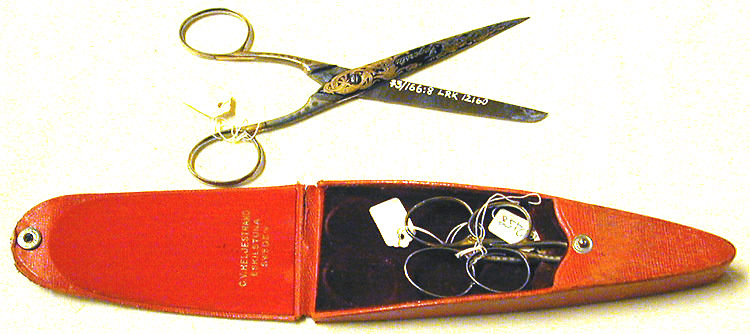 Sax av stål med dekor av etsade drakslingor och ordet Fagersta. De upphöjda områdena i"förgylld" metall. De etsade ytorna svarta. På handtaget etsat så att punkter uppstått.Handtaget är gult. Vid skruven på andra skänkeln 94.