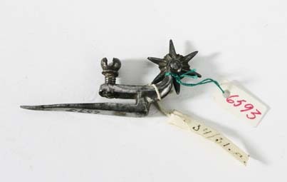 Sporrklinga av stål. Böjd sporrhals 15 mm lång som delar sig framtill i en längre arm i vilken är fäst en skruv för fästande i skons bakkappa. Klinga av stål, stjärnformig med 6 taggar.