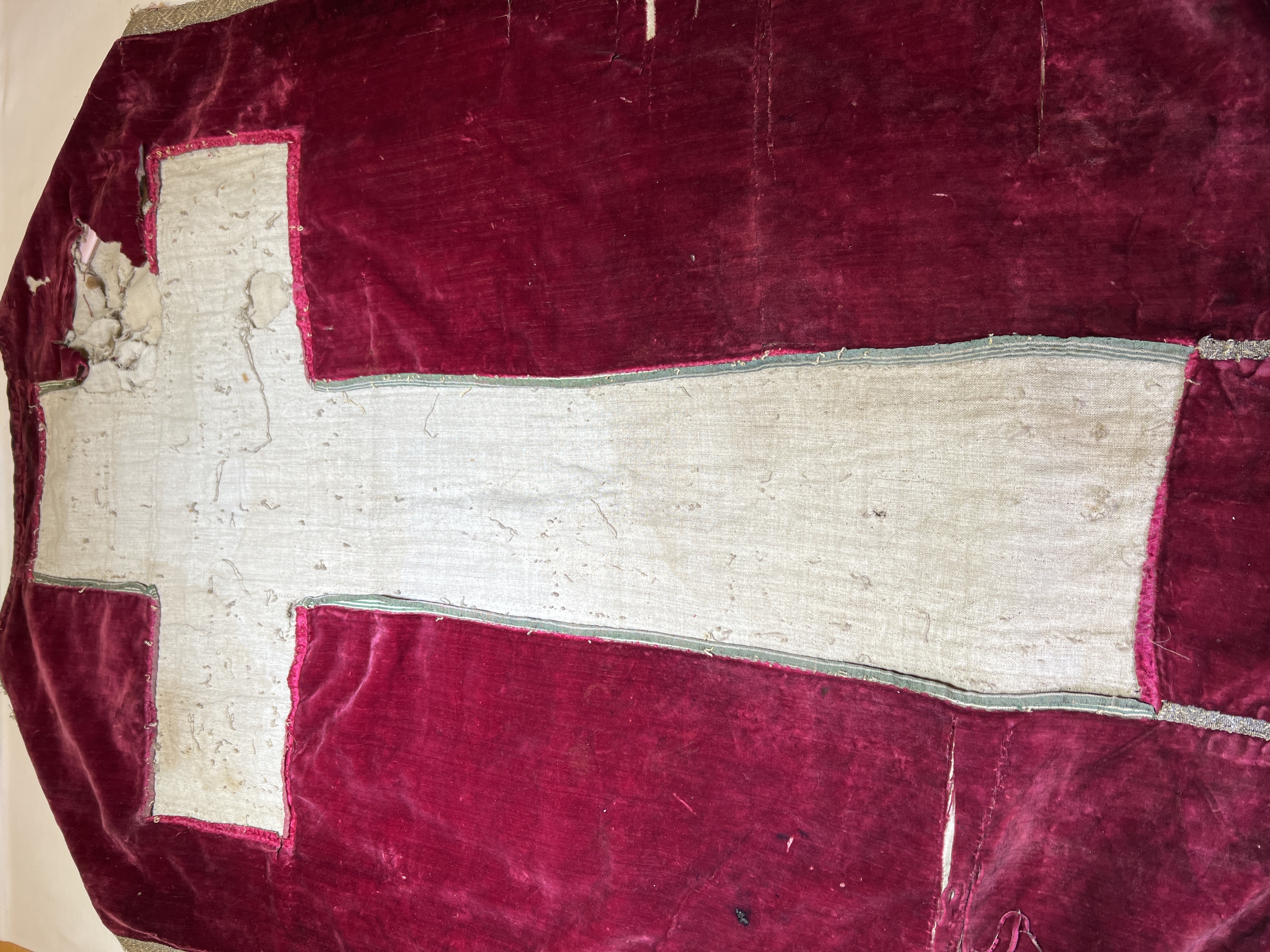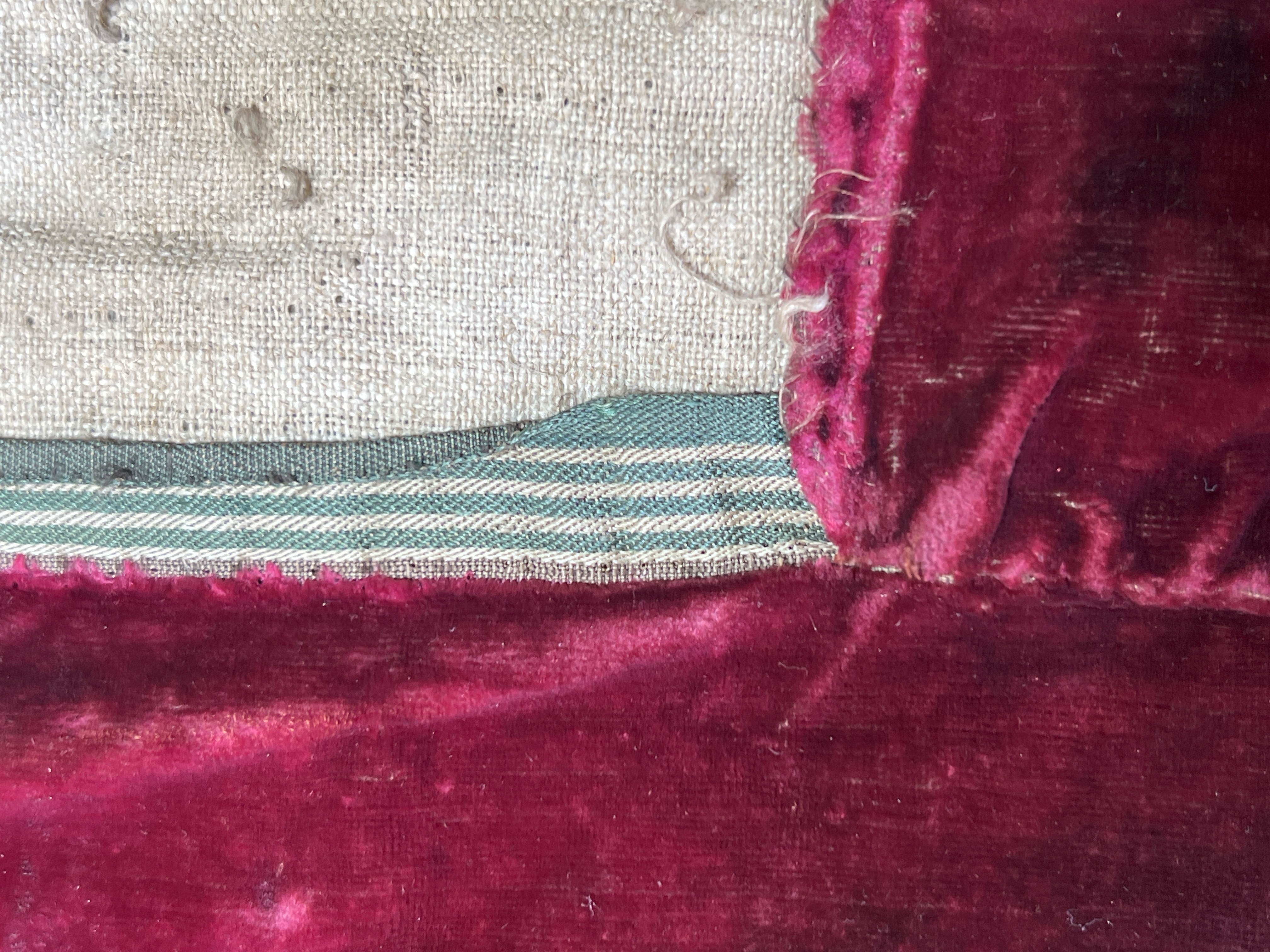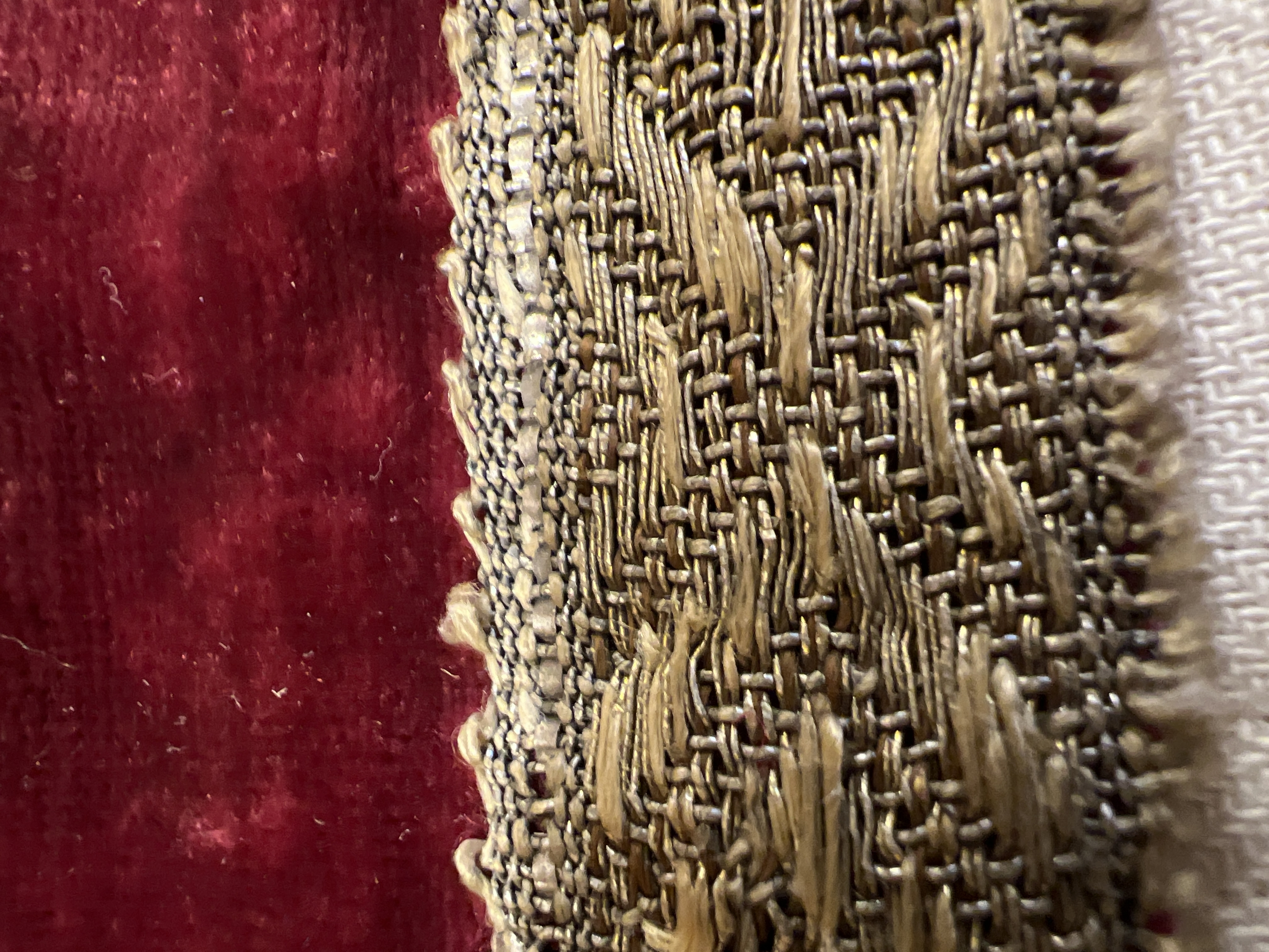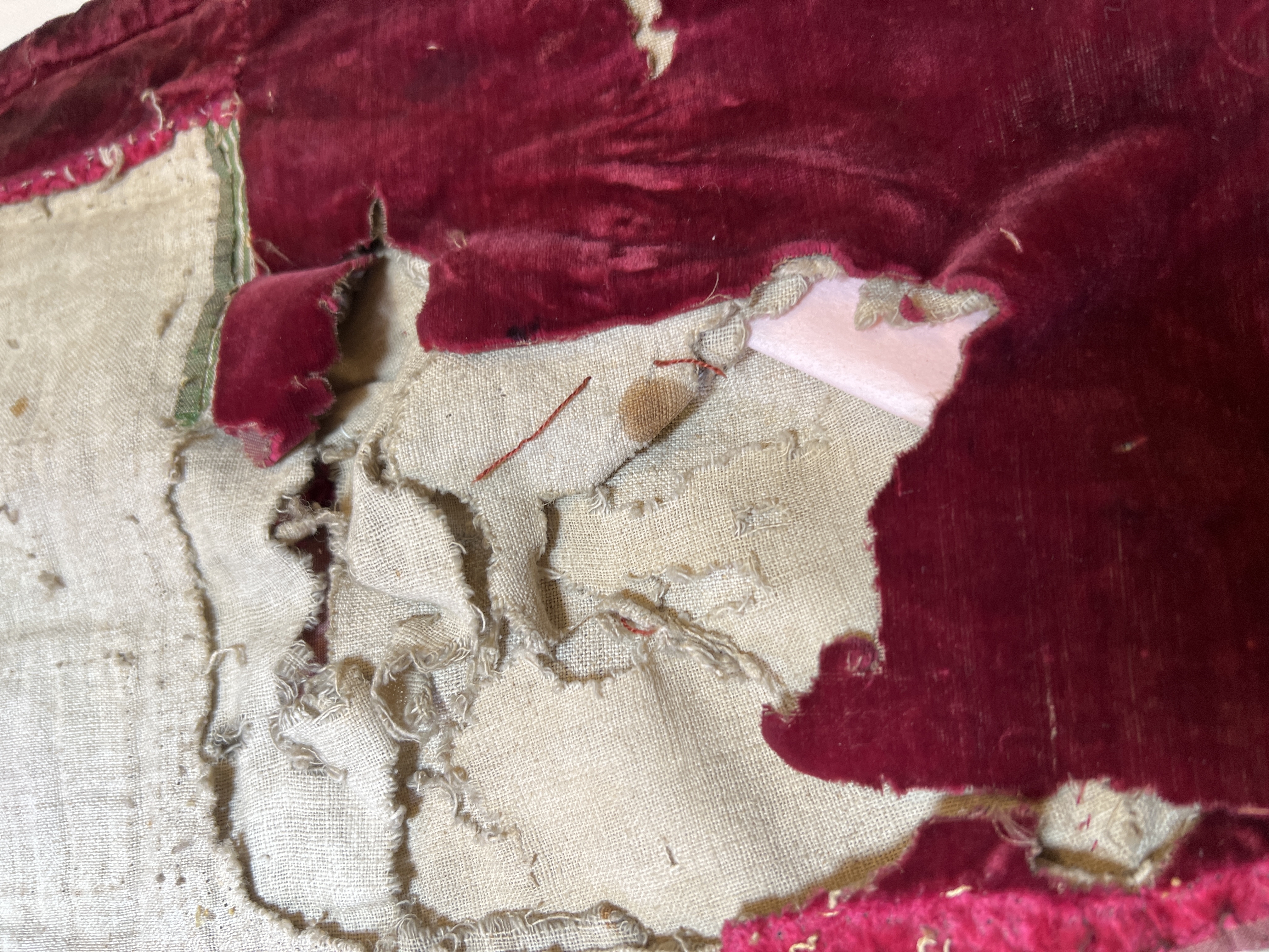 Röd sammet, guldband, vitt lärftfoder. Gåva till SHM 1865.