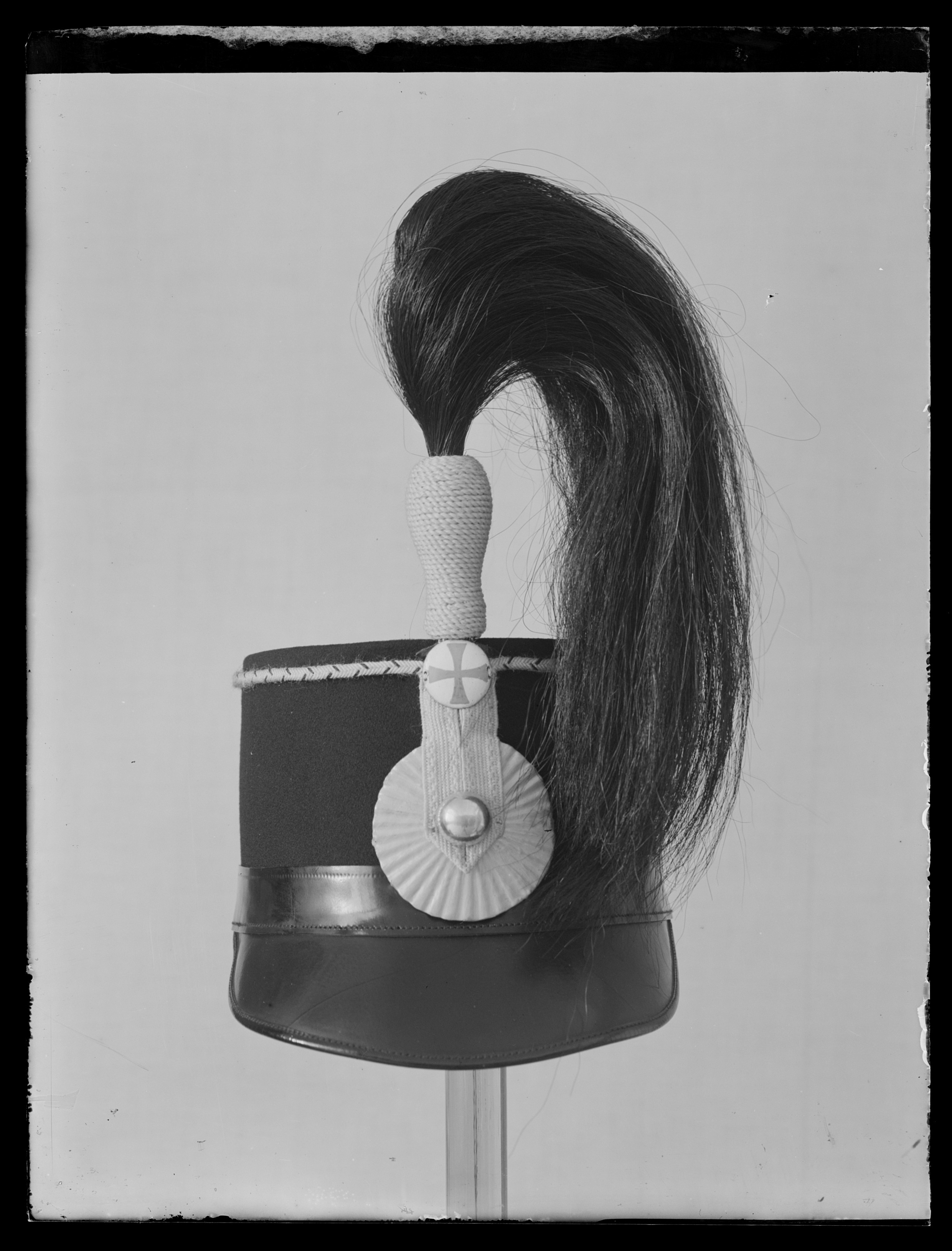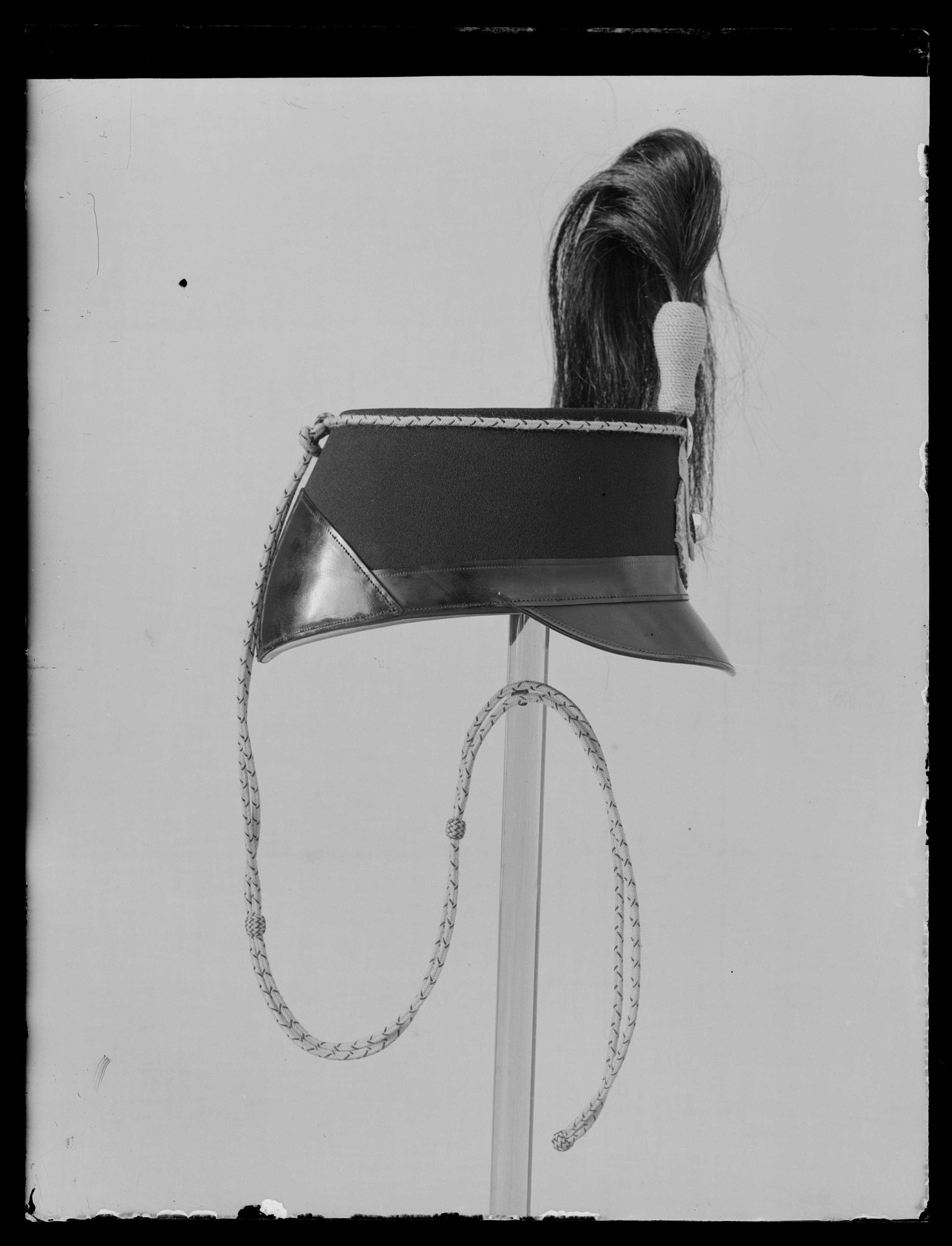 Mössa för kronprinsens husarer. Kokard av gult, lackerat material med förgylld knapp, av regementets lika modell, mitt i. Träns av gult ylle med svarta inslag. Kordong av samma material och typ som tränsen. Päronformad pompon av gult ylle, modell nr 1895-1908. Hängande plym av svart tagel, modell 1880. Mössmärke med rött kors på vit botten. Foder avb lått siden. Hakremmen fäst i öglor i fodret. I kullen stämplat i guld: "C.A. & A.D.EK s //Militärekiperingsaffär // STOCKHOLM". Svettrem av naturfärgat skinn, upptill med tandade utskärningar.