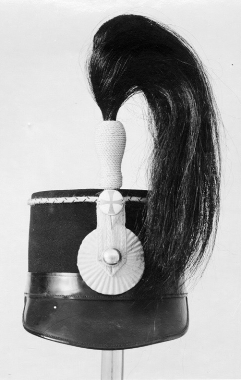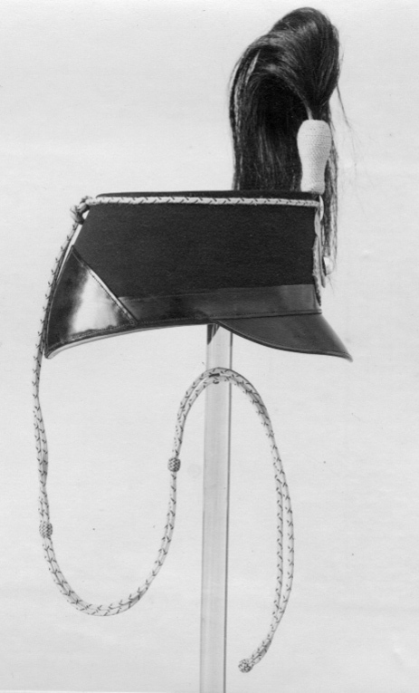 Skärmmössa, modell 1863, för kronprinsens husarregemente, med pompon och plym. För barn.