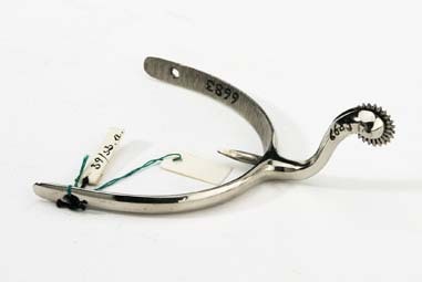 Sporre av förnicklat stål. U-formade släta skänklar med konvex utsida och rundade hålförsedda ändar. På insidan mitt för halsen en spets, l: 11 mm, avsedd att stickas in i klacken. Utdraget s-formad rundstavig hals, l: 34 mm. Liten fintandad klinga, d: 11 mm.