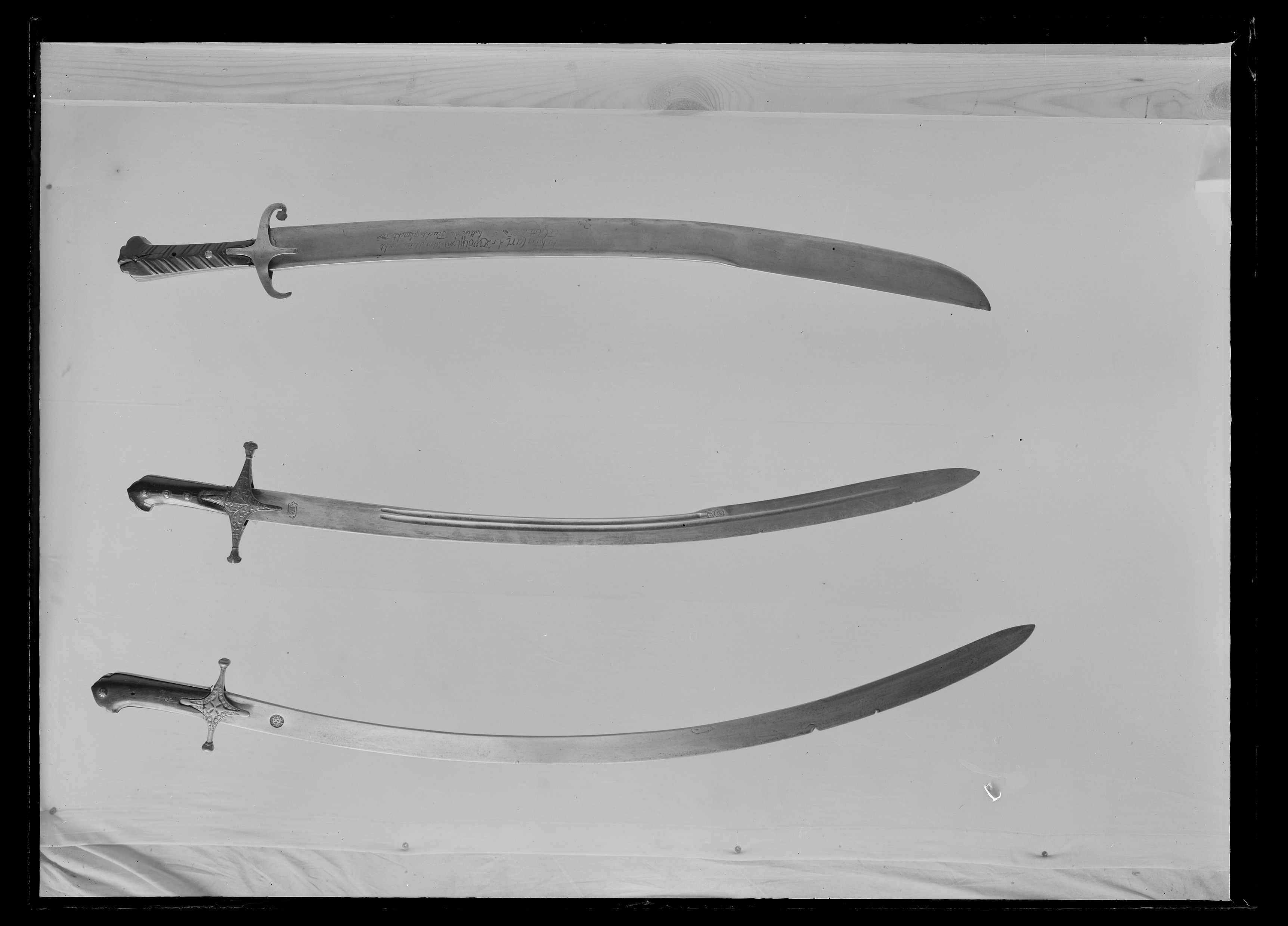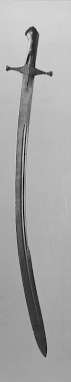 Fäste upptill framåtböjt med fågelhuvudkontur klätt med plattor av mörkbrunt horn fäst med tre nitar. Runt fästets fram- och baksida en skena av silver med ciselerad ranka mot punsad botten. Raka parerstänger med fyrkantigt tvärsnitt och vidgade ändar i ett med styrskenor, dekorerade med ciselerad ranka mot punsad botten. Klinga av damaskerat stål, 34 mm bred vid basen, böjd, eneggad till den tvåeggade 265 mm långa spetsen med jelman. En kortare och en längre hålkäl längs klingryggen. På utsidan invid fästet en etsad orientalisk inskription. Under styrskenan en rund orientalisk etsad signatur. På andra sidan en rektangulär orientalisk etsad signatur. Vid jelmanen etsade voluter.