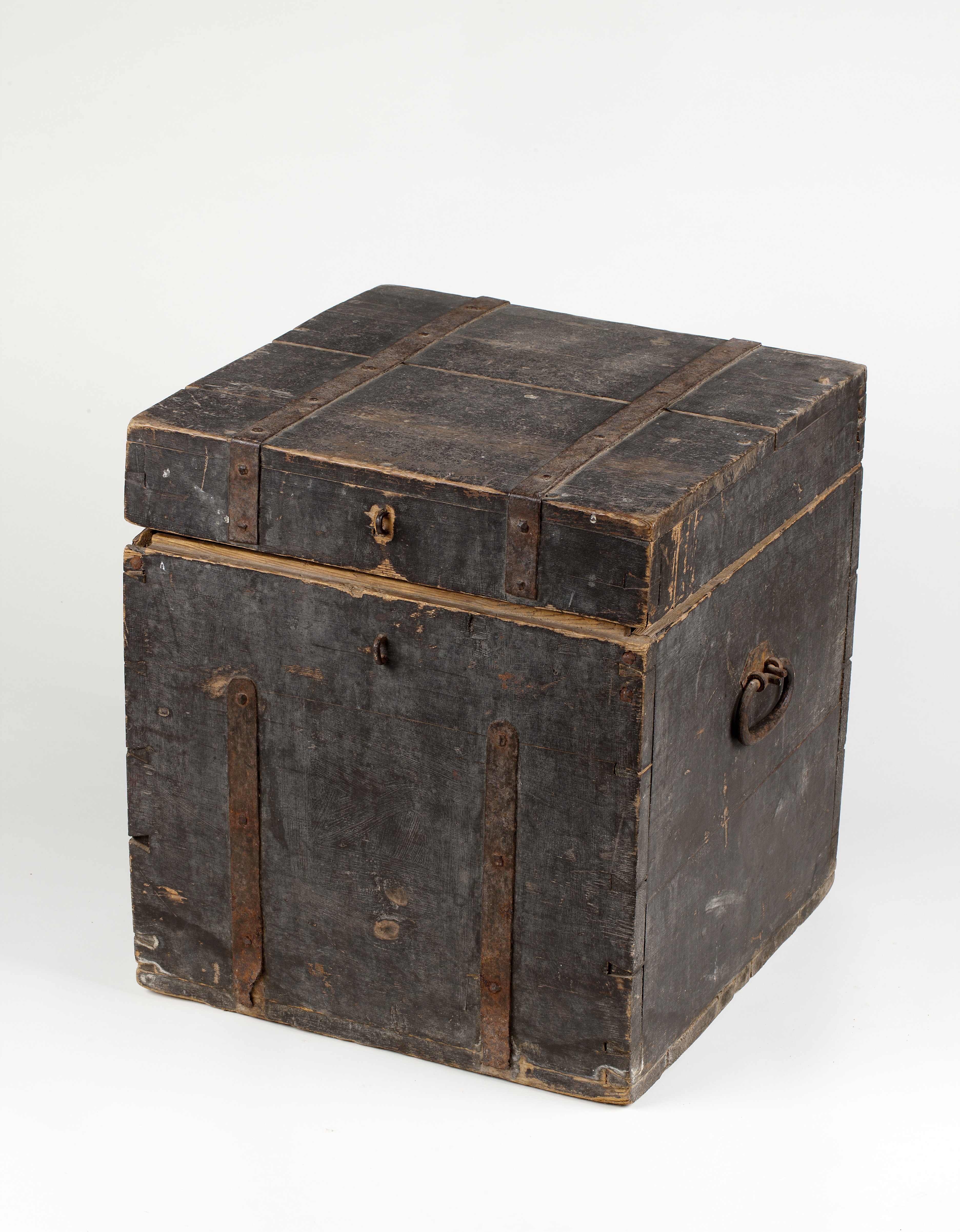 Enkel låda med lock, hasp och hanklar av järn, enkla beslag av bandjärn. Sitsen stoppad och klädd med rött kläde (tuskaft) , fastspikad med mässingstennlikor. Vit animalisk stoppning (renhår ?). Sverige, 1700- tal. "H" på lockets insida, målat med svart färg.