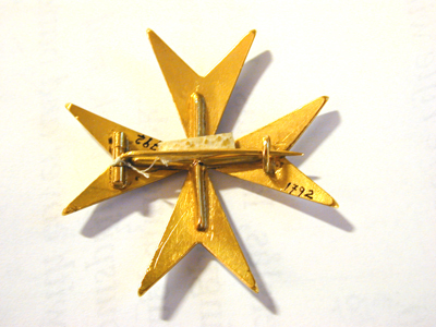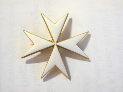 Vitemaljerat malteserkors av förgyllt silver, på baksidan korsformig förstärkning samt säkerhetsnål.