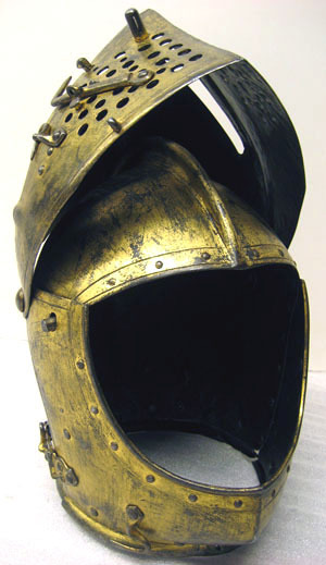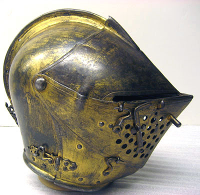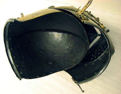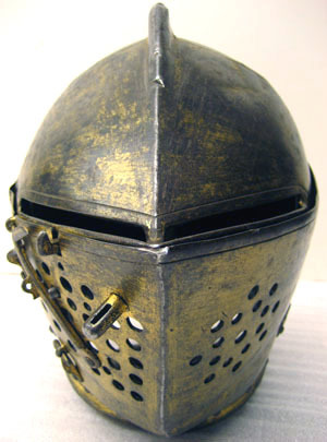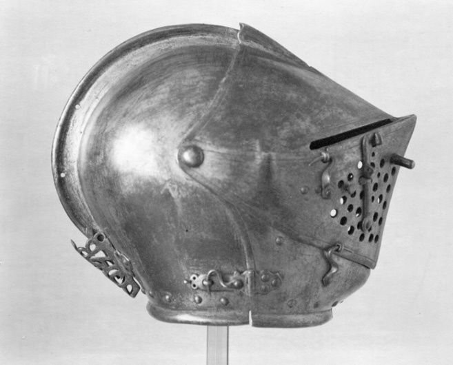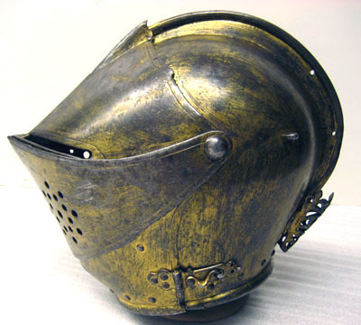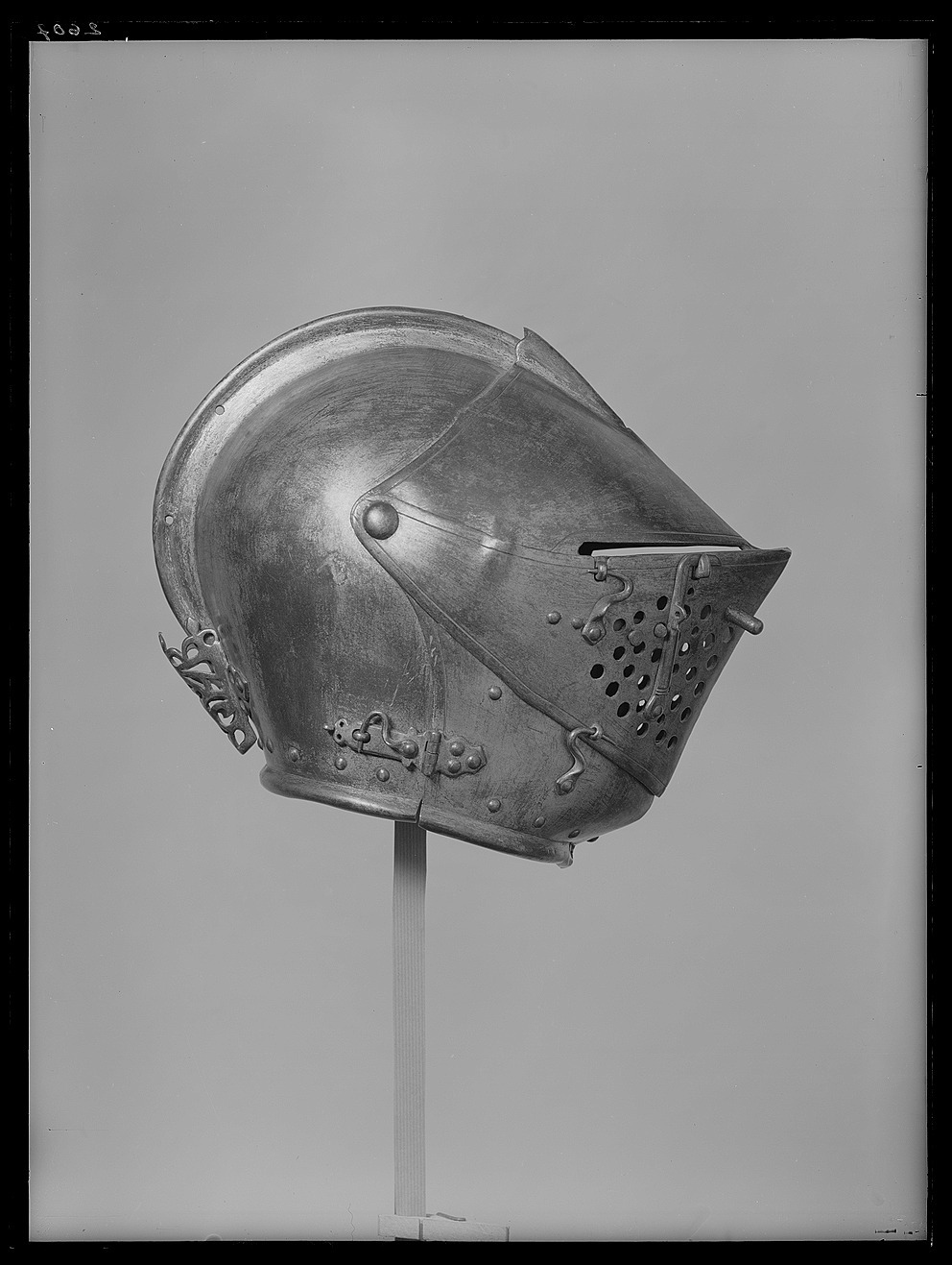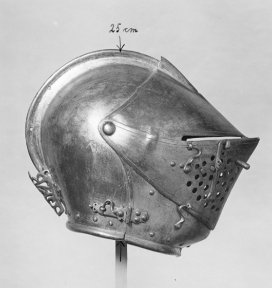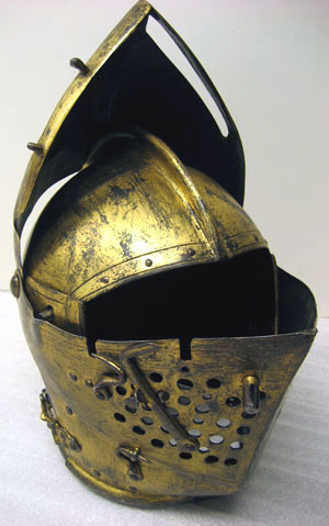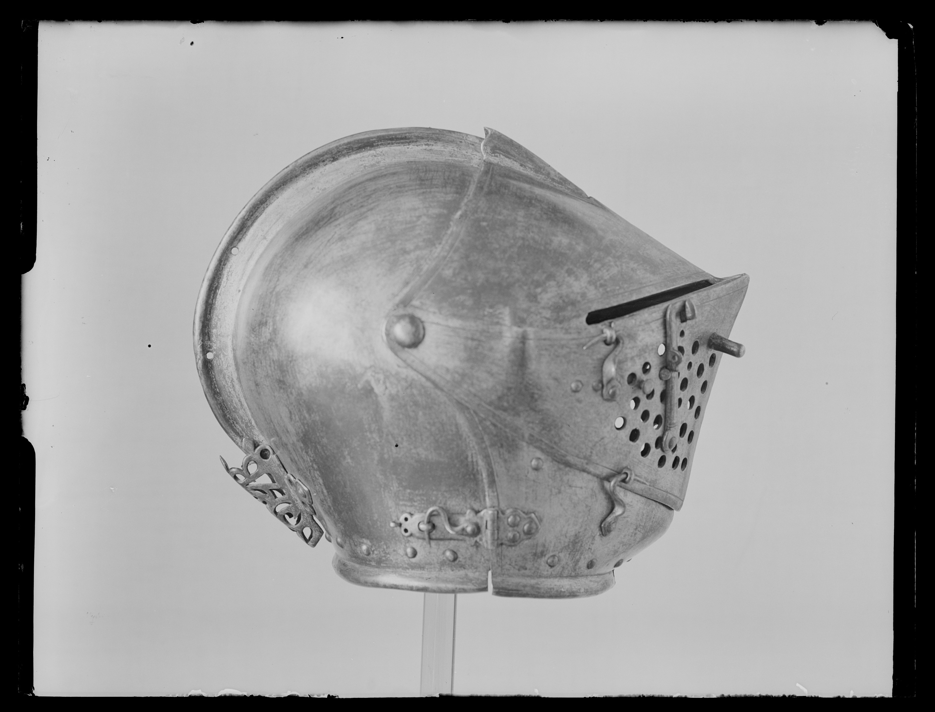 hjelm med slutet visir i 4 delar, kammen smal, starkt bakåtslutande, vid ändan af densamma en genombruten jernhylsa för hjelmbusken, visiret genombrutet, hjelmen att öpna på sidorna, invändigt stoppad och fodrad med rödt sammet.