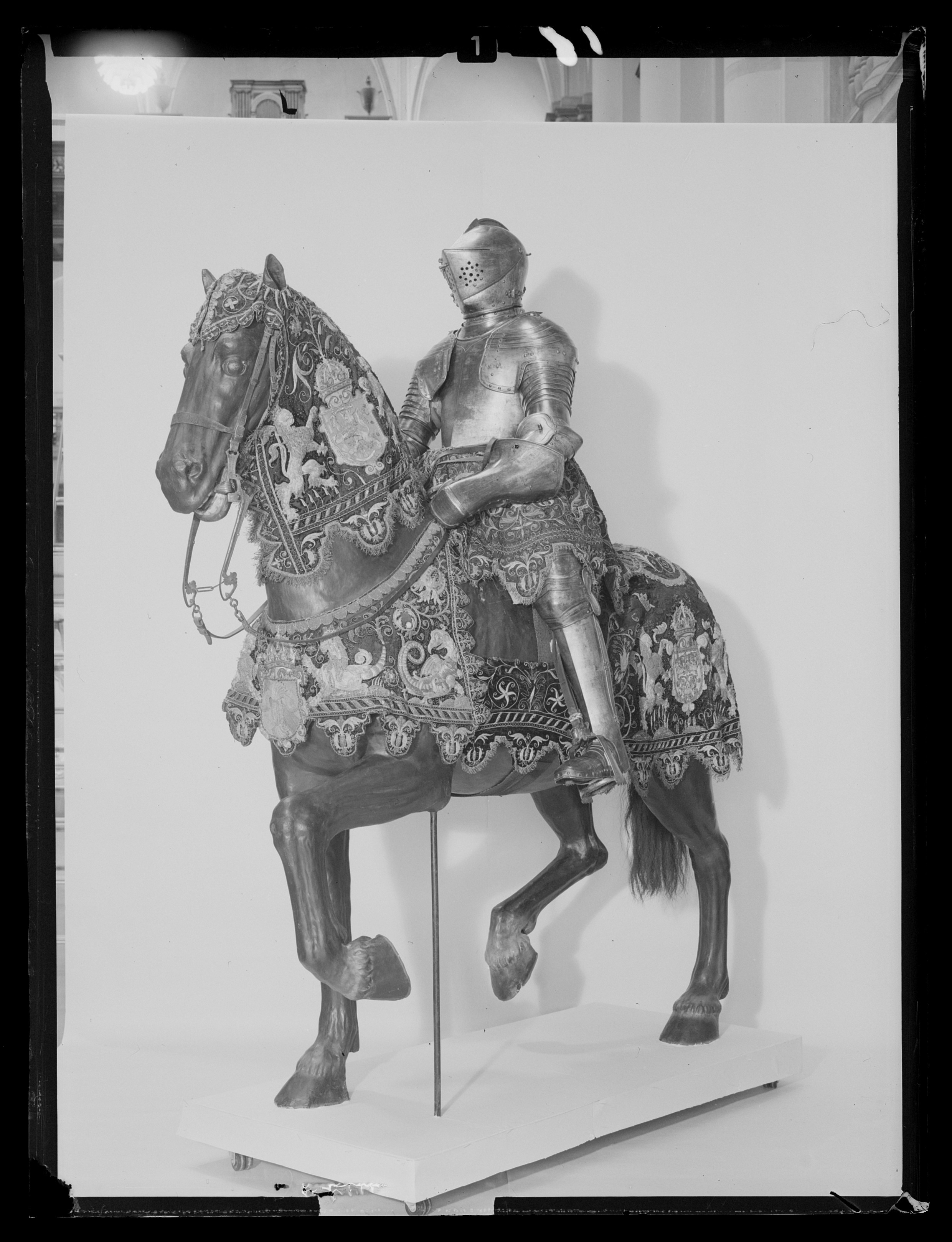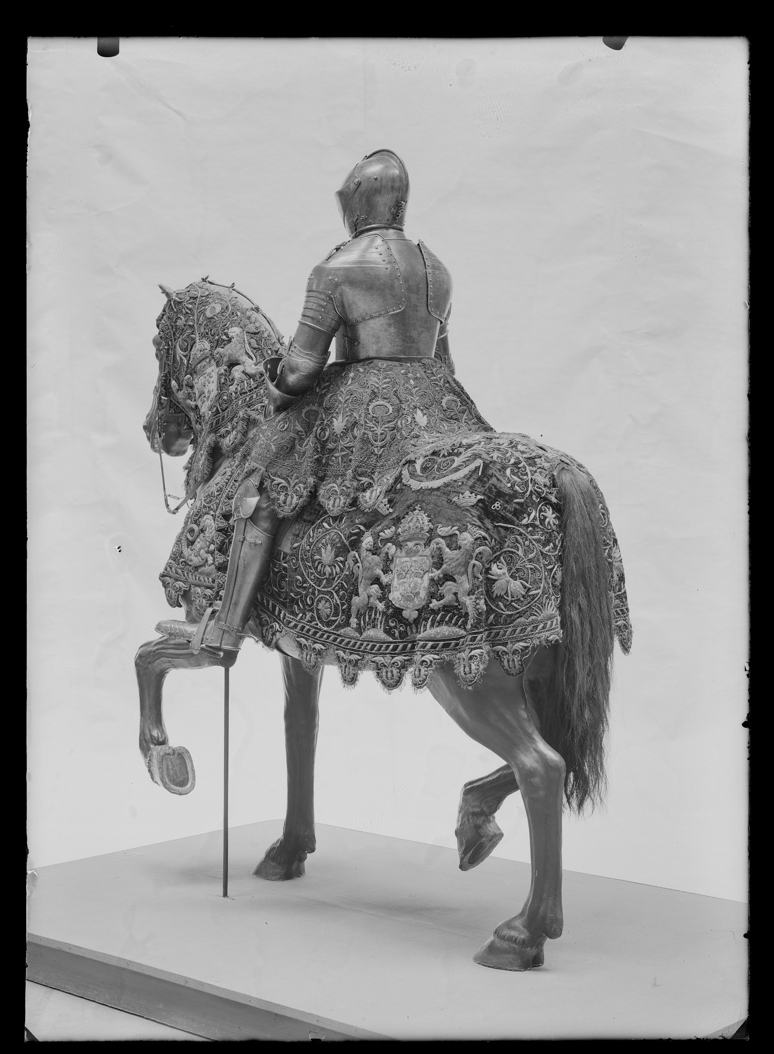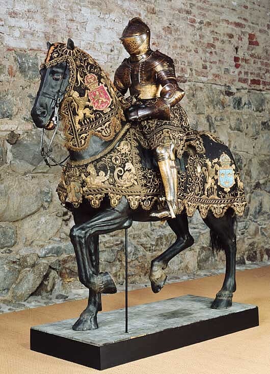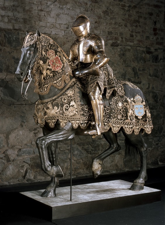 a) Konung Gustav II Adolfs: 1 Tornerhästtäcke af svart sammet, med guldbroderadt perlstickarearbete, bestående af en halskappa med smala, till större delen utnötta guldfransar omkring och på ena sidan ett lejonvapen, båda på rdöt atlas; 1 Bringstycke med guldfransar samt ett Vasavapen; 1 stort Ländstycke i 2ne delar, på en asidan ett broderadt vapen med tre kronor och å den andra sidan ett vapen med lejon på blått atlas med guldfransar rundtomkring /allt murket och sönderfallet/; derpå sittande en karlfigur med förgyldt bröst- coh ryggharnesk, do do armstycken, 1 handske, 1 Höftstycke, förgyldt på kanterne, 2 förgylda lårstycken, 2 do benstycken med fötter och sporrar, 1 do ringkrage och 1 sluten hejlm, fodrad med karduan.
