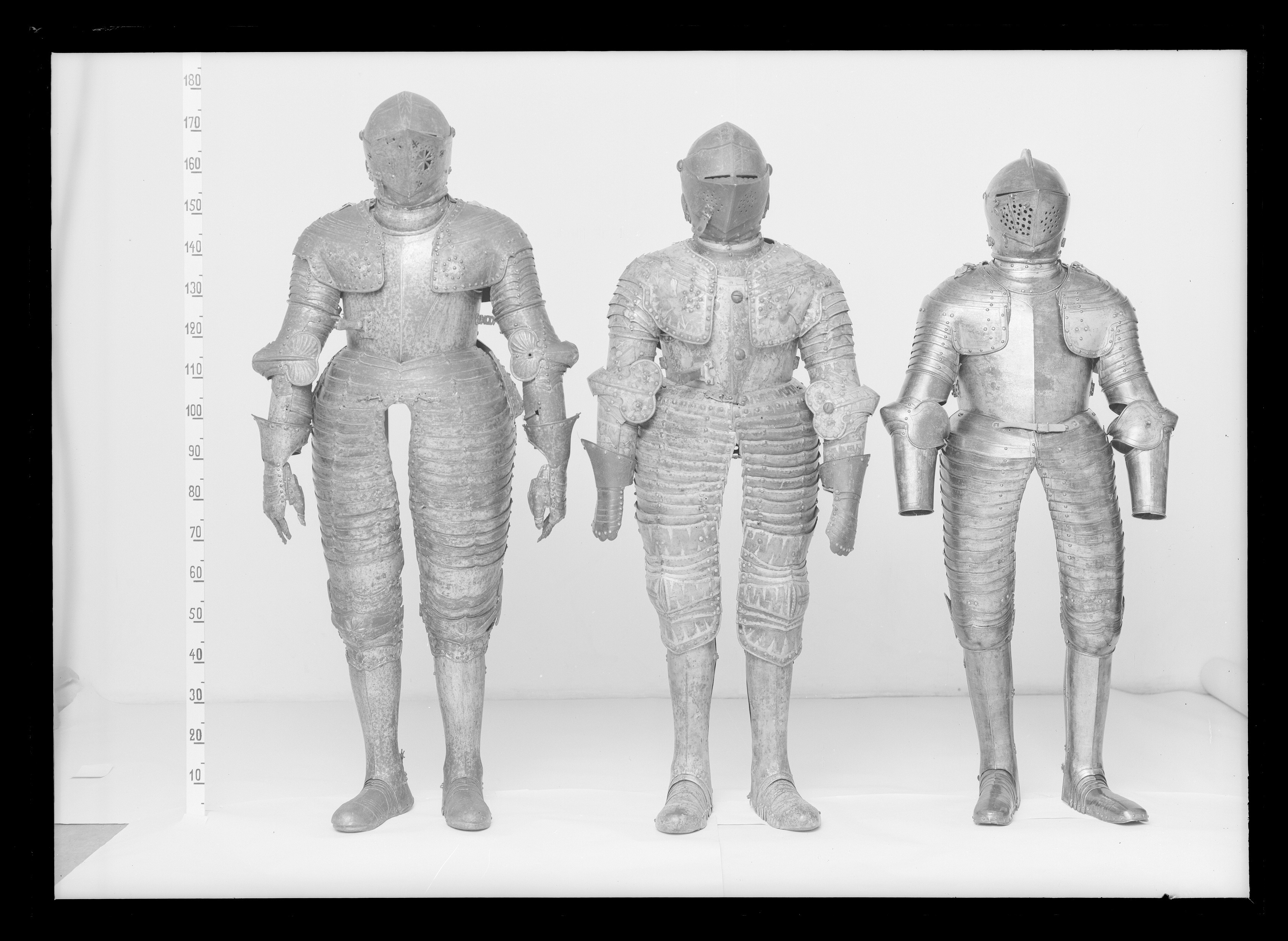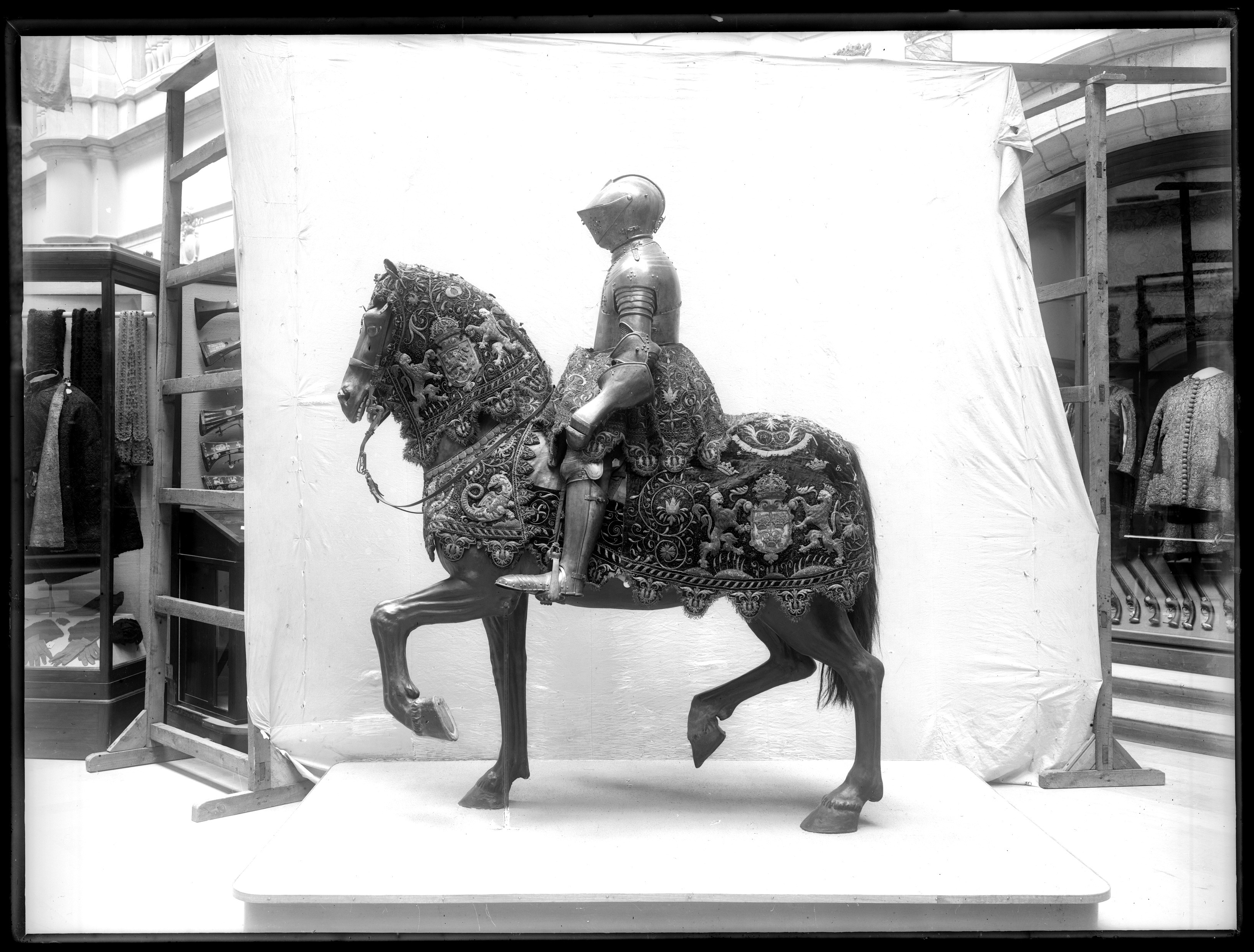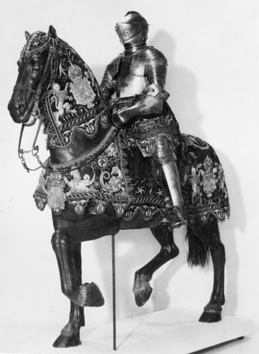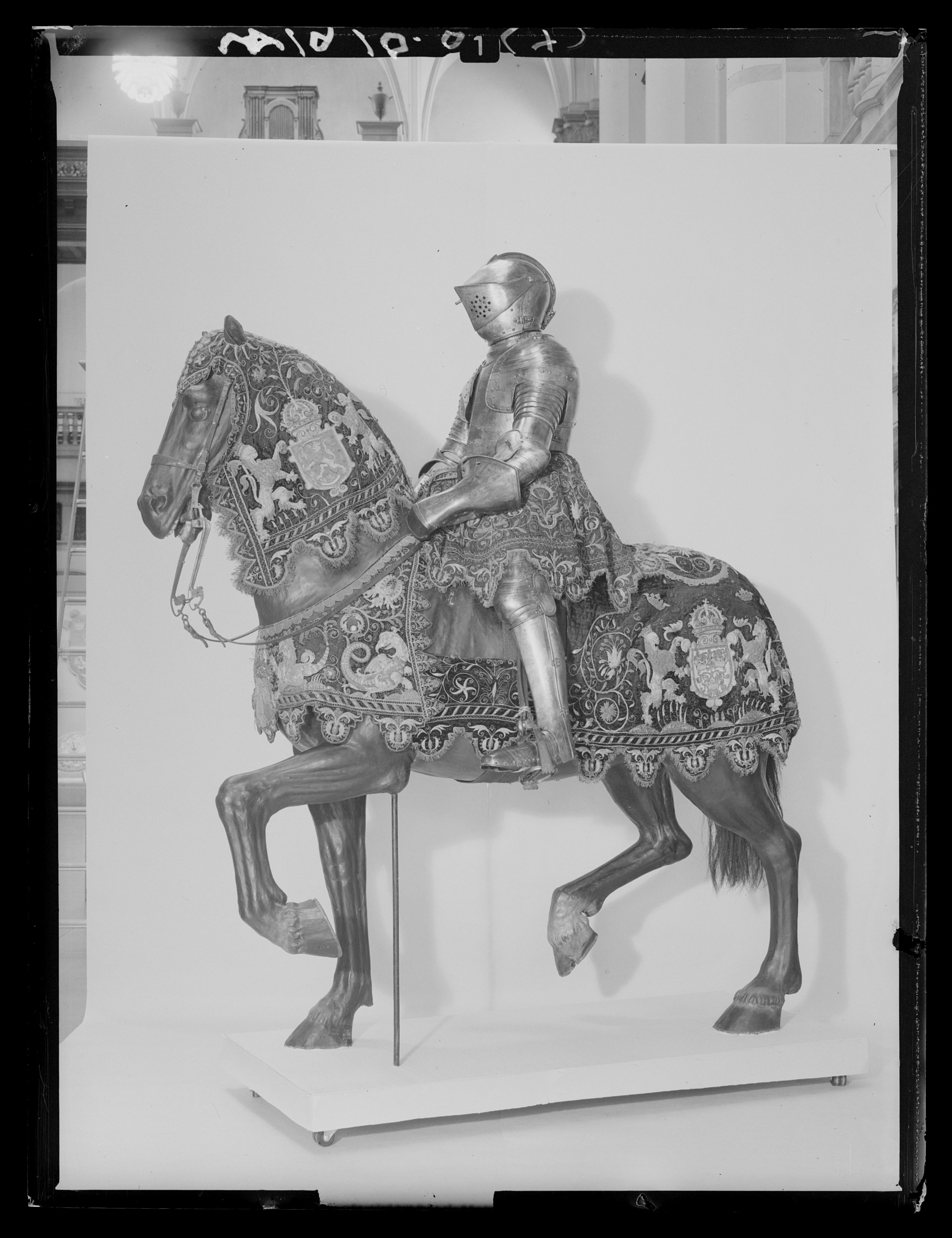 a) Konung Gustav II Adolfs: 1 Tornerhästtäcke af svart sammet, med guldbroderadt perlstickarearbete, bestående af en halskappa med smala, till större delen utnötta guldfransar omkring och på ena sidan ett lejonvapen, båda på rdöt atlas; 1 Bringstycke med guldfransar samt ett Vasavapen; 1 stort Ländstycke i 2ne delar, på en asidan ett broderadt vapen med tre kronor och å den andra sidan ett vapen med lejon på blått atlas med guldfransar rundtomkring /allt murket och sönderfallet/; derpå sittande en karlfigur med förgyldt bröst- coh ryggharnesk, do do armstycken, 1 handske, 1 Höftstycke, förgyldt på kanterne, 2 förgylda lårstycken, 2 do benstycken med fötter och sporrar, 1 do ringkrage och 1 sluten hejlm, fodrad med karduan.
