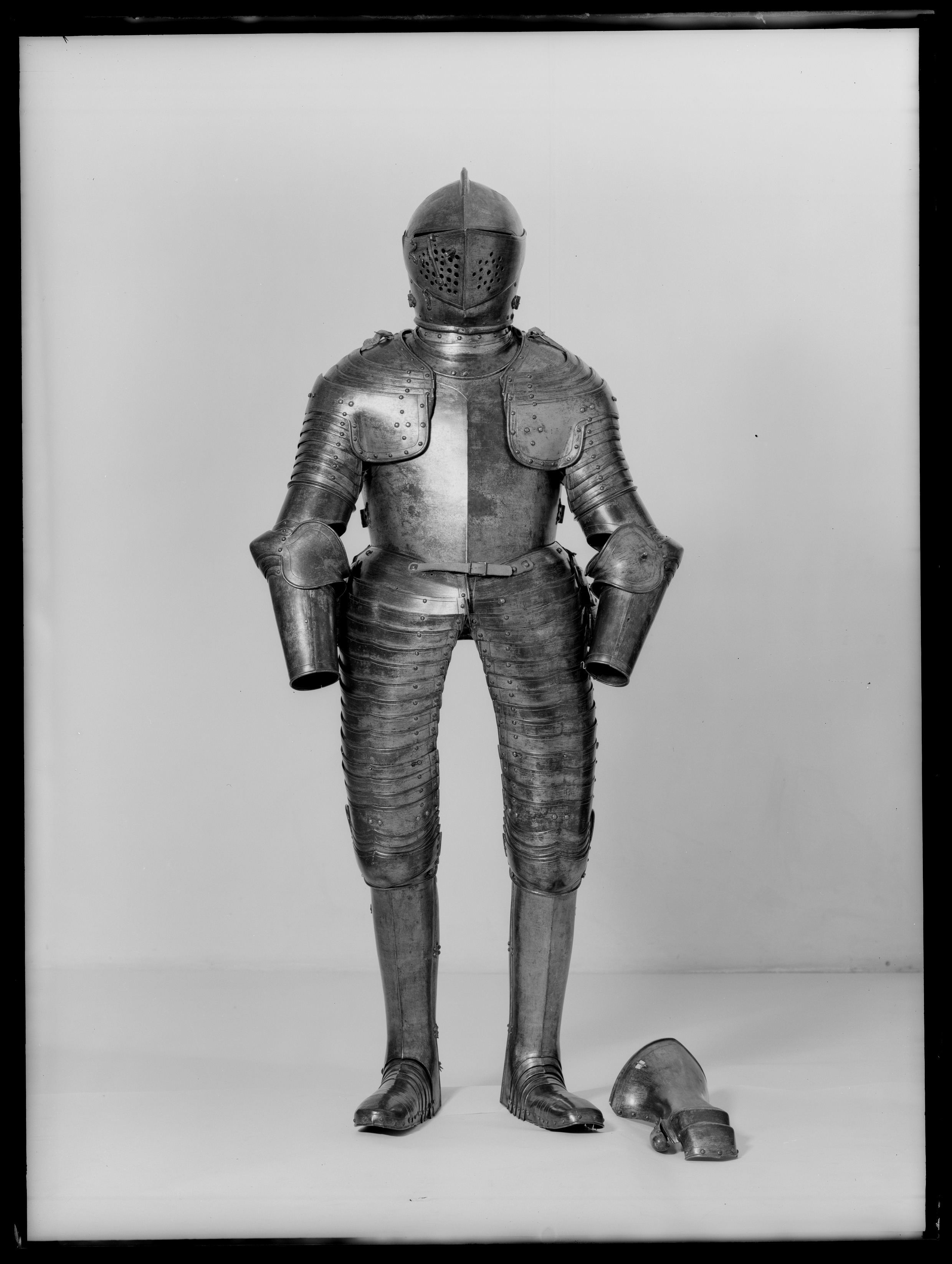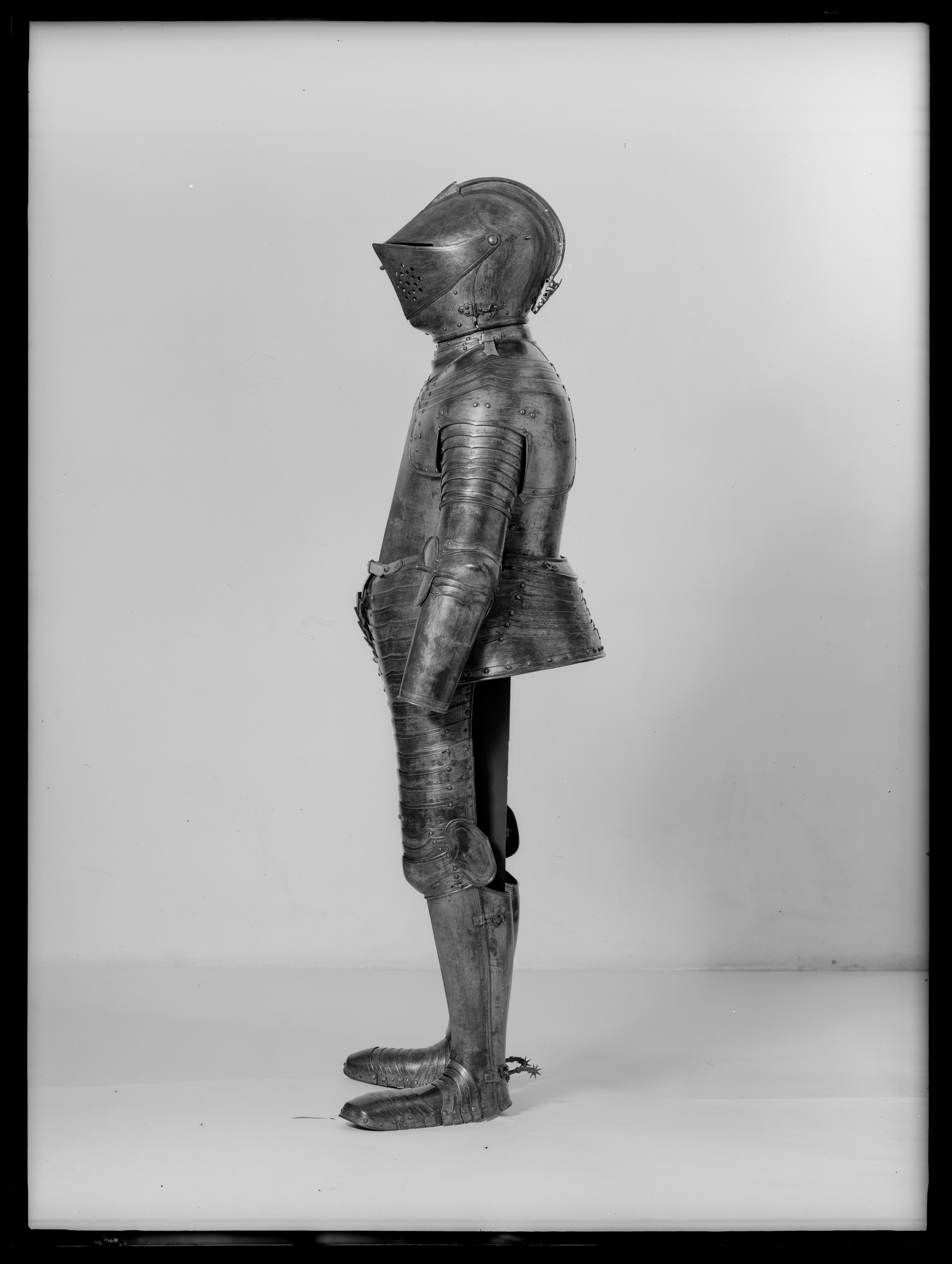 derpå sittande en karlfigur med förgyldt bröst och ryggharnesk. 2 armstycken af D:o D:o 1 Handske. 1 Höftstycke af D:o D:ot på kanterna, 2 lårstycken af D:o D:o 2 benstycken af D:o D:o med fötter och sporrar, 1 ringkrage af D: D:o 1 Sluten Hjelmaf messing, fodrad med karduan.