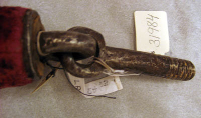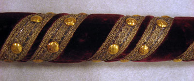 Lång rund bärstång av trä med förstärkning av metallskoning upptill. Klädd med röd sammet och dekorerad med ett vävt band av gulbeige silkestråd, silvertråd och silverlan virat runtom, med två rader intill varandra. På bandet sitter förgyllda nitar. I övre delen en 85mm lång metallspets fästad vid en rund ring av metall. I nederdelen blottas trästomen.
