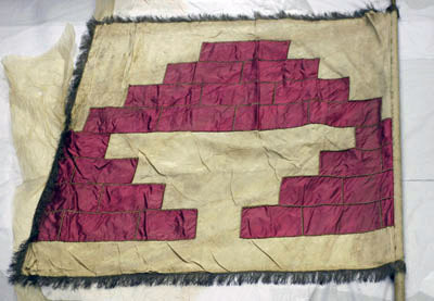 På högersidan den grevliga ätten Posses hjärtvapen. Duken av ljusgul sidendamast med blommönster. Vapnet av röd atlas med konturer av svart och brun sammet. Vänstersidan av ljusgul sidendamast med blommönster. Lilla riksvapnet i blå taft med bemålade detaljer. Duken fästad vid stången med en fastnitad bård av guldtråd. Frans av tvinnad guldtråd. Stång av furu bemålad gul. Fanspets med blad och holk av brännförgylld mässing. Droppformat blad med genombrutet spegelmonogram "G" krönt av sluten krona. Avslutande ornament upptill av granat med tre flammor. Holken konturerad och svagt avsmalnande uppåt.