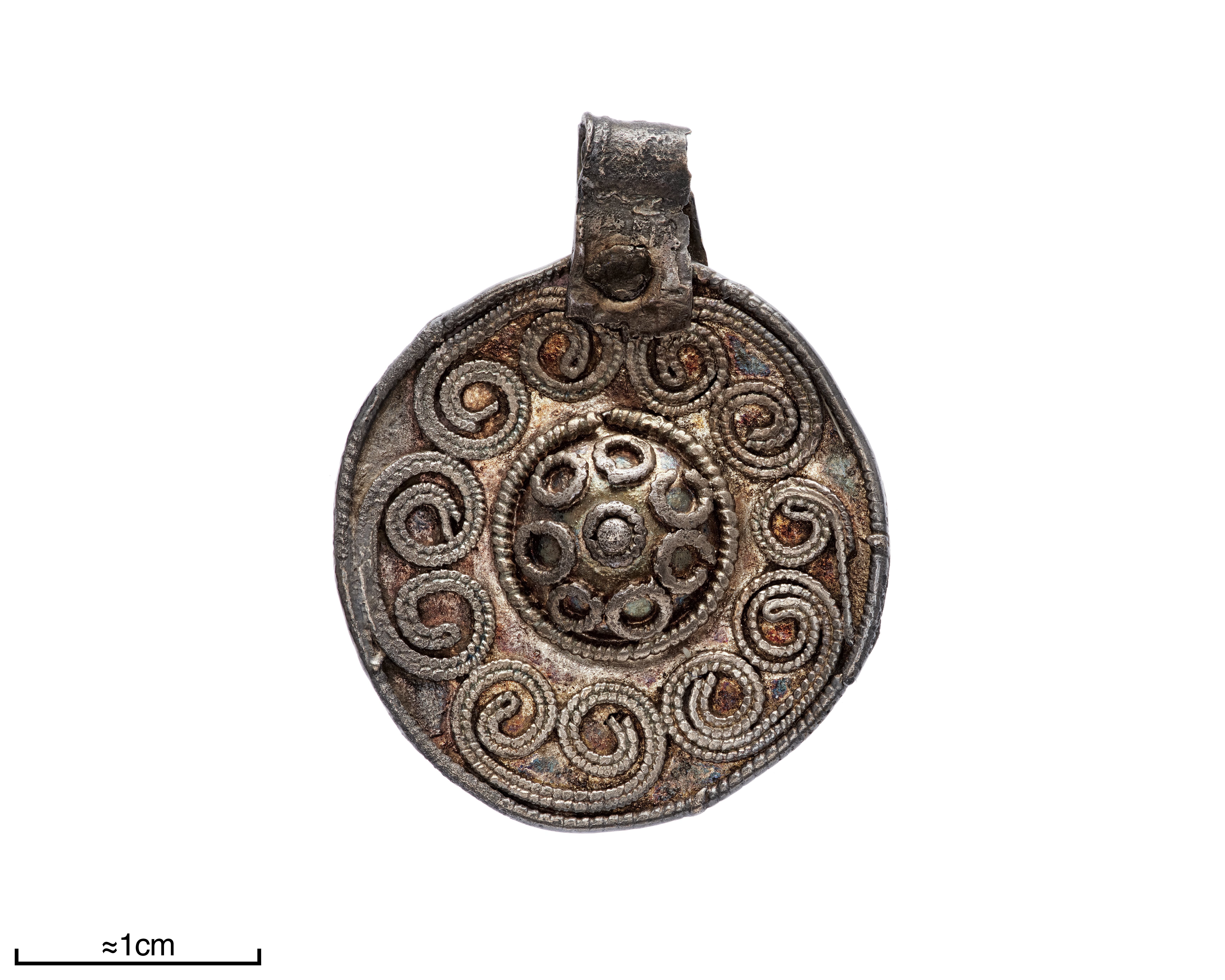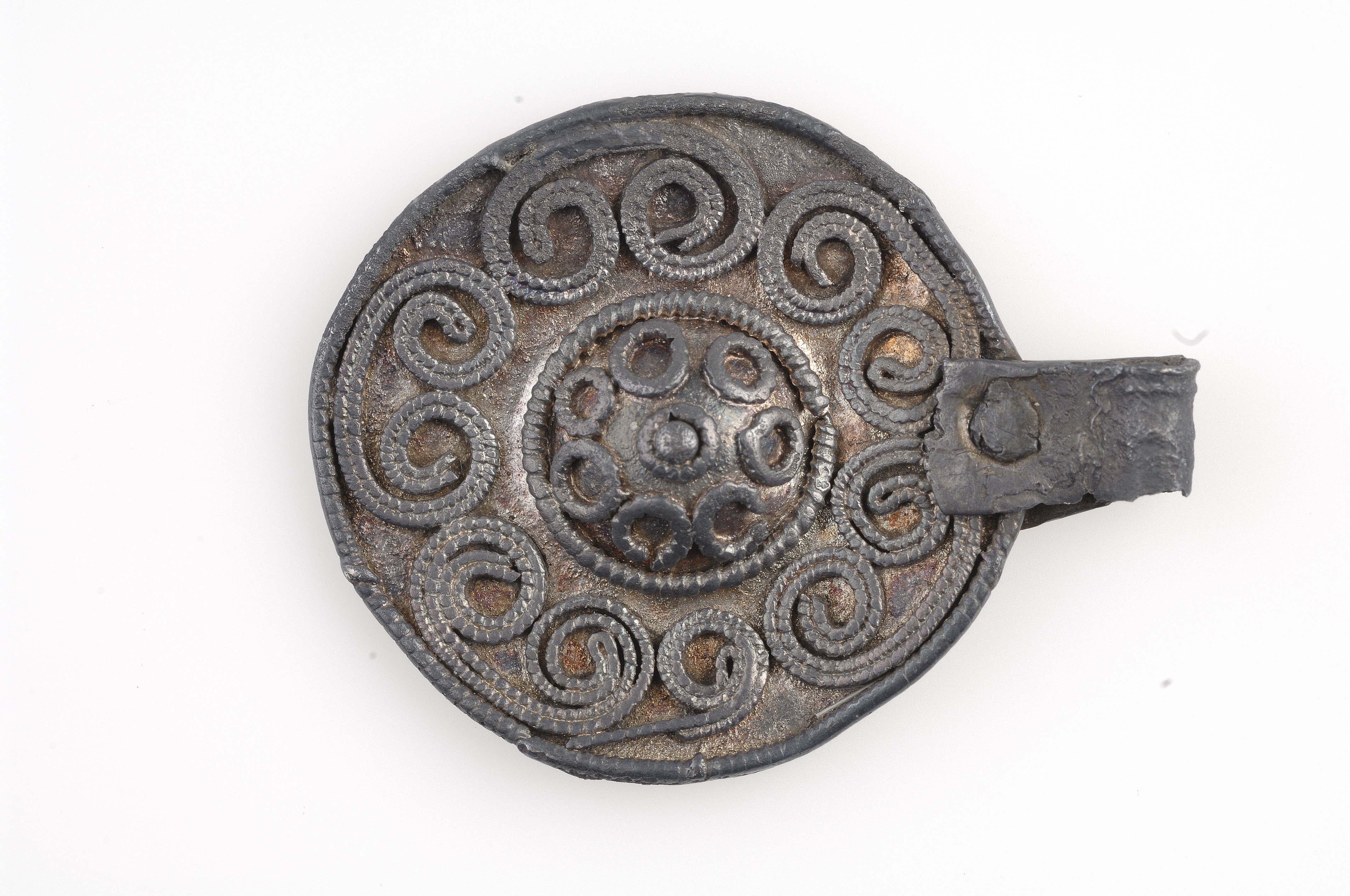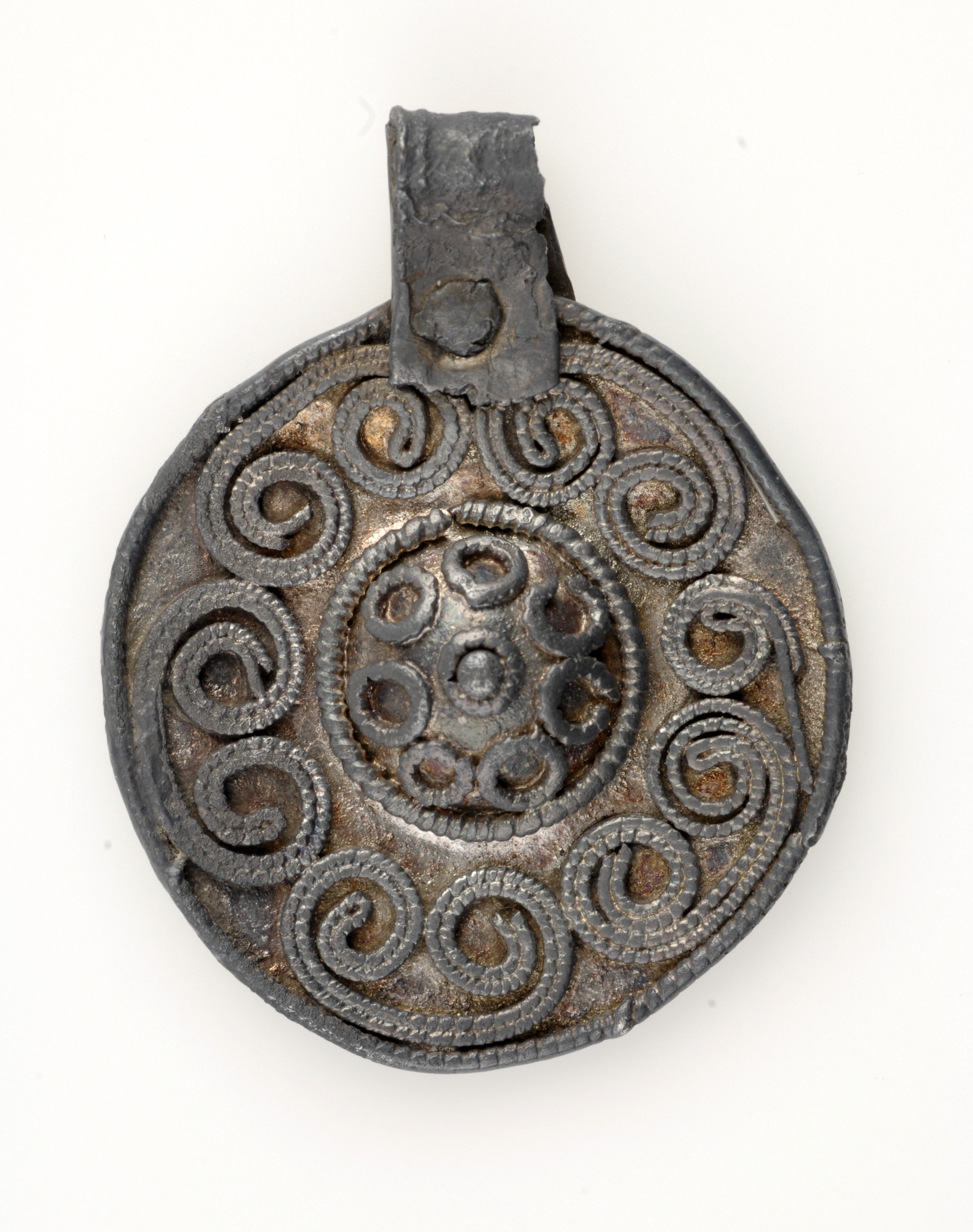 Förgyllt. Filgranornamentik i form av sex dubbelspiraler. I centrum en rel stor halvsfärisk buckla. Fästeöglan av ett fastnitat bandformigt silverbleck, troligen sekundärt tillkommet.