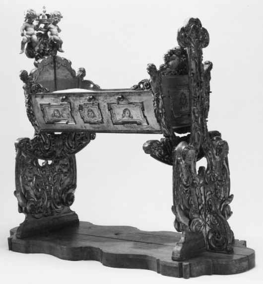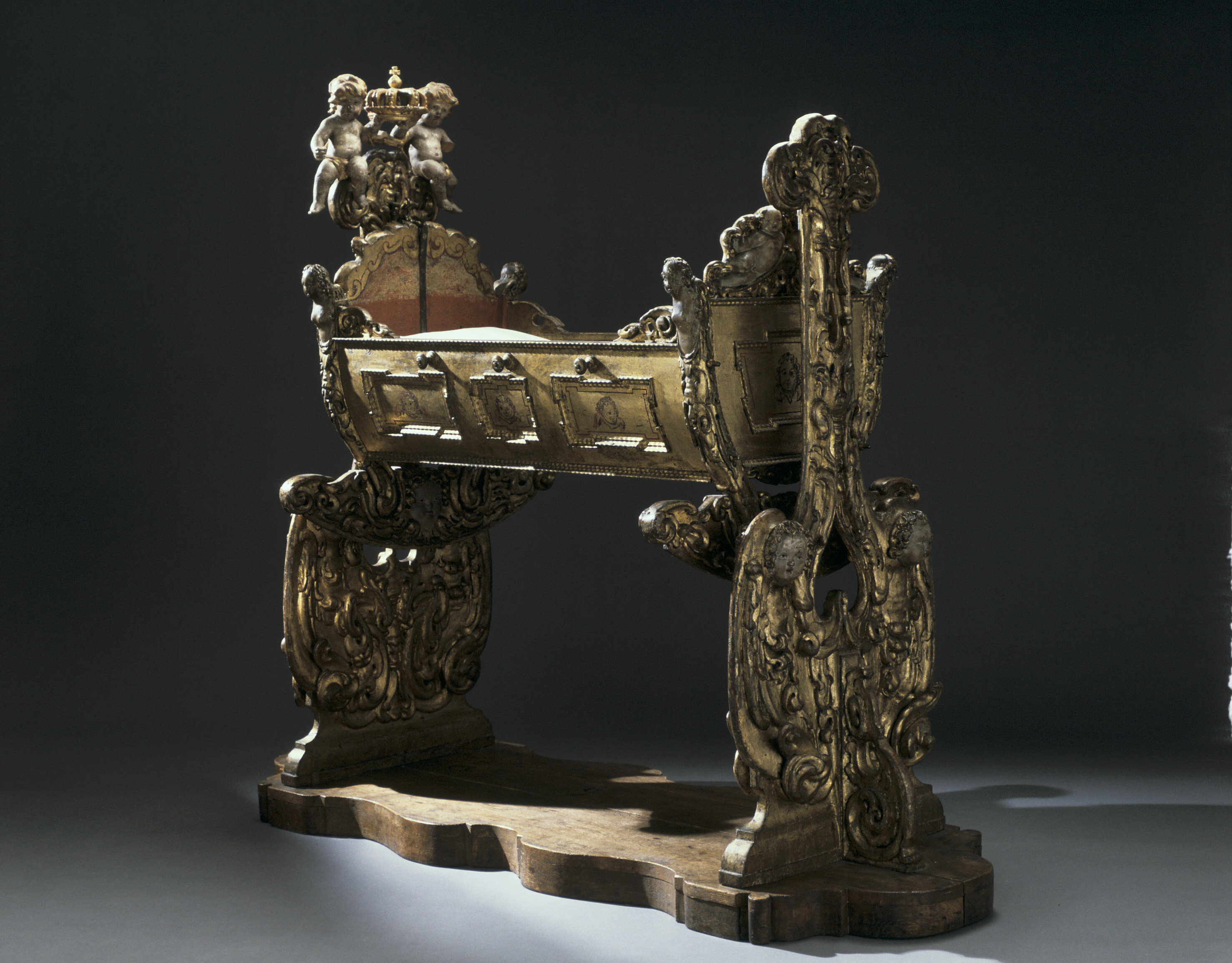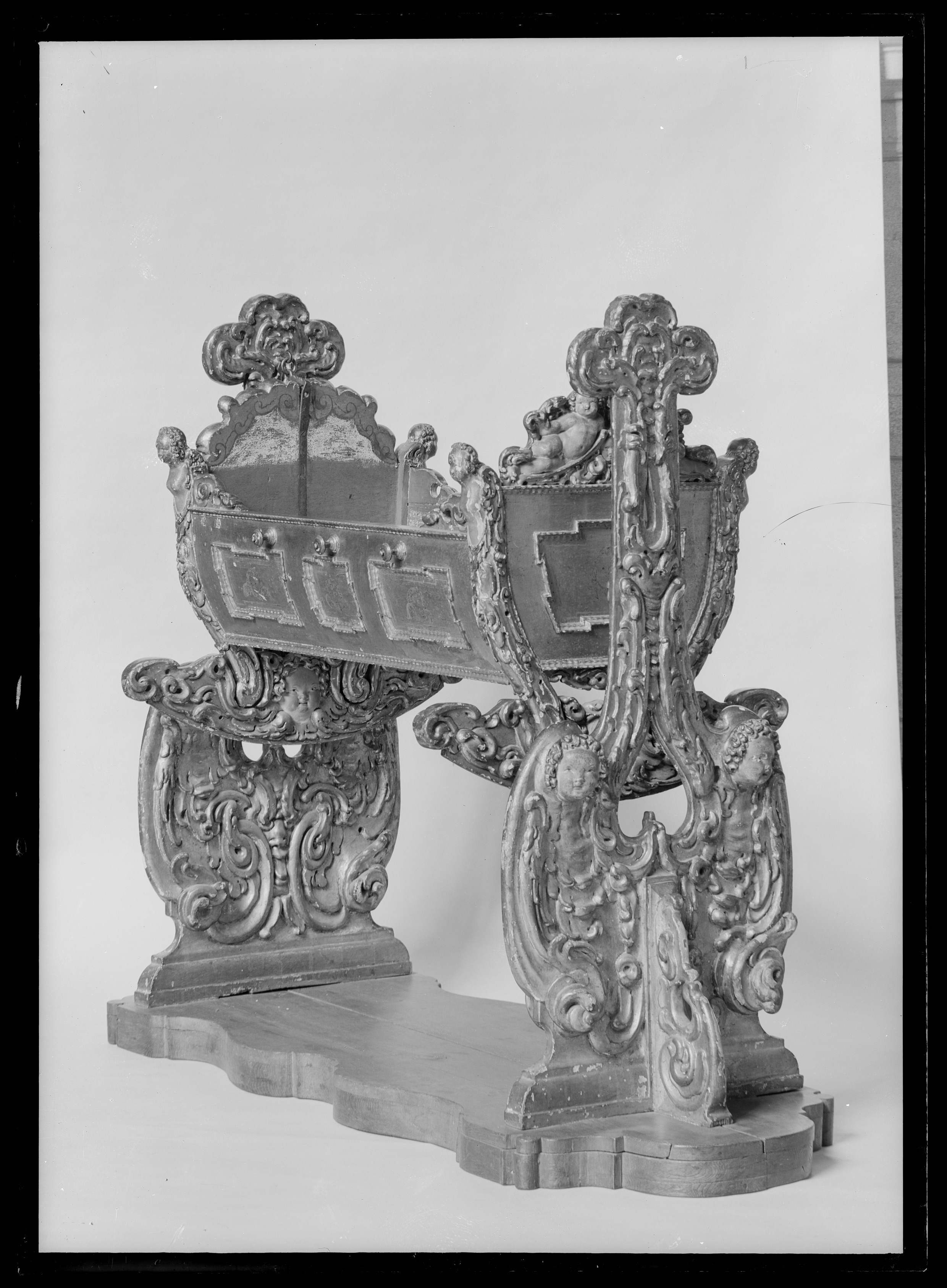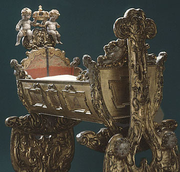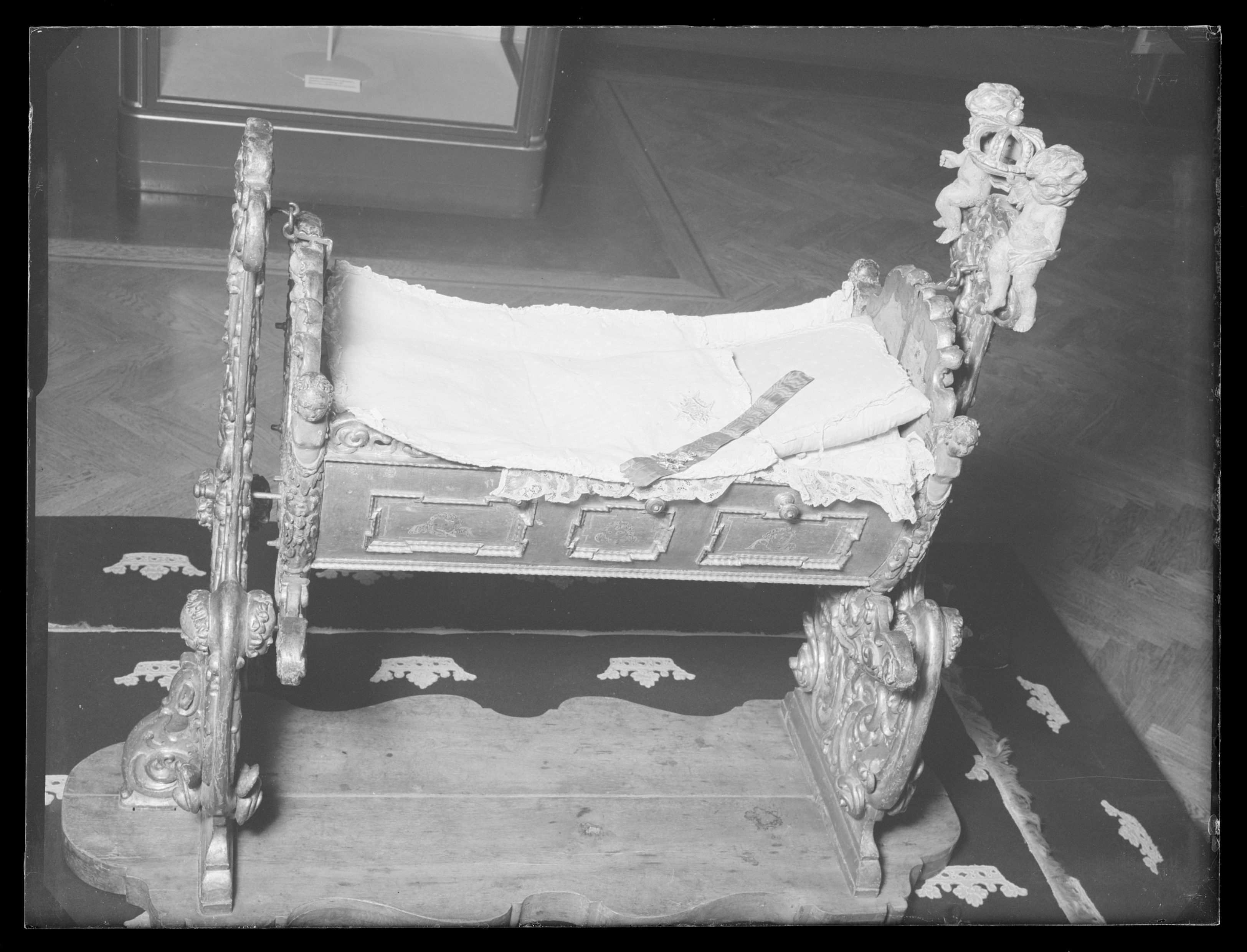 Karl XI:s förgyllda vagga har sedan mitten av 1600-talet fungerat som kungahusets ceremoniella paradvagga. Vaggan har använts vid kungliga dop och är det enda av Livrustkammarens föremål som fortfarande kan sägas vara i bruk. Detta skedde senast den 22 maj 2012 när prinsessan Estelle döptes - den första prinsessan som är född till tronarvinge. Vaggan var ursprungligen en gåva till drottning Hedvig Eleonora till sonen Karls dop den 9 december 1655 av hennes föräldrar, hertig Fredrik III av Holstein-Gottorp och Maria Elisabeth av Sachsen. Liknande vaggor skänkte hertigparet även till sina äldre döttrar och deras förstfödda barn. Barnsängen, eller vaggan av skulpterat, förgyllt och målat trä består av en vaggsäng, hängande mellan stolpar på en sockel. Plan, profilerad och målad sockel, som ursprungligen (inv.1691) varit överklädd med röd sammet. Vaggsängen har förgyllda och skulpterade gavlar med ramar och tvärställda medar, överst på vardera gaveln en ring, som fästs på krok på stolparnas övre del. Den skulpterade dekoren består av broskornamentik med änglahuvuden mitt på medarna mindre änglahuvuden vid gavelhörnen samt motställda, vilande putti som krön. Plana lång- och kortsidor. På kortsidorna ett i svart och rött målat putti-huvud omramade av brutna ramar med hopplist. Tre träknoppar. Sängen invändigt rödmålad, bottnen lös, spår av svart färg runt kanten. De två stolparna är bredare nedtill, med omvänt hjärtformigt urtag, flankerat av putti-huvuden. Smal övre del med droppformigt urtag, 3-passformat krön. På utsidan vid stolparnas bas ett stöd. Ena stolpen kröns av två putti, hållande en kungakrona, som har 7 små hål i kronringen. Vaggan är använd vid dop av prinsar inom det svenska kungahuset, senast H. K. H. Prins Carl Philip 1979 (lån 79:6) och den 22 maj 2012 när prinsessan Estelle döptes (lån 2012:02) - . (Från Gustav III:s dop och fram till att man vid prinsessan Eugénies dop initierade en ny tradition med en särskild dopvagga för prinsessor användes Karl XI:s dopvagga för både prinsar och prinsessor). Se Rangström (2011), s. 38. Enl. inv. 1867 deponerad i St. historiska museum 1868, återlämnad jäml. k. brev 1887-06-17.