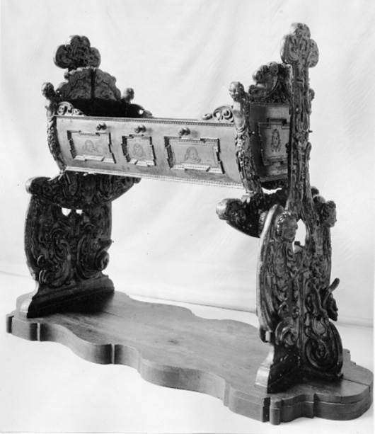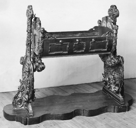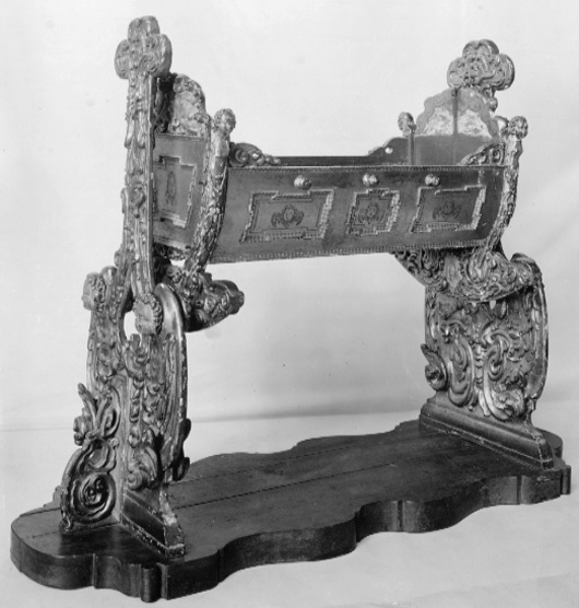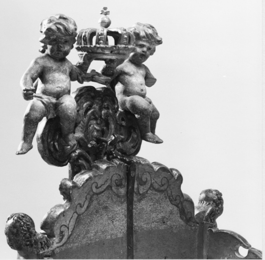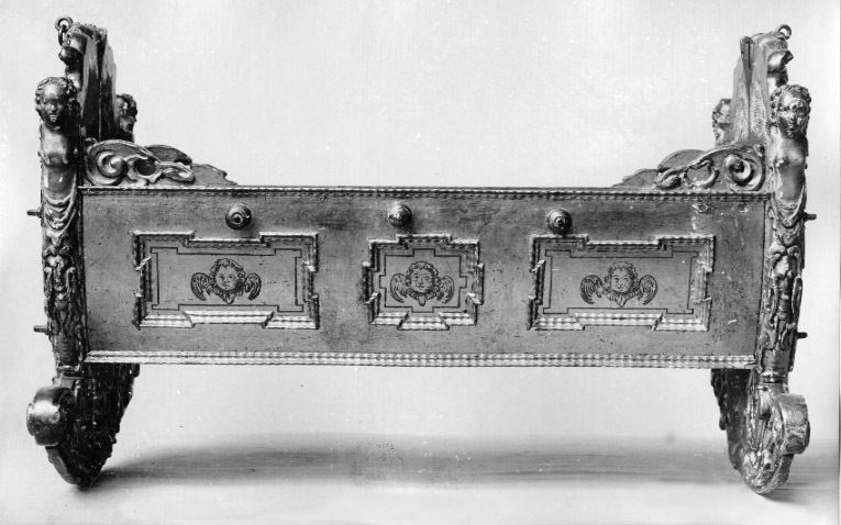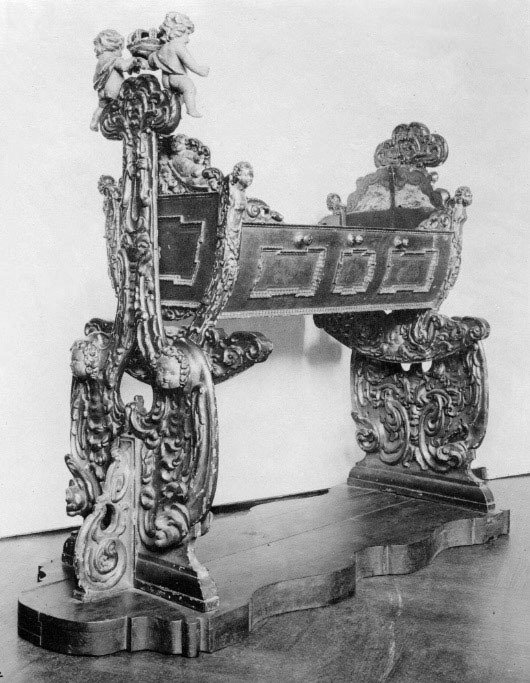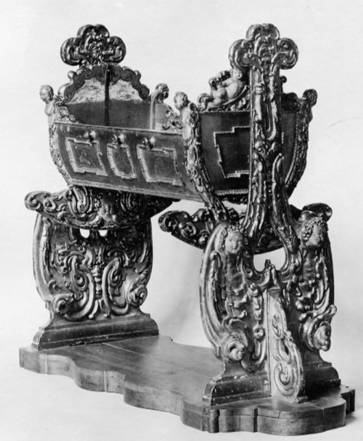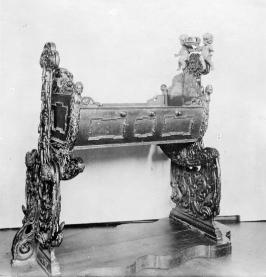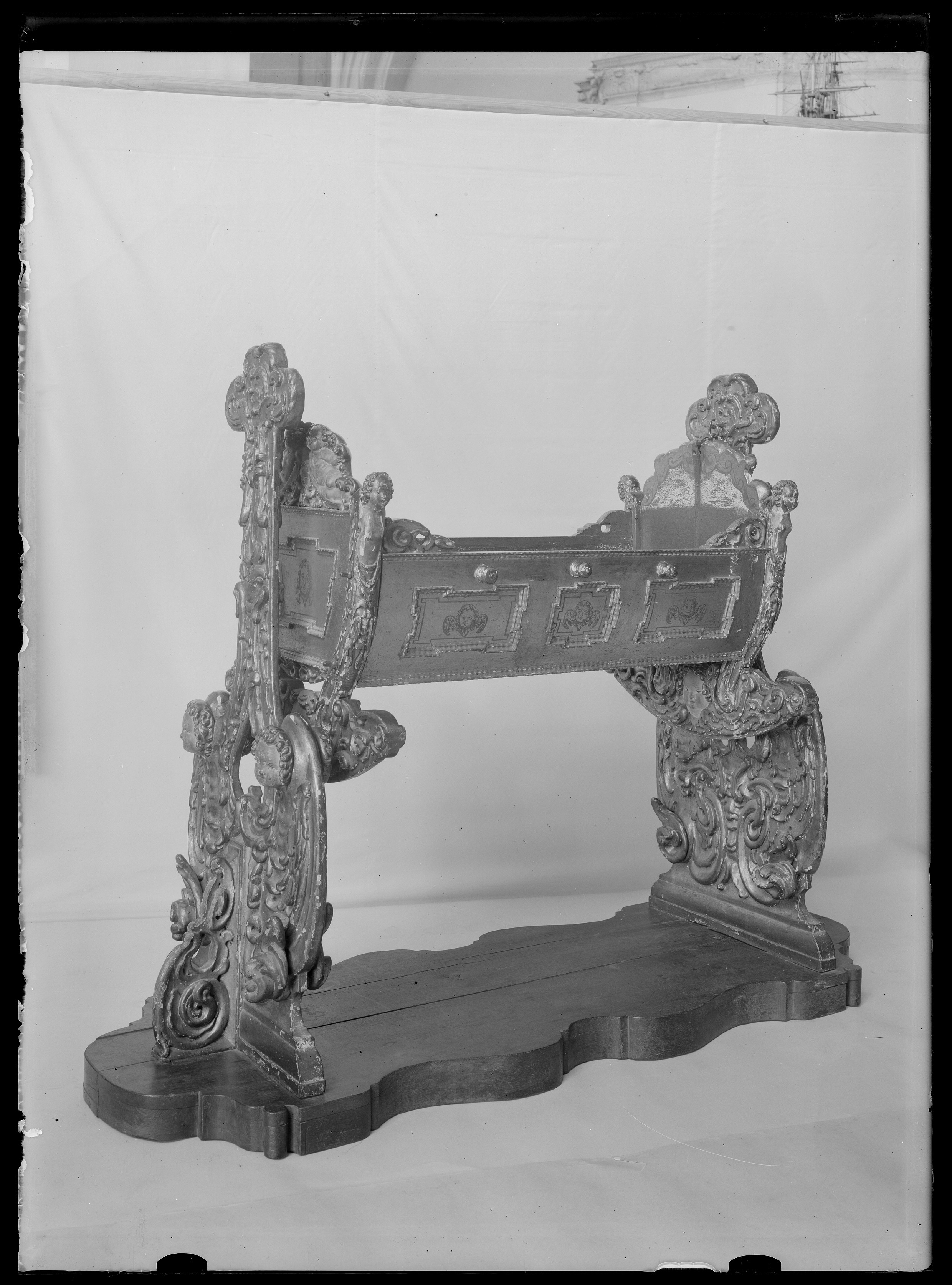 Karl XI:s förgyllda vagga har sedan mitten av 1600-talet fungerat som kungahusets ceremoniella paradvagga. Vaggan har använts vid kungliga dop och är det enda av Livrustkammarens föremål som fortfarande kan sägas vara i bruk. Detta skedde senast den 22 maj 2012 när prinsessan Estelle döptes - den första prinsessan som är född till tronarvinge. Vaggan var ursprungligen en gåva till drottning Hedvig Eleonora till sonen Karls dop den 9 december 1655 av hennes föräldrar, hertig Fredrik III av Holstein-Gottorp och Maria Elisabeth av Sachsen. Liknande vaggor skänkte hertigparet även till sina äldre döttrar och deras förstfödda barn. Barnsängen, eller vaggan av skulpterat, förgyllt och målat trä består av en vaggsäng, hängande mellan stolpar på en sockel. Plan, profilerad och målad sockel, som ursprungligen (inv.1691) varit överklädd med röd sammet. Vaggsängen har förgyllda och skulpterade gavlar med ramar och tvärställda medar, överst på vardera gaveln en ring, som fästs på krok på stolparnas övre del. Den skulpterade dekoren består av broskornamentik med änglahuvuden mitt på medarna mindre änglahuvuden vid gavelhörnen samt motställda, vilande putti som krön. Plana lång- och kortsidor. På kortsidorna ett i svart och rött målat putti-huvud omramade av brutna ramar med hopplist. Tre träknoppar. Sängen invändigt rödmålad, bottnen lös, spår av svart färg runt kanten. De två stolparna är bredare nedtill, med omvänt hjärtformigt urtag, flankerat av putti-huvuden. Smal övre del med droppformigt urtag, 3-passformat krön. På utsidan vid stolparnas bas ett stöd. Ena stolpen kröns av två putti, hållande en kungakrona, som har 7 små hål i kronringen. Vaggan är använd vid dop av prinsar inom det svenska kungahuset, senast H. K. H. Prins Carl Philip 1979 (lån 79:6) och den 22 maj 2012 när prinsessan Estelle döptes (lån 2012:02) - . (Från Gustav III:s dop och fram till att man vid prinsessan Eugénies dop initierade en ny tradition med en särskild dopvagga för prinsessor användes Karl XI:s dopvagga för både prinsar och prinsessor). Se Rangström (2011), s. 38. Enl. inv. 1867 deponerad i St. historiska museum 1868, återlämnad jäml. k. brev 1887-06-17.