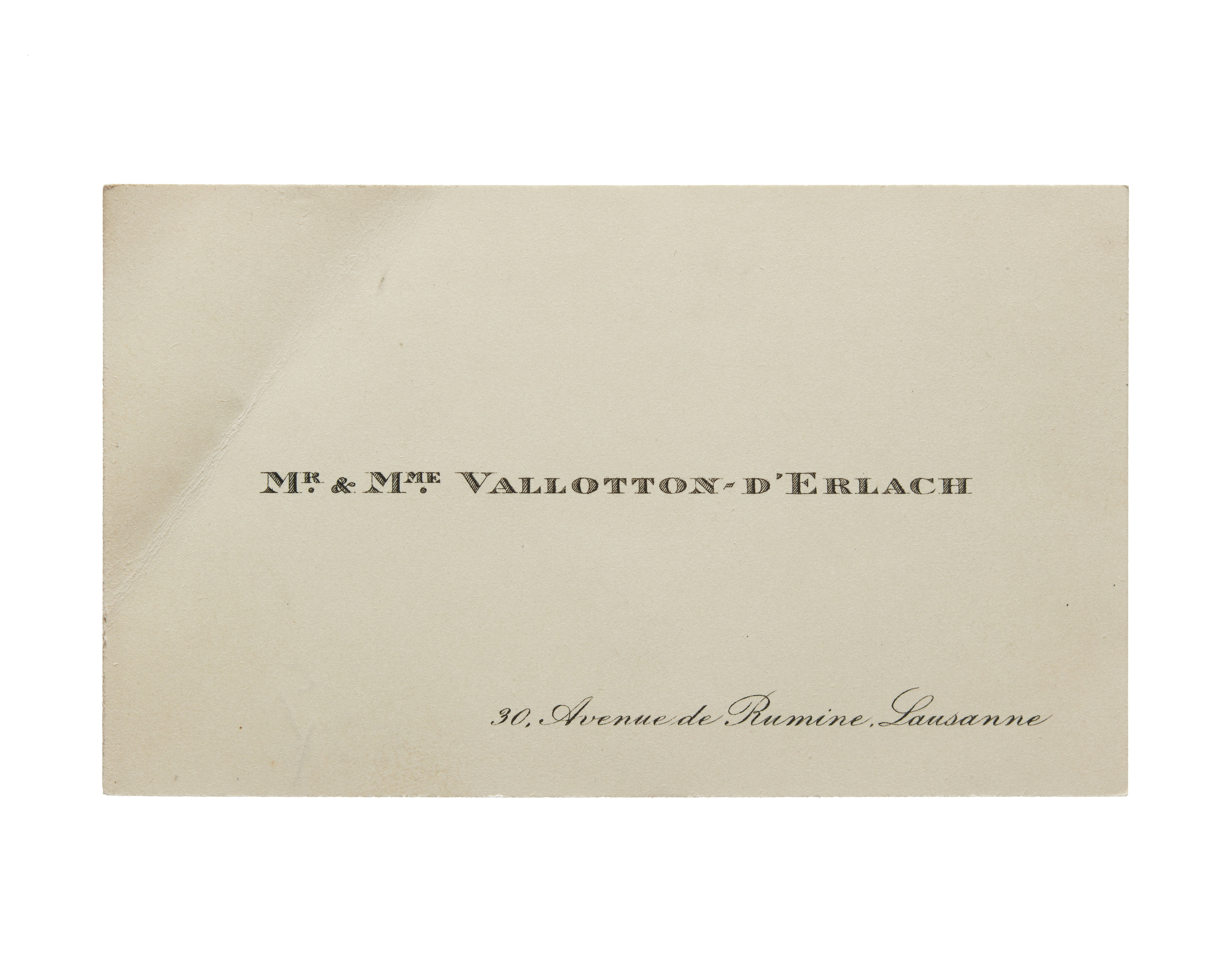 Ett visitkort från Mr & Mme Vallotton-d'Erlach, utan datum, vikt i övre vänstra hörnet. Adress (nedre högra hörnet) 30 Avenue de Rumine, Lausanne.