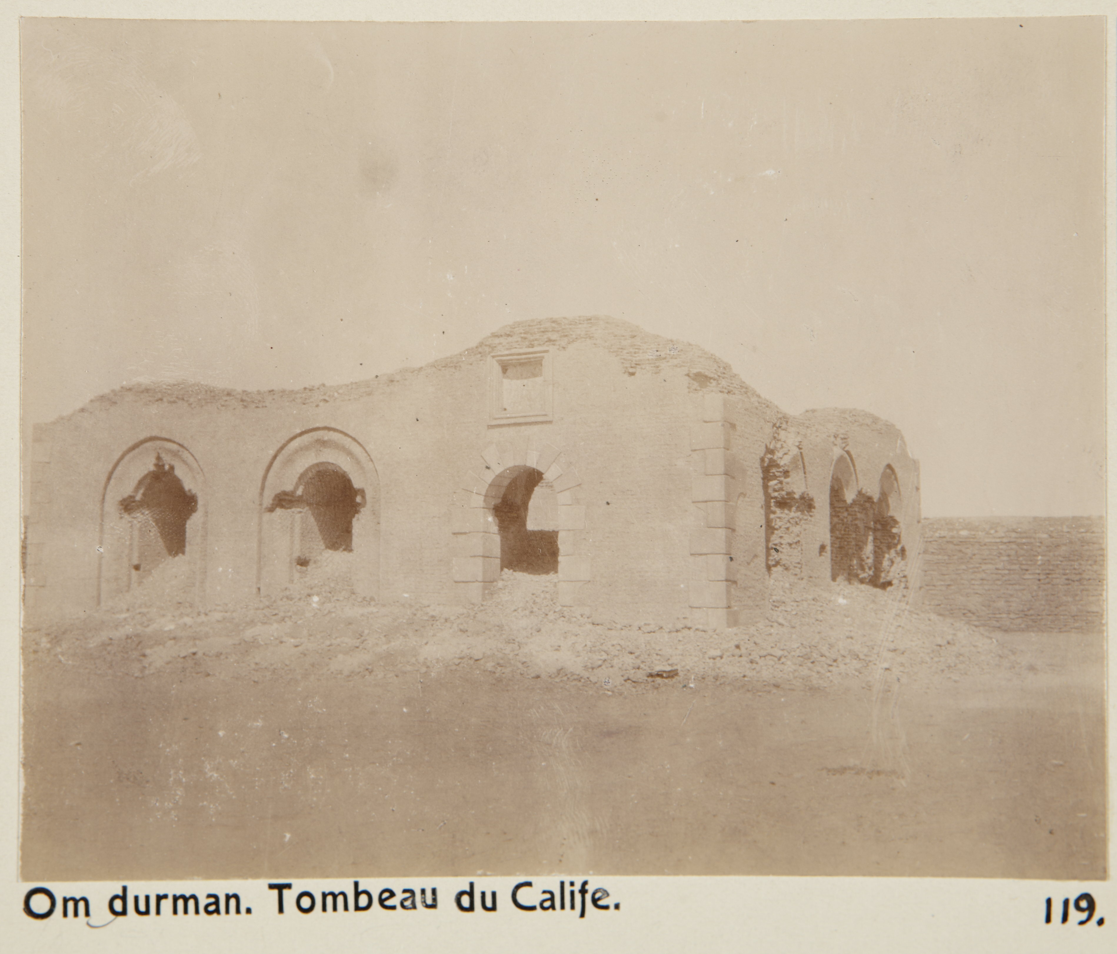 Kalifens grav. Omdurman, Sudan. Text på fotografiet: Omdurman, Tombeau du Calife Fotografierna LXVI:M.01.- 201. kommer från resan till Egypten och Sudan som Wilhelmina och Walther von Hallwyl gjorde vintern 1900-1901. De lämnade Sverige den 5 november 1900 och fortsatte från Egypten till Palestina den 28 mars 1901. Med på resan var döttrarna Ellen med maken Henric de Maré och Irma med maken Wilhelm von Geijer. Wilhelminas sällskapsdam, fröken Ida Uhse reste också med. Under en del av resan anslöt sig ledamoten av Internationella domstolen i Kairo, assessorn Otto Conrad Waldemar Cedercrantz med makan Anna Elisabeth. Vid resan uppför Nilen hade Walther von Hallwyl hyrt ångfartyget Columbia med besättning. Båtresan startade i Kairo 27 december 1900, gick ända till Wadi Halfa varifrån man reste vidare med tåg till Khartum och tillbaka till Wadi Halfa. Båten vände åter i riktning mot Kairo, men det verkar som att sällskapet tog tåg sista biten, från Luxor. Henric och Ellen de Maré samt fru Cedercrantz lämnade båten redan då de passerade Luxor första gången. Resten av sällskapet återvände till Kairo den 1 mars. Fotografierna LXVI:M.01.-120. togs av resenärerna själva, de största av Ellen de Maré, de mellersta av Wilhelmina von Hallwyl och de minsta av Wilhelm von Geijer. Resten köptes av professionella fotografer i Kairo, de flesta från Studio Photogr. Artistique G. Lekegian & Cie. Alla uppgifter kommer från Ida Uhses reseanteckningar.