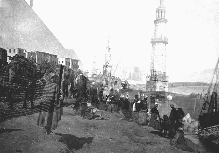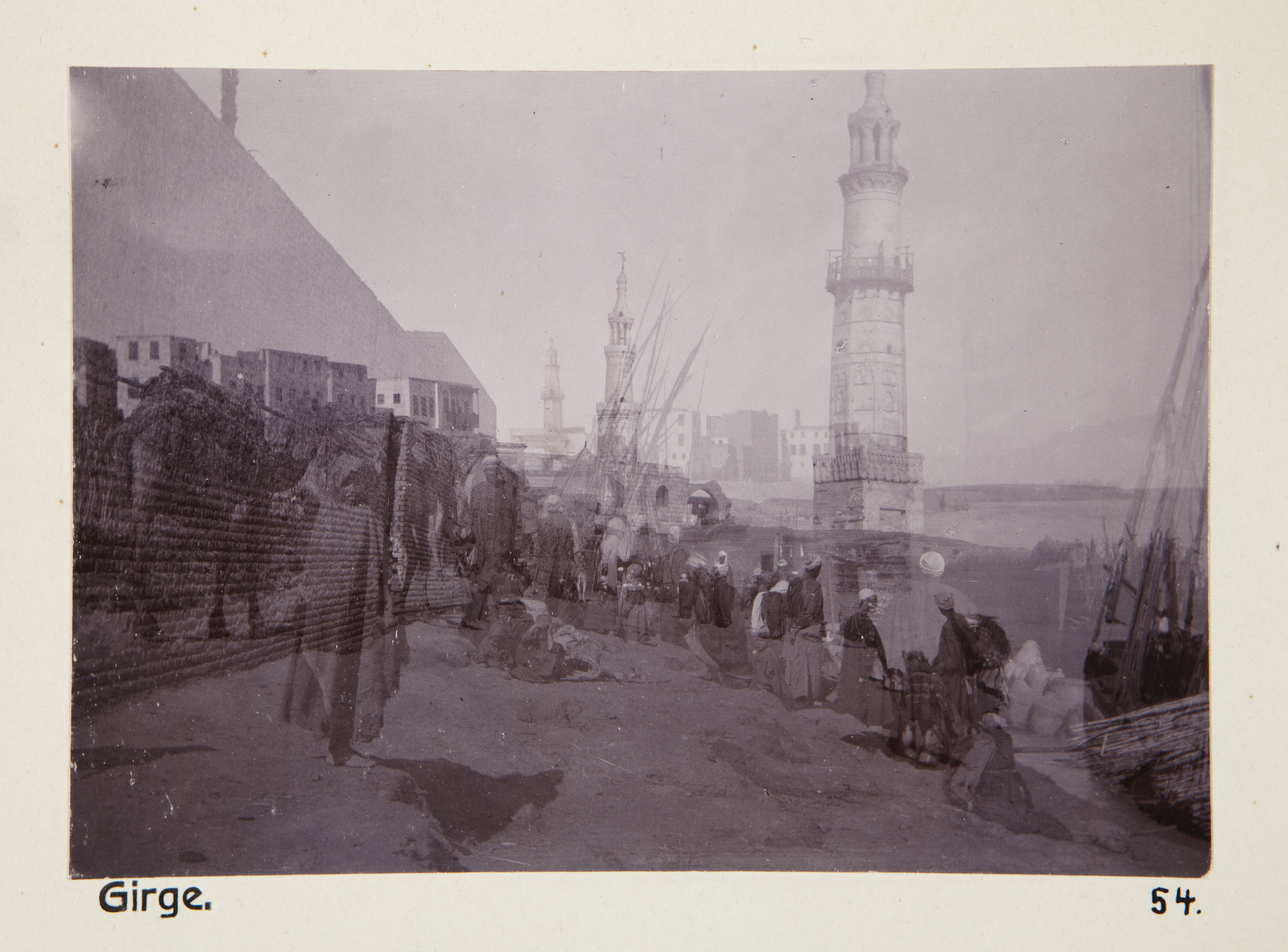 Jirja, Egypten. Text på fotografiet: Girge. Fotografierna LXVI:M.01.- 201. kommer från resan till Egypten och Sudan som Wilhelmina och Walther von Hallwyl gjorde vintern 1900-1901. De lämnade Sverige den 5 november 1900 och fortsatte från Egypten till Palestina den 28 mars 1901. Med på resan var döttrarna Ellen med maken Henric de Maré och Irma med maken Wilhelm von Geijer. Wilhelminas sällskapsdam, fröken Ida Uhse reste också med. Under en del av resan anslöt sig ledamoten av Internationella domstolen i Kairo, assessorn Otto Conrad Waldemar Cedercrantz med makan Anna Elisabeth. Vid resan uppför Nilen hade Walther von Hallwyl hyrt ångfartyget Columbia med besättning. Båtresan startade i Kairo 27 december 1900, gick ända till Wadi Halfa varifrån man reste vidare med tåg till Khartum och tillbaka till Wadi Halfa. Båten vände åter i riktning mot Kairo, men det verkar som att sällskapet tog tåg sista biten, från Luxor. Henric och Ellen de Maré samt fru Cedercrantz lämnade båten redan då de passerade Luxor första gången. Resten av sällskapet återvände till Kairo den 1 mars. Fotografierna LXVI:M.01.-120. togs av resenärerna själva, de största av Ellen de Maré, de mellersta av Wilhelmina von Hallwyl och de minsta av Wilhelm von Geijer. Resten köptes av professionella fotografer i Kairo, de flesta från Studio Photogr. Artistique G. Lekegian & Cie. Alla uppgifter kommer från Ida Uhses reseanteckningar.