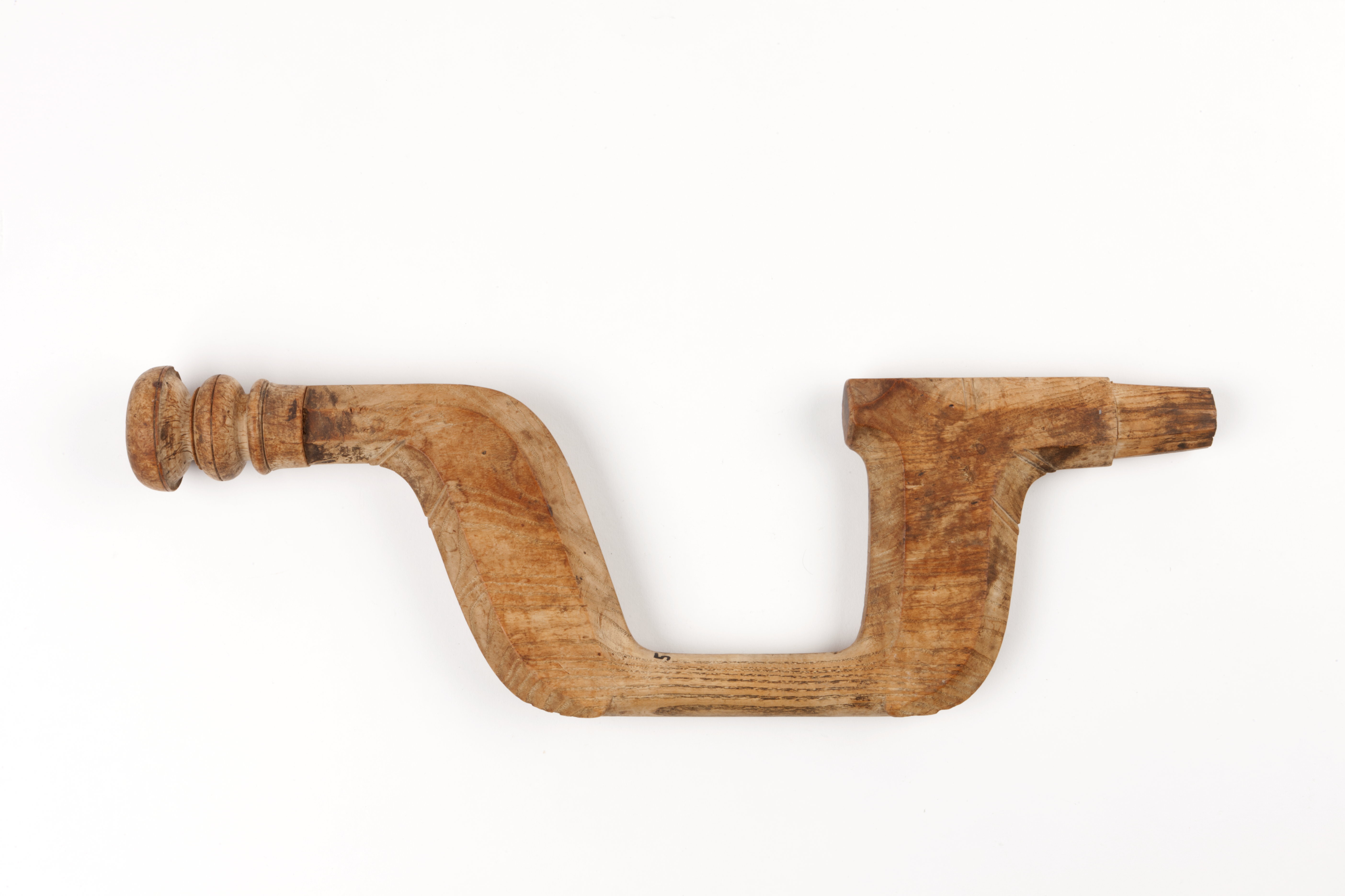 Skedborr med hållare. Avsmalnande nedåt, i en svarvad, fast hållare av ebenholts med en tolvpassformig genomskärning. Stämpel på borren: "O".
