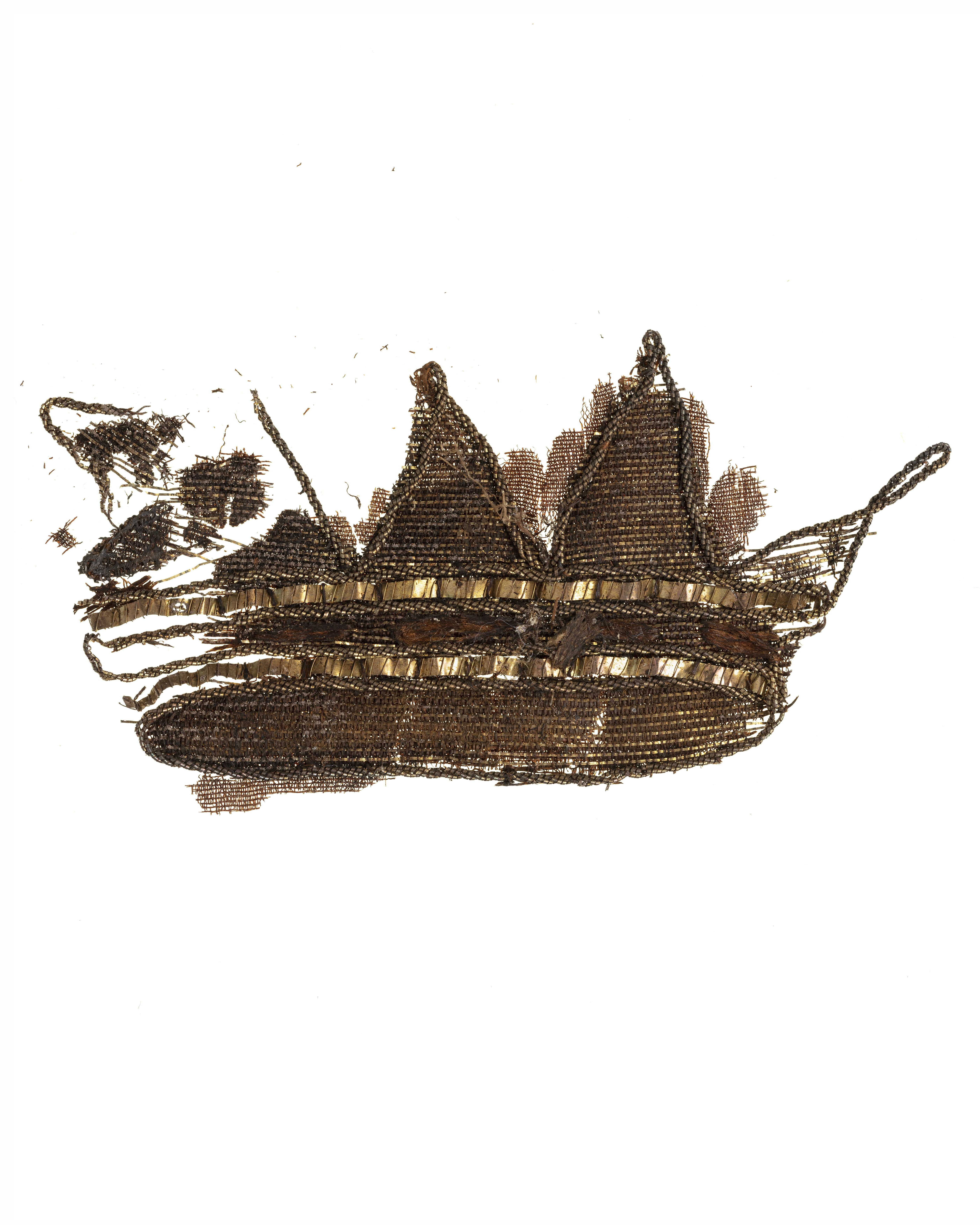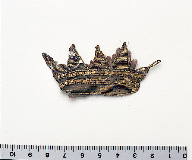 Fragment av siden i varprips med applicerad vävd och broderad femuddig krona. Kronan är klippt ur en väv av silke och guldlan. Kronans hjässband har detaljer av påsydda, veckade förgyllda guldlan samt broderier av grovt silke. Kronans konturer samt de veckade guldlanen kantas av en applicerad guldsnodd. De ursprungliga färgerna delvis förändrade, fragmentet numera i brunt och guld. De två vänstra uddarna är skadade och den längst til höger, snodden på den längst till höger är vriden. Kronan ursprungligen applicerad på manteln, troligen fastklistrad. Fragmentet ingår i en samling fragment tagna som prov ur drottning Kristinas kista vid gravöppningen den 13-14 december 1965. Mantel Varprips: Varp: 2-trådigt löst spunnet silke i svag s-snodd. Trådtäthet: 75 varptrådar/cm. Inslag: 2-trådigt löst spunnet silke i svag s-snodd. Trådtäthet: 35 inslag/cm. Material: Silke. Teknik: Varprips, franska: gros de Tours. Kommentar: Inslaget är grövre än varpen. Nuvarande färg är brun Kronans väv: Mått: b: 69 mm, h: 32 mm. Varp: Knippen av parallellt liggande fibrer. Trådtäthet: 80 trådar/cm. Inslag: Vartannat inslag är silke vartannat är ett lan. Silke av parallellt liggande fibrer. Lanet består av förgyllt silver med förgyllning på båda sidor. Guldskiktet är <0,1 um och något förorenat av klor. Trådtäthet: 40 inslag/cm. Material: Silke och förgyllt silver. Teknik: Tuskaft. Kommentar: Inslaget är grövre än varpen. Snodden runt kronan består av 3 st snoddar av spiralvridna guldlan vridna runt en silkekärna. Snodden är fastsydd på kronan med 2-trådigt silke, spunnet i z-snodd och tvinnat i s-snodd. Lanet består av silver, förgyllt på båda sidorna. Guldskikt <0,1 um. Tjocklek 0,01 mm. Litet klor på ytan. De veckade lanen på hjässbandet består av förgyllt silver. Guldförgyllningens tjocklek är <0,3 um. Tjocklek 0,05 mm. Lanen är fastsydda med 2-trådigt spunnet i z-snodd och tvinnat i s-snodd. Metalltråden som är virat runt de veckade lanen består av förgyllt silver med spår av klor på ytan. Förgyllningsskiktet <0,6 um. Diameter ca 0,07 mm. Broderiet på hjässbandet är sytt i grovt silke med långa stygn som bildar fem partier.